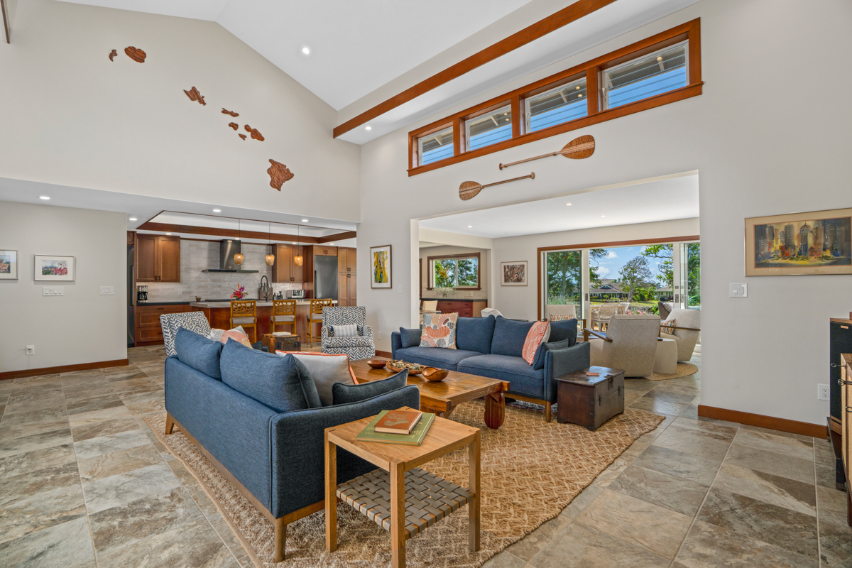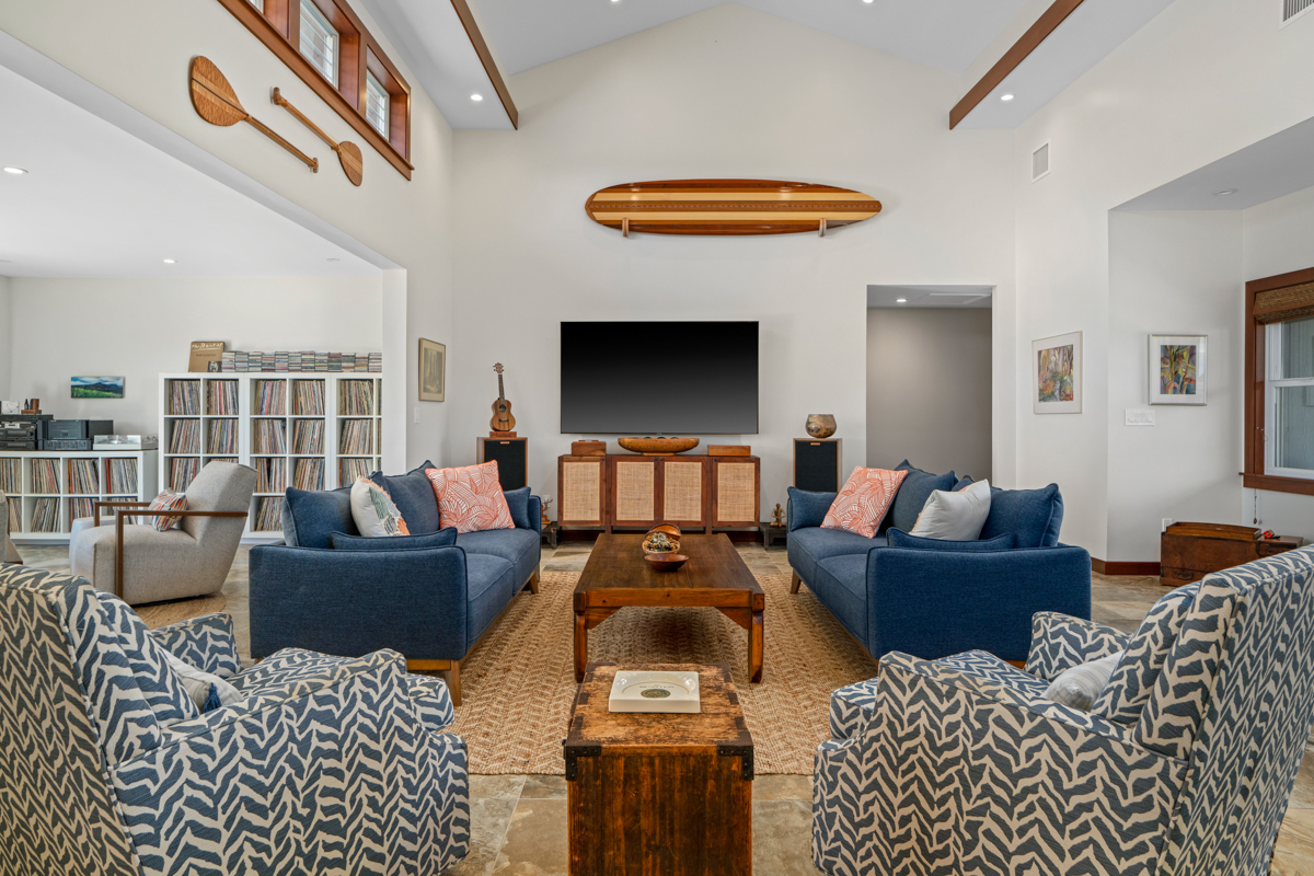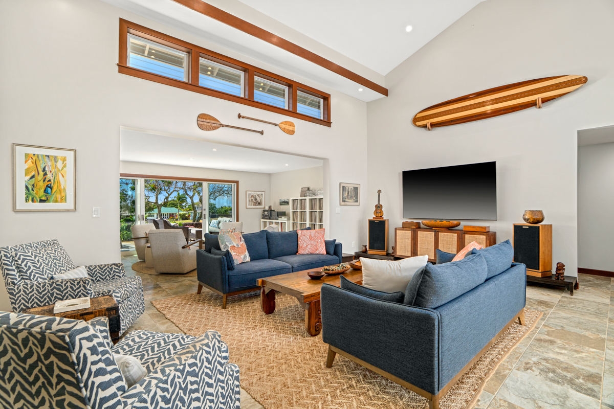 Step through the double door entry into the great room where crisp white walls, vaulted ceilings, wood trim and professionally designed interiors align to create a warm and most inviting property. With two seating areas in the great room, as well as dining options inside and out, the single level elevated island home is your optimal place to entertain, gather and enjoy the serene environment.