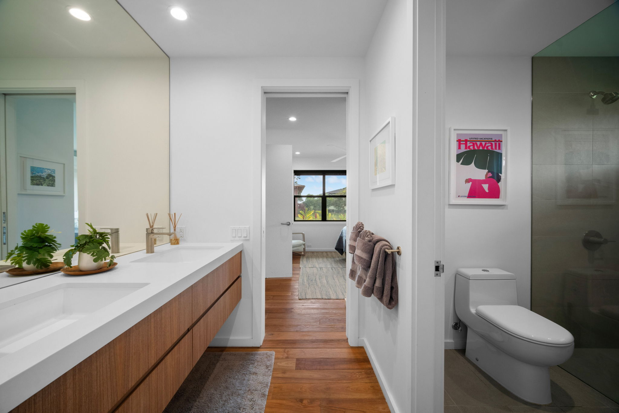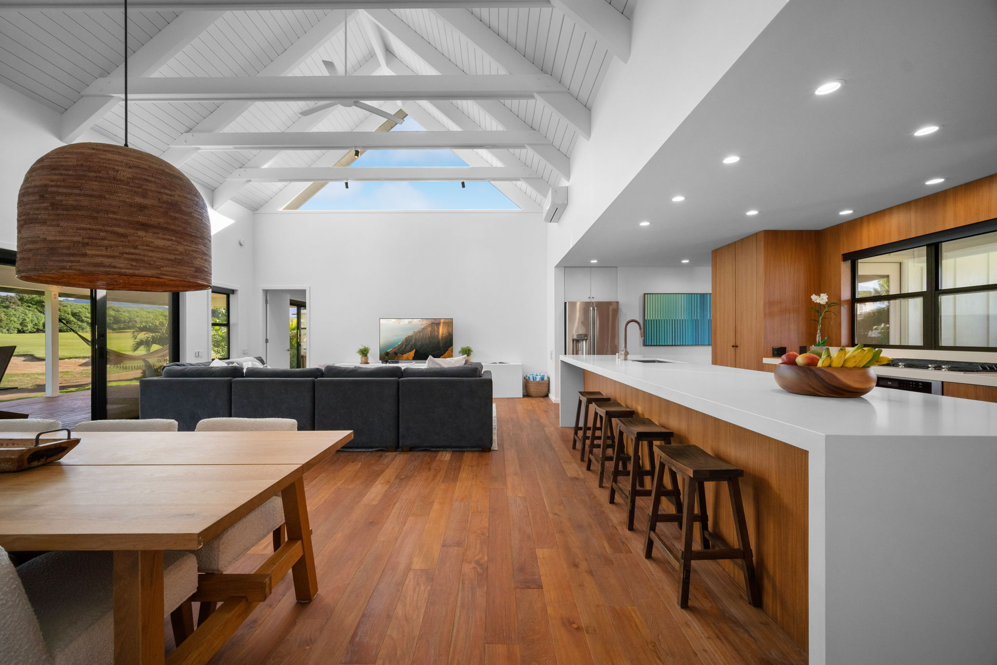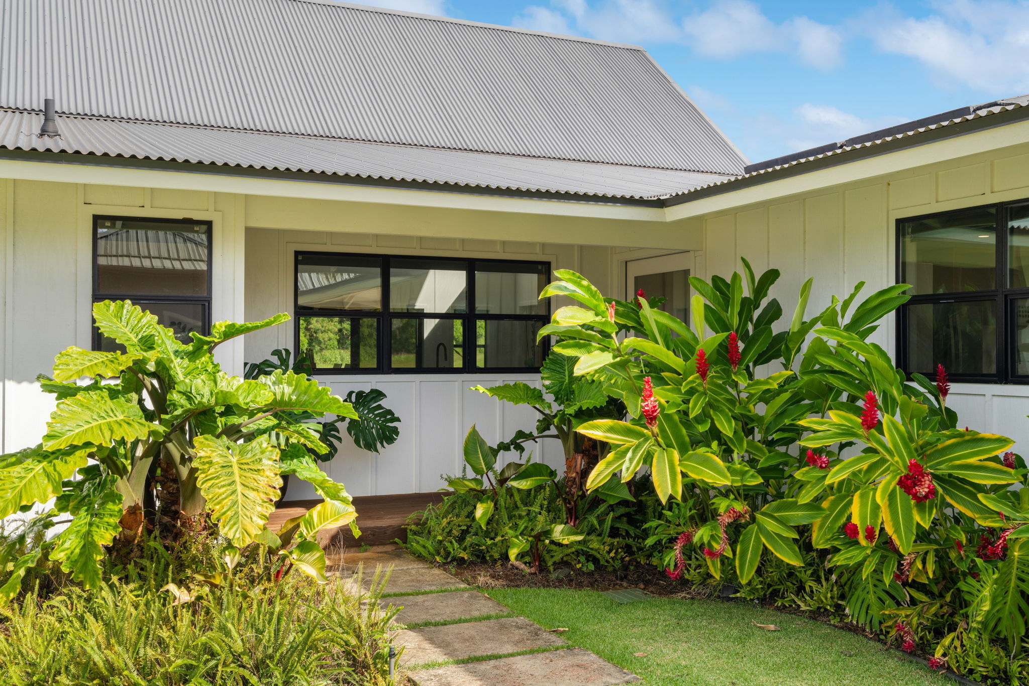 Modern Hawaiian Plantation style residence completed in 2022 and designed by the owner-architects with an emphasis on luxury island living. This 3-bedroom, 2.5-bath home offers a sophisticated open layout enhanced by abundant natural light, natural ventilation, and air conditioning in every room. The vaulted ceiling and expansive gable window define the main living area, creating a bright, airy environment and a relaxing space to gaze at the moon and stars in the evening. Interior selections feature teak-engineered wood flooring throughout, paired with custom teak-finished cabinetry that brings warmth and craftsmanship to the kitchen and bathrooms. Modern appliances and curated lighting complement the home’s clean, contemporary aesthetic. An approximately 840 sq. ft. covered lanai extends the living experience outdoors, offering a generous setting for dining, relaxation, and year-round enjoyment. From the lanai, enjoy the lush greens of golf course and views of Haupu mountain. The lanai also provides potential for future enclosure, subject to county requirements and buyer due diligence. Additional features include: - Strong performing vacation rental helps offset expenses - Turn-key offering with furnishings and equipment included - Well-maintained newer construction - Previously approved pool plans (buyer to verify resubmittal options) - Irrigation water included in HOA fees Convenient location near Poipu's iconic beaches, world renowned golf courses, upscale dining, and plenty of recreation. This thoughtfully designed home offers a rare combination of modern comfort, architectural detail, and indoor-outdoor living in one of Poipu’s most sought-after areas. A compelling opportunity for those seeking a well-appointed residence with established rental use. For more photos, go to: https://bit.ly/2944KolepaSt_MLS