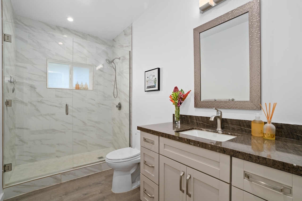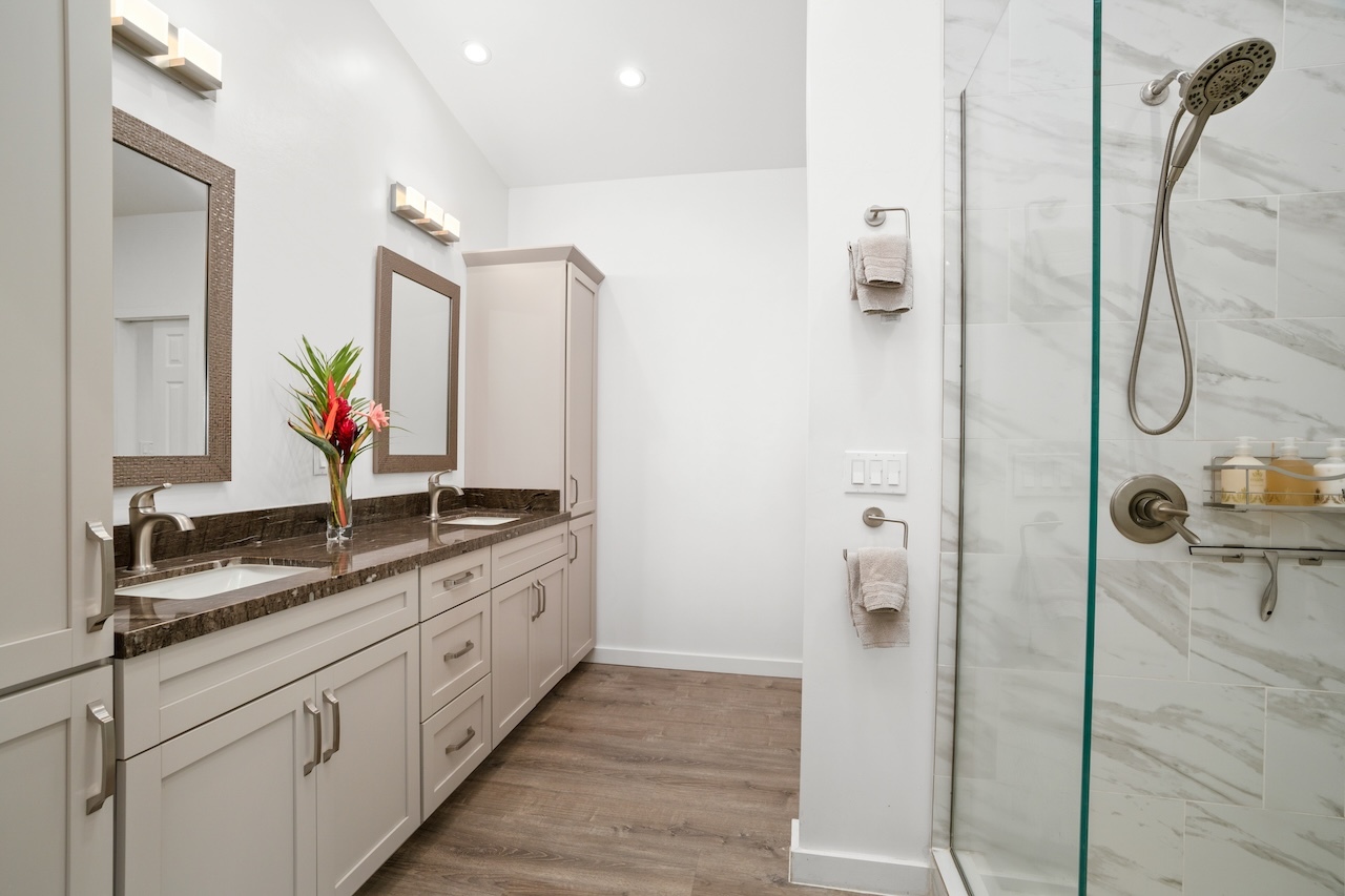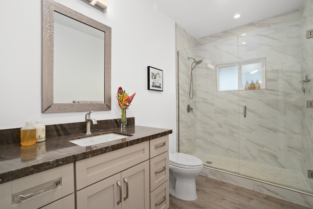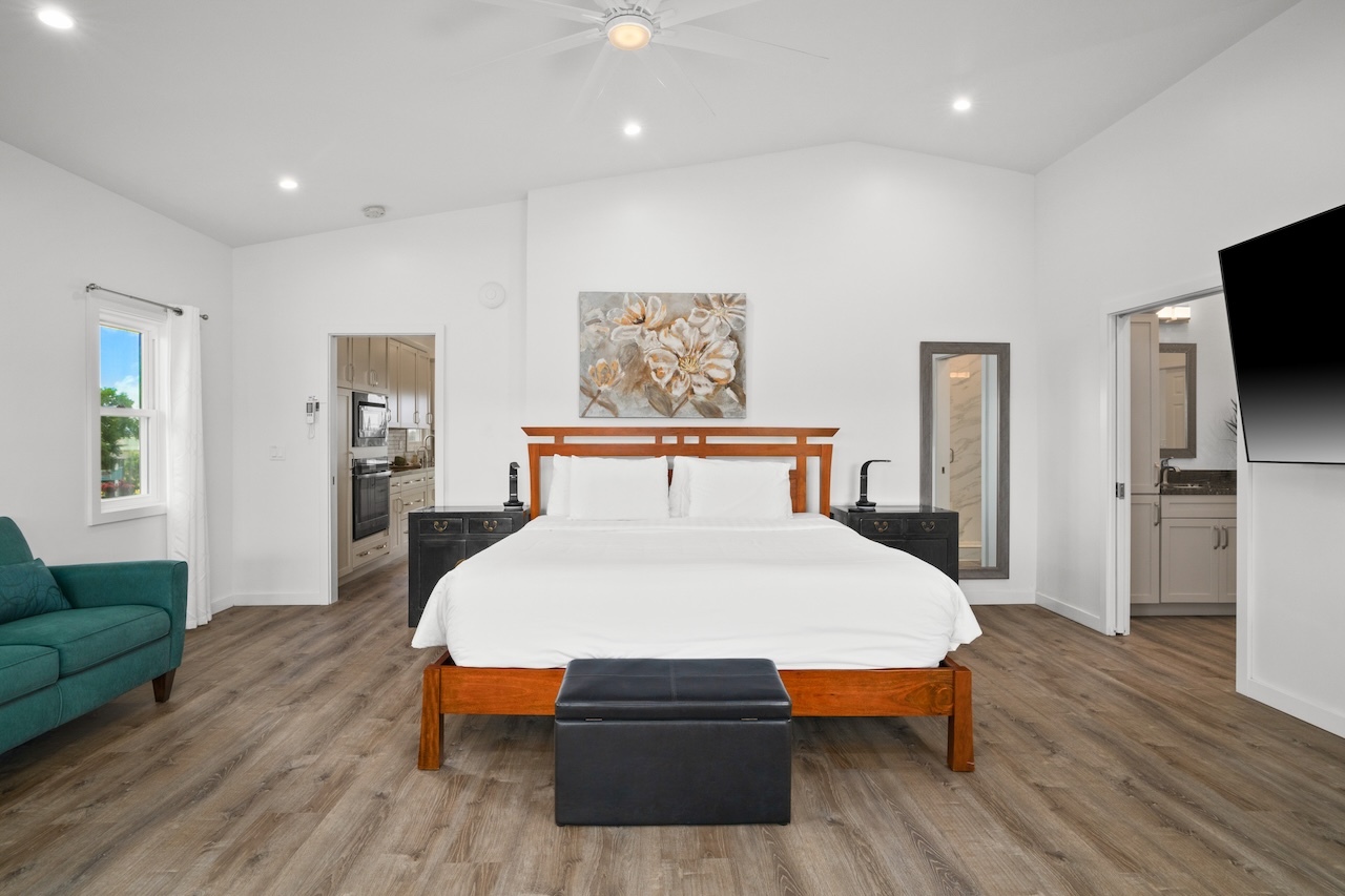 The open-concept floor plan maximizes natural light and trade-wind flow with AC in every room to insure comfort year-round. Vaulted ceilings and wide glass sliders create a seamless transition between indoor and outdoor living areas. The gourmet kitchen is spacious and bright with a large central island, induction cooktop, Cygnus granite countertops, and Thomasville cabinetry–perfect for entertaining or relaxing at home.