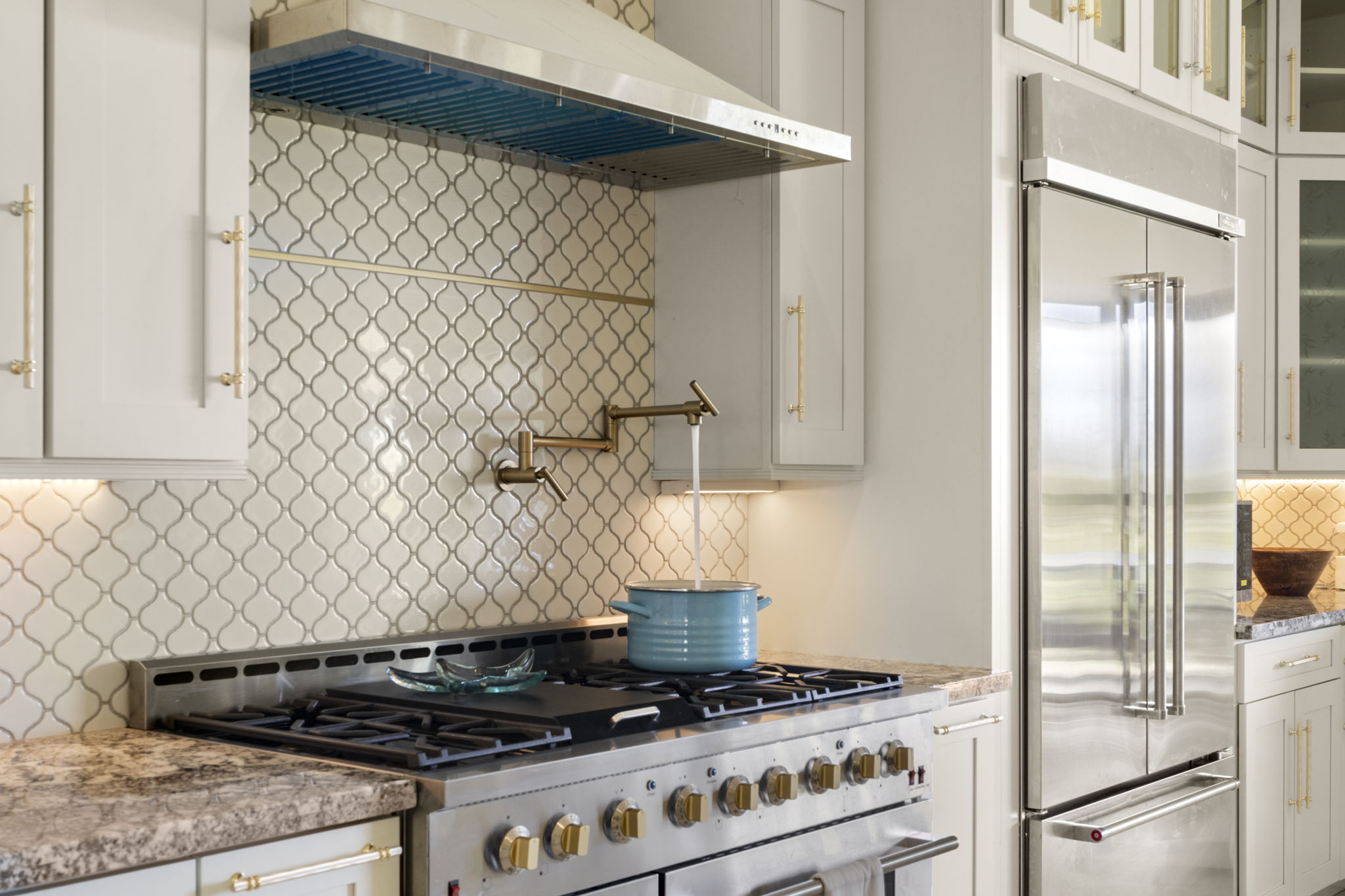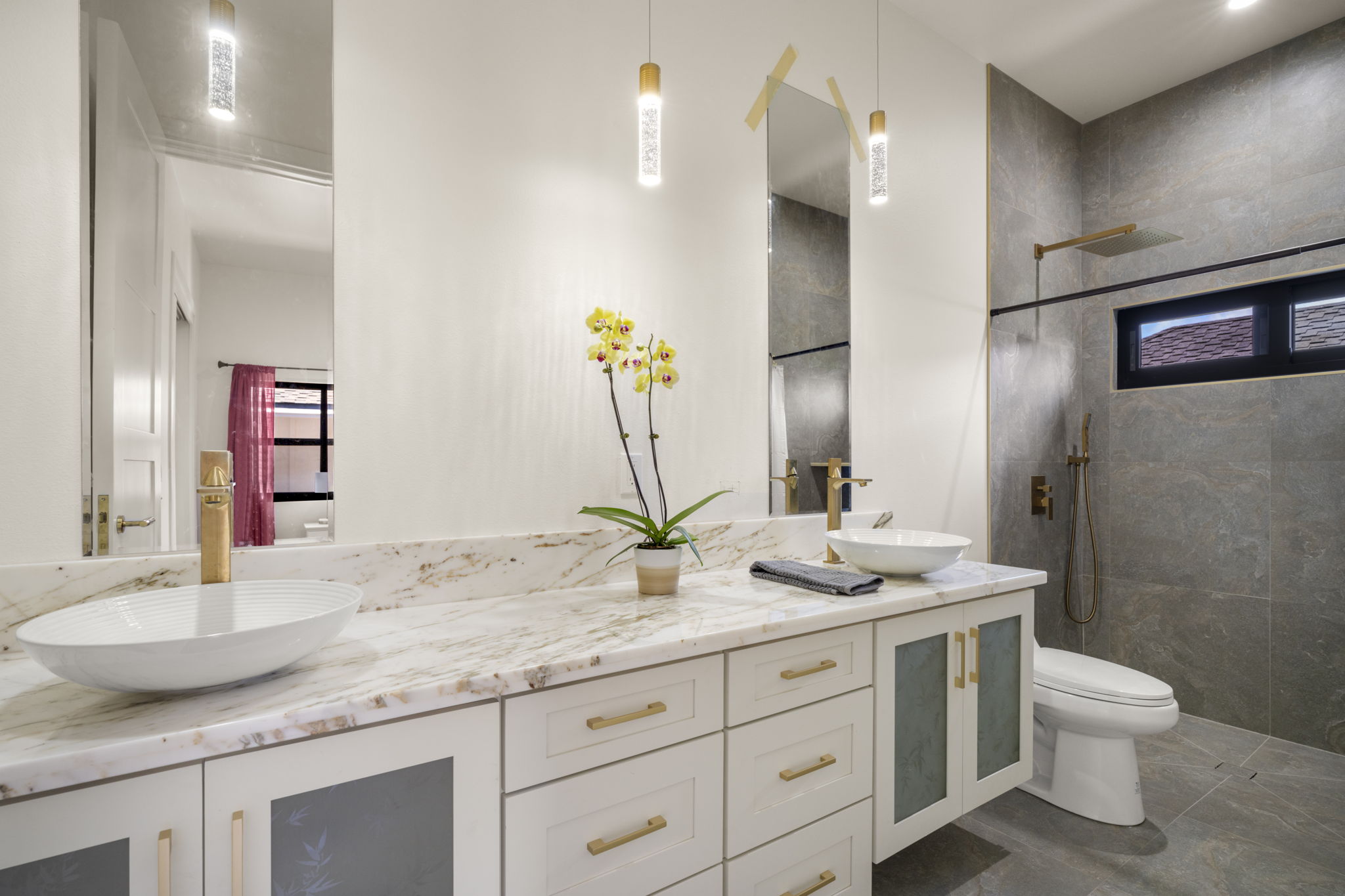 Luxury Interior: Quartzite countertops, waterfall-edge island, premium appliances, 6-burner gas cook top, pot filler, wet bar, dry bar, built-in sound system, porcelain tile flooring and soaring 11' ceilings.
