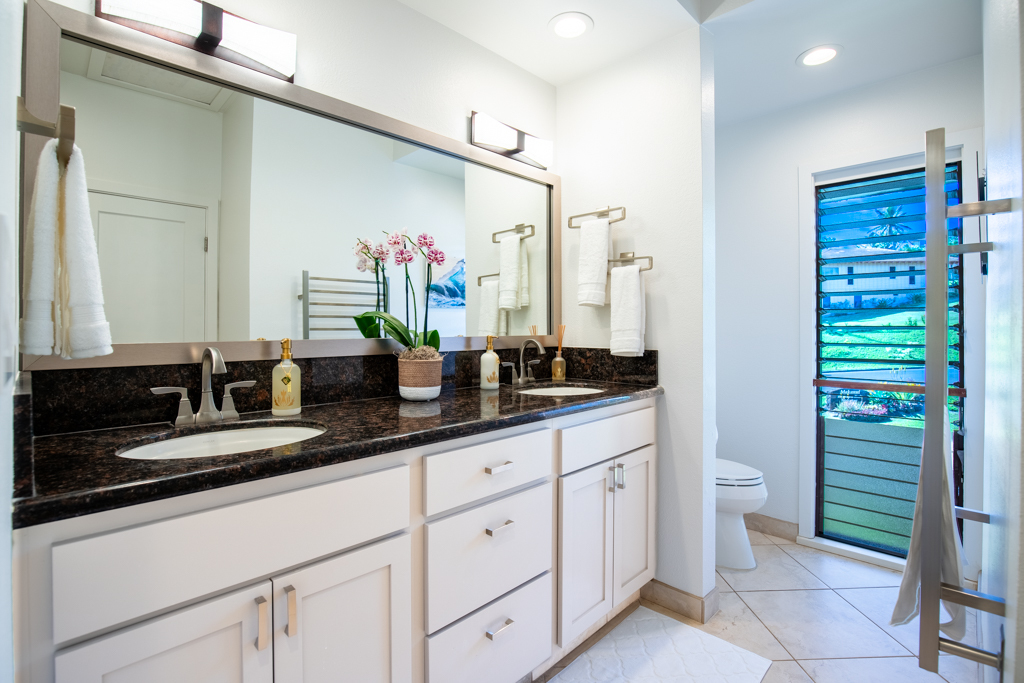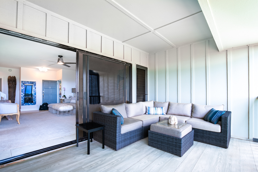 Inside the unit, thoughtful updates bring modern design to island living. The chef’s kitchen with Bosch appliances and quartz countertops opens to the main level living area, which flows seamlessly onto a spacious lanai perfect for outdoor dining or relaxing. The primary suite, located on the upper level, features huge vaulted ceilings, a private lanai, and a newly remodeled bathroom with updated flooring, a separate vanity, and a custom wood dresser. The home also includes ample owner storage, ideal for keeping personal items secure between visits.