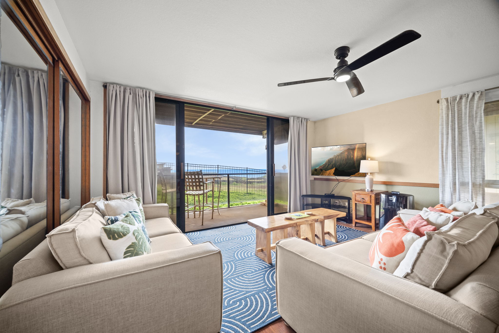 Desirable 2-bedroom, 2-bath corner unit in the sought-after Makahuena community, offering beautiful ocean views. Located on Kauai’s sunny south shore, this east-facing condo is perfectly positioned to enjoy stunning sunrises and refreshing trade winds. The open-concept kitchen features African mahogany soft-close cabinetry, granite countertops, stainless steel appliances, and upgraded lighting fixtures. Both bathrooms have been tastefully renovated with designer tile showers and custom African mahogany cabinetry that complements the kitchen. Ideally situated near some of Kauai’s most stunning beaches, including Shipwreck’s Beach, Brennecke’s Beach, and the highly rated Poipu Beach. Fine dining and shopping are just minutes away. This condo is being sold fully furnished and turnkey making it ideal as a primary residence, vacation home, or to continue as a successful vacation rental.