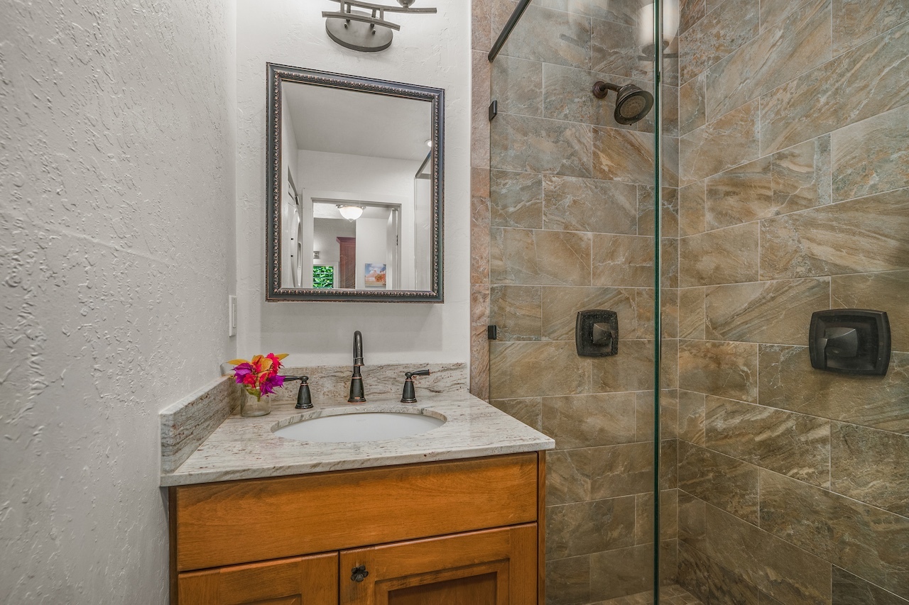 Set within Poipu Crater Resort, a low-density community of 15 duplexes on 7.5 acres, the property offers a tropical setting reminiscent of a botanical garden. The unit’s location provides quiet privacy, a dedicated parking space near the entry, and the convenience of no stairs with no one living above or below.