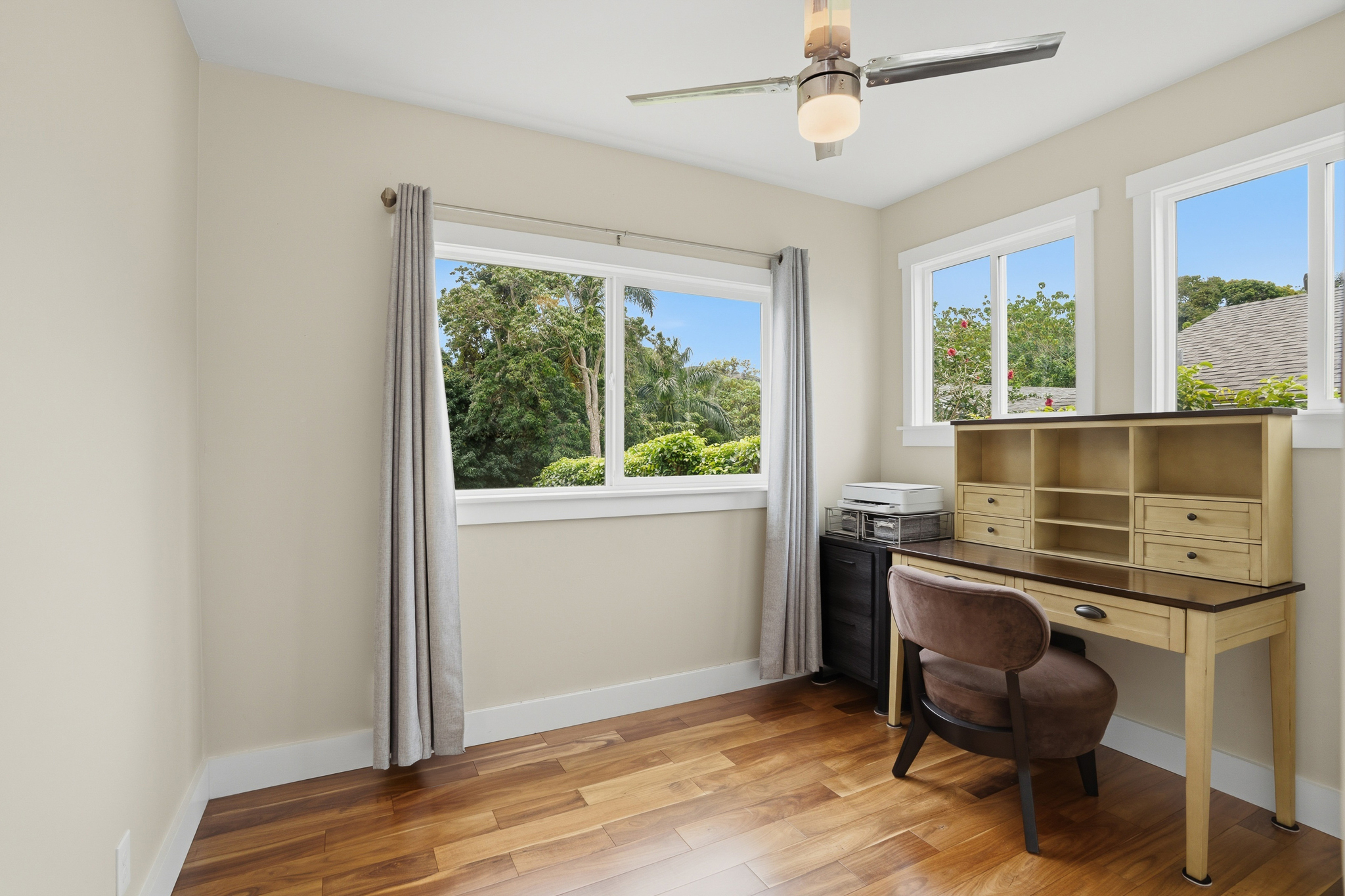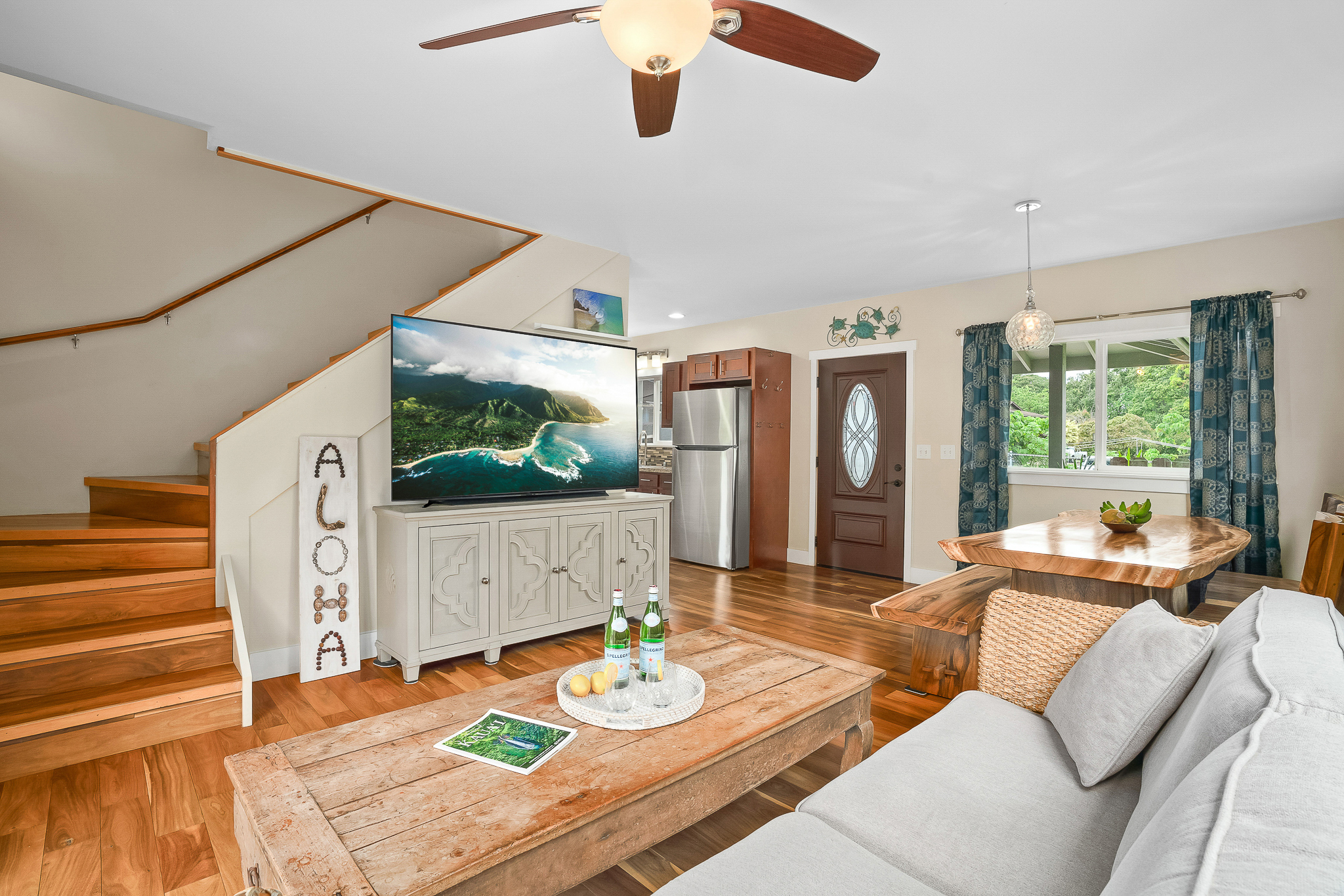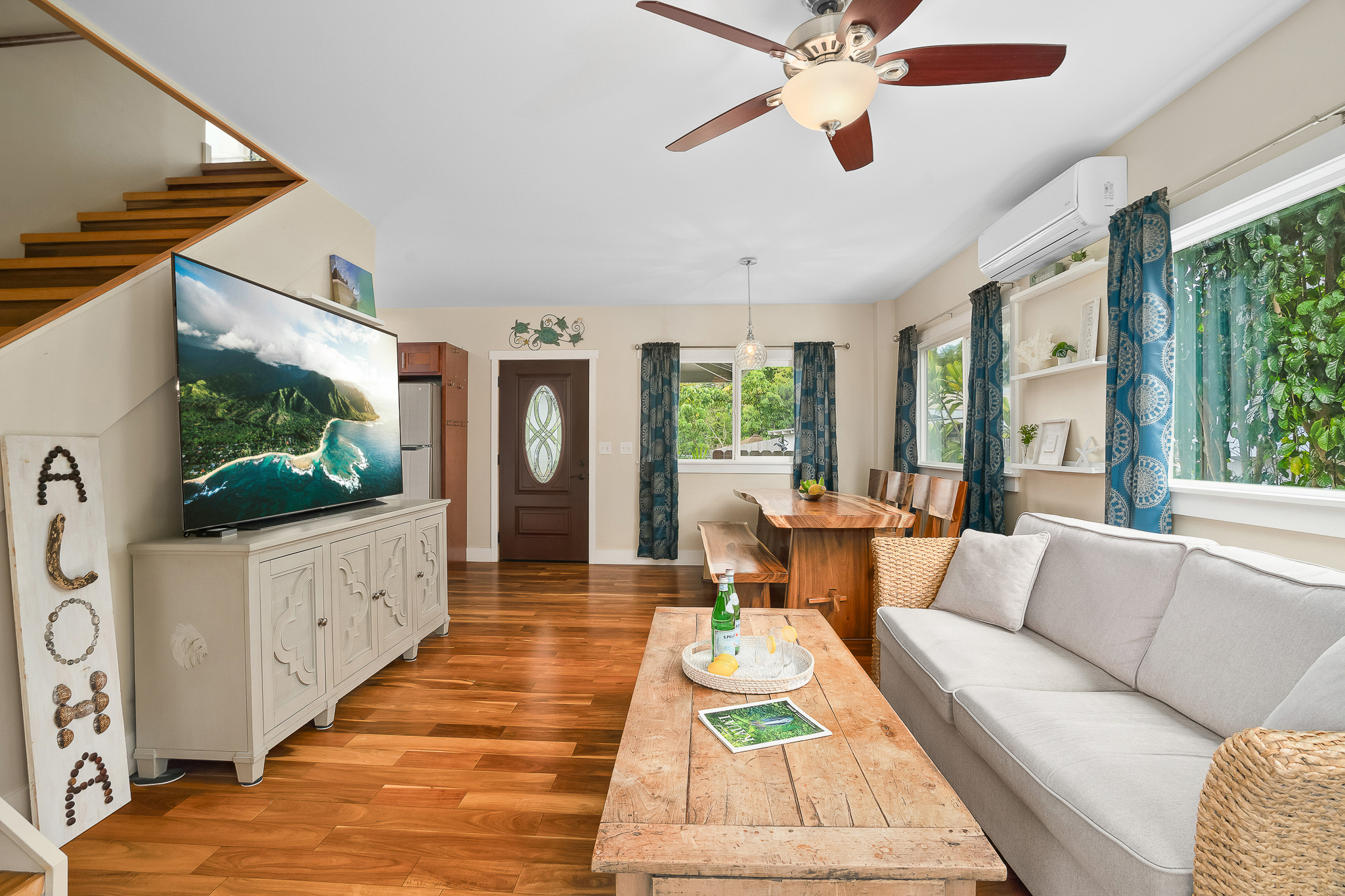 METICULOUSLY MAINTAINED - MOVE-IN-READY — NEWER LIHUE HOME — MUST SEE! Nestled along a peaceful lane in the heart of Lihue, this two-story residence offers privacy, flexibility, and exceptional convenience. Built in 2016 on a generous 10,788 sq ft lot with Nawiliwili Stream peacefully flowing through the rear of the property, the setting feels lush, private, and uniquely special. Included with the sale are plans for a future 2-bedroom ADU, creating valuable additional potential. A 5-bedroom capacity septic system is already in place. The home features an open-concept living, dining, and kitchen layout with warm wood flooring, granite countertops, stainless steel appliances, and abundant natural light. Elevated ceilings enhance the sense of space, while split-system air conditioning provides year-round comfort. Highlights include: - 3 bedrooms / 2 bathrooms - Approx. 1,120 sq ft interior living area - Hardwood flooring in living spaces - Granite countertops - Stainless steel appliances - Indoor laundry area - On-demand hot water heater - Three split-system AC units installed in 2021 - Exterior paint and caulking refreshed in 2021 - New front entry door installed in 2021 Outdoor features include 10-foot-wide gated rear-yard access, storage shed, under-home storage, and a vibrant botanical retreat enhanced by tranquil stream-side surroundings. Mature tropical landscaping includes a variety of fruit-bearing trees, flowering gardens, and lush greenery with lychee, mango, avocado, banana, pineapple, citrus, coffee, starfruit, taro, herbs, and more, creating an inviting space for those who appreciate gardening, outdoor living, and harvesting from their own backyard. Conveniently located near Rice Street dining, shopping, schools, county offices, Costco, and Lihue Airport, this truly is a great opportunity to own a move-in ready property in Lihue.