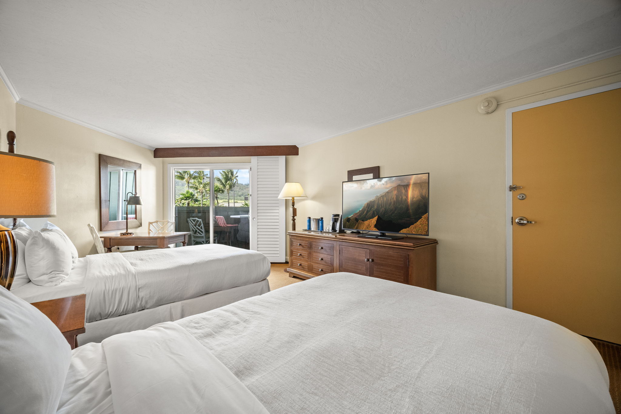 A beautiful unit at Kauai Beach Resort with a mountain and garden view. These are studio units that include a studio room, full bathroom and lanai. This unit also features two double beds. This unit is being managed through the Outrigger and is rental ready for its next owner.
