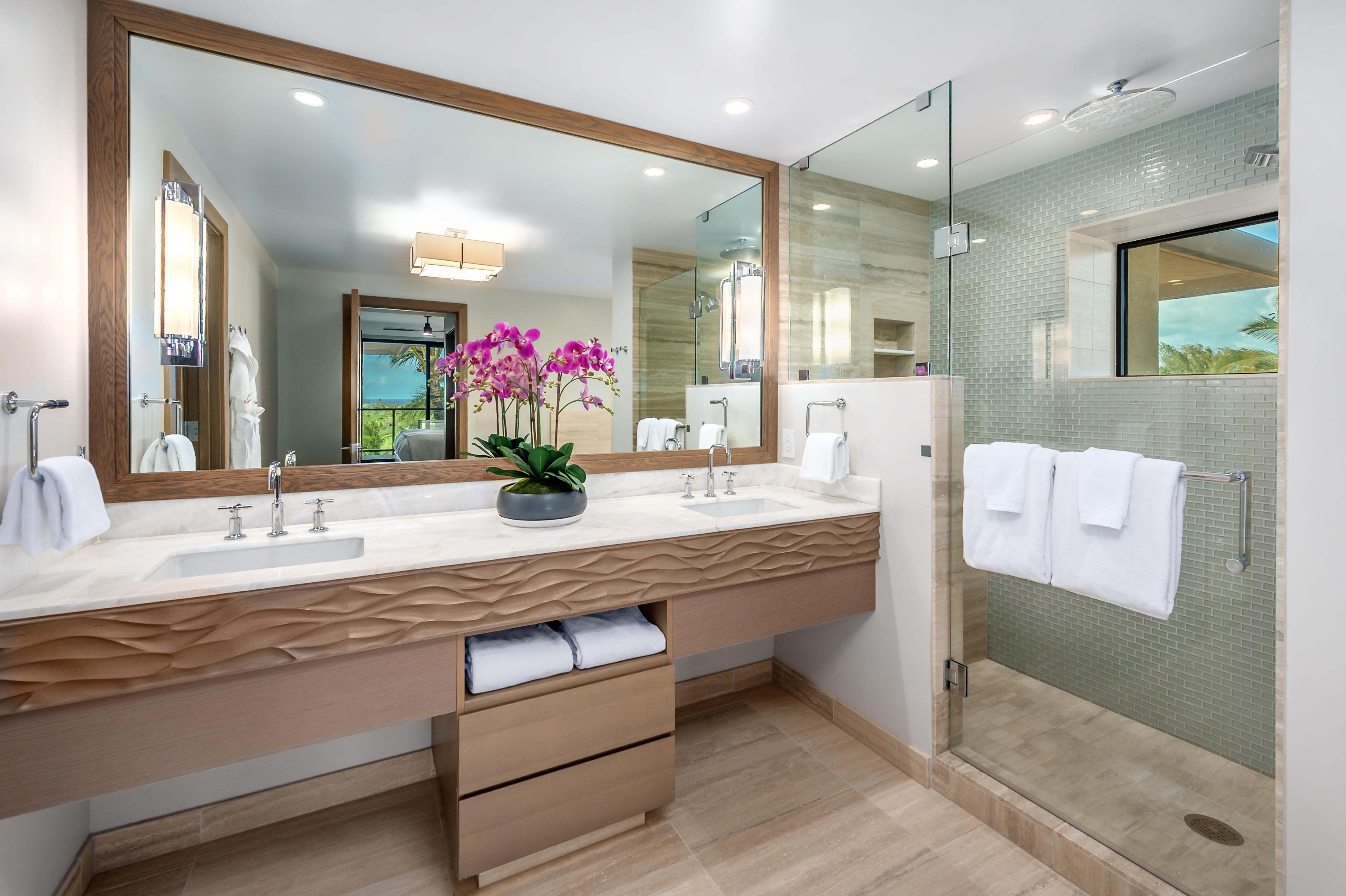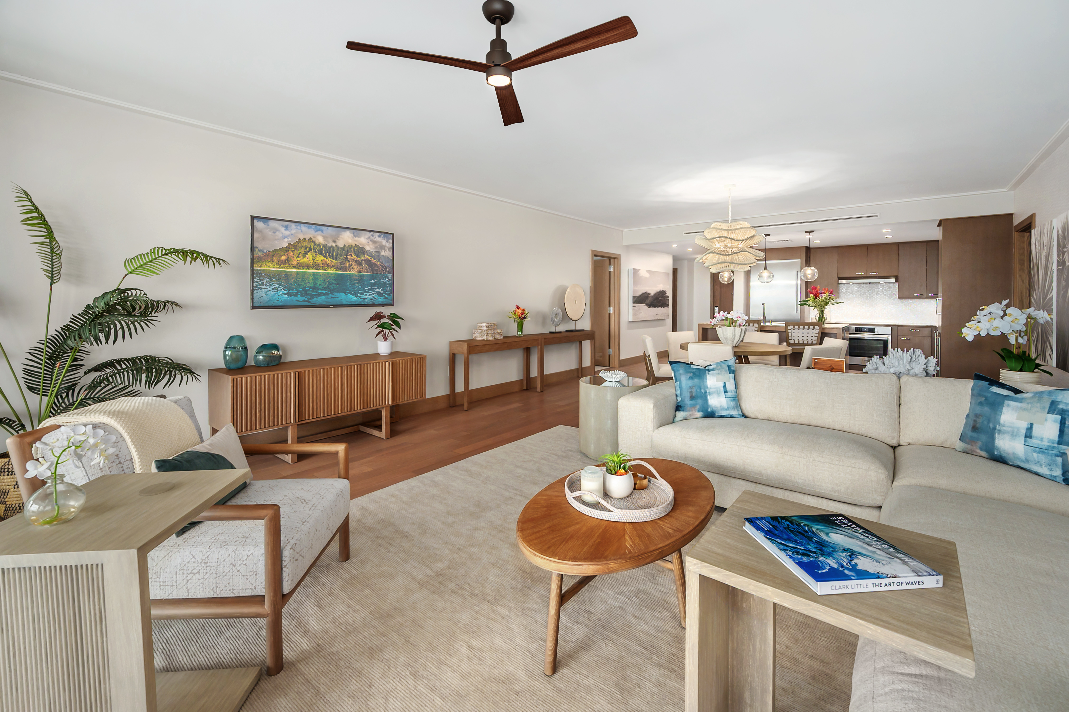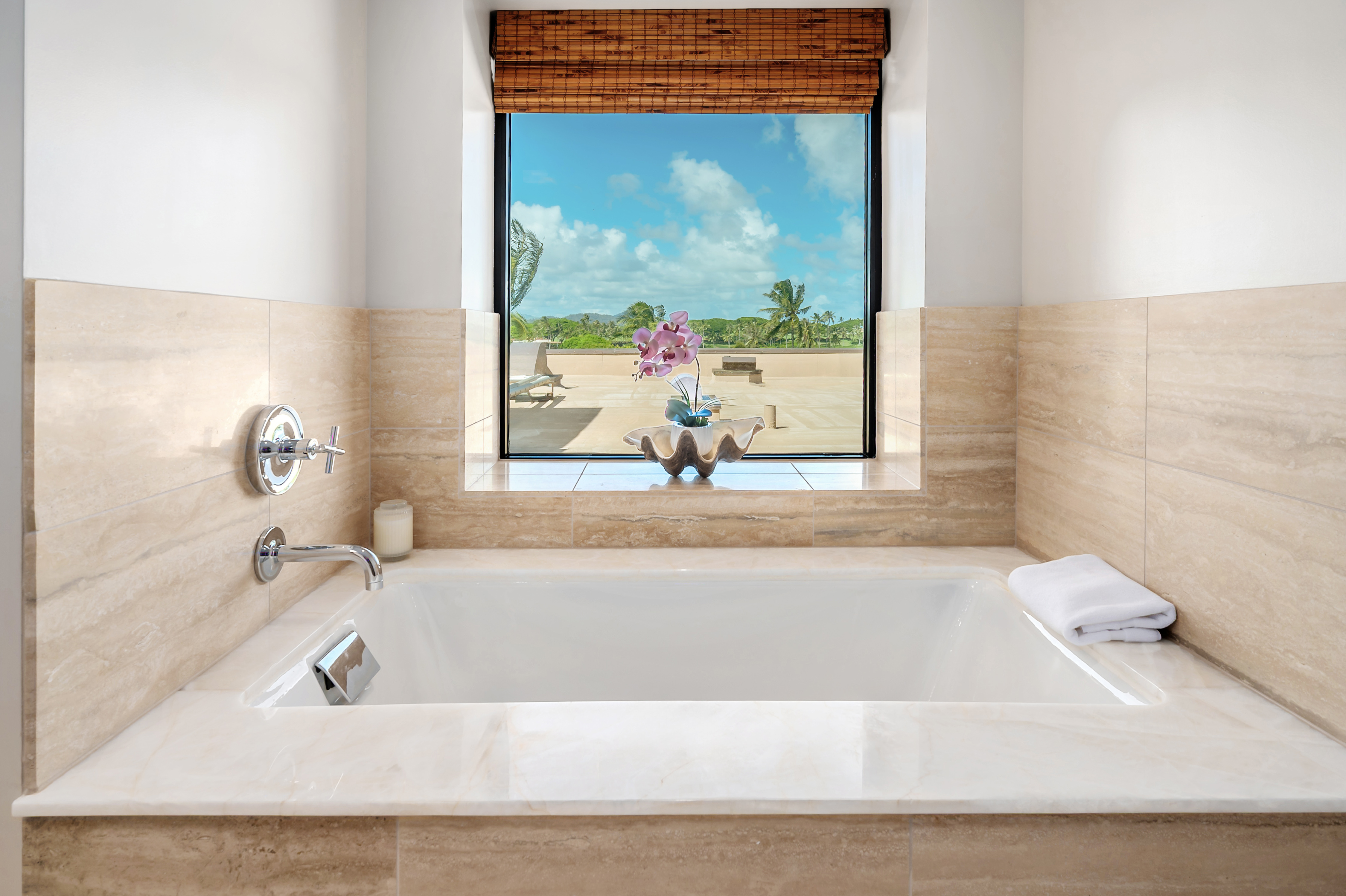 This gorgeous 3 bedroom/3.5 bath penthouse boasts beautiful Kauai sunrise views across the grotto pool to the Ninini Pt. lighthouse and Running Waters Bay from the four spacious lanais. The location of this home offers privacy and serenity and stunning views from every room of the tropical surroundings. Inside you’ll find an exceptional level of finish, with thoughtfully designed custom cabinetry, natural stone vanities and beautifully appointed kitchen that feature Thermador and Bosch appliances. The residence is beautifully furnished by Henderson House and is offered fully turn-key.