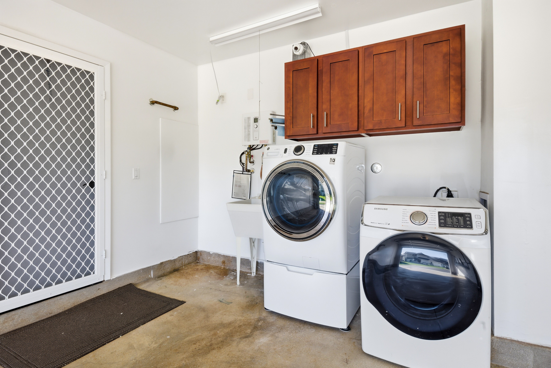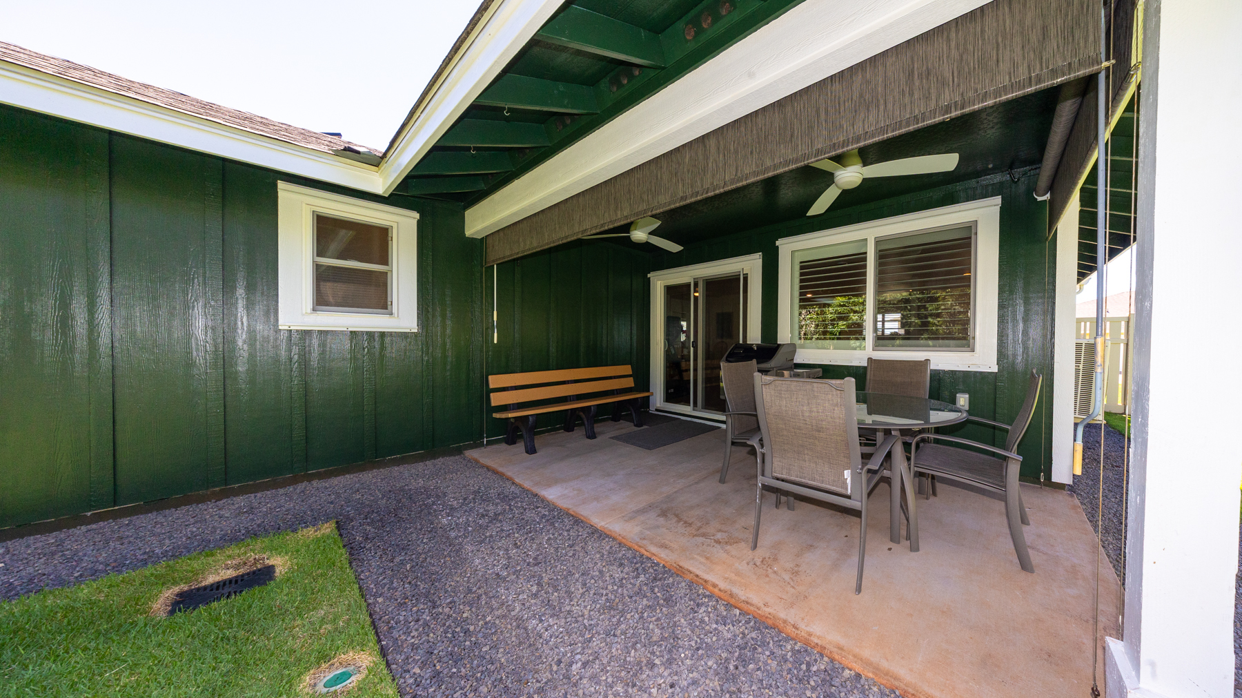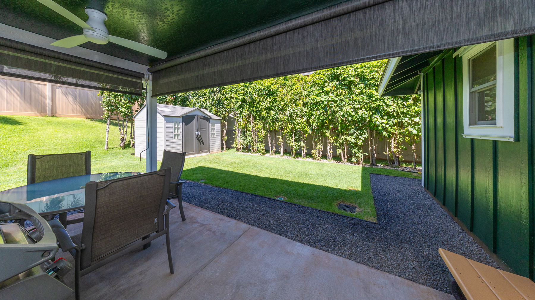 Inside, the home feels fresh and inviting. Built in 2018, it is one of north Lihue's more recent developments. The heart of the home is the chef-friendly kitchen, featuring solid surface counters, soft-close cabinetry and an abundance of storage space. New living room furniture from Otsuka's Furniture Store compliment the open floor plan. The primary suite serves as a retreat with a walk-in closet and dual-sink vanity. Hunter Douglas plantation style shutters throughout the home offer superior light control, energy efficiency and style.