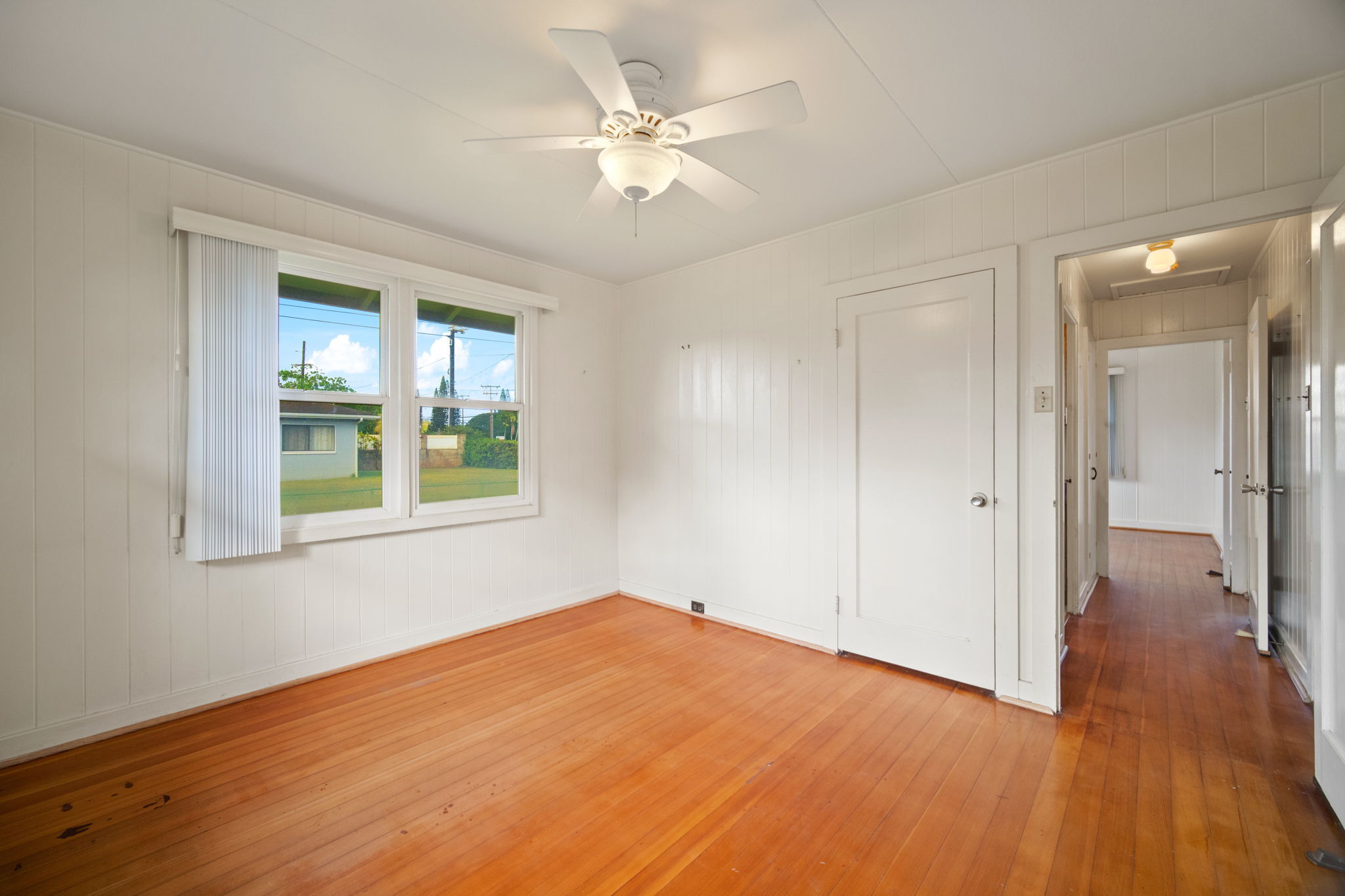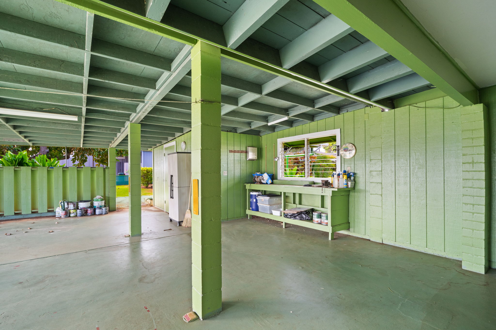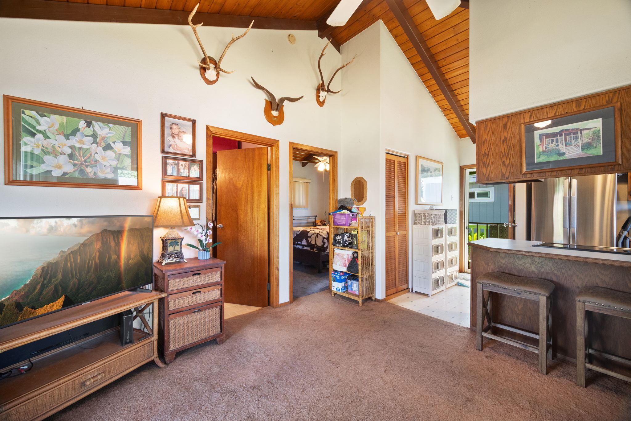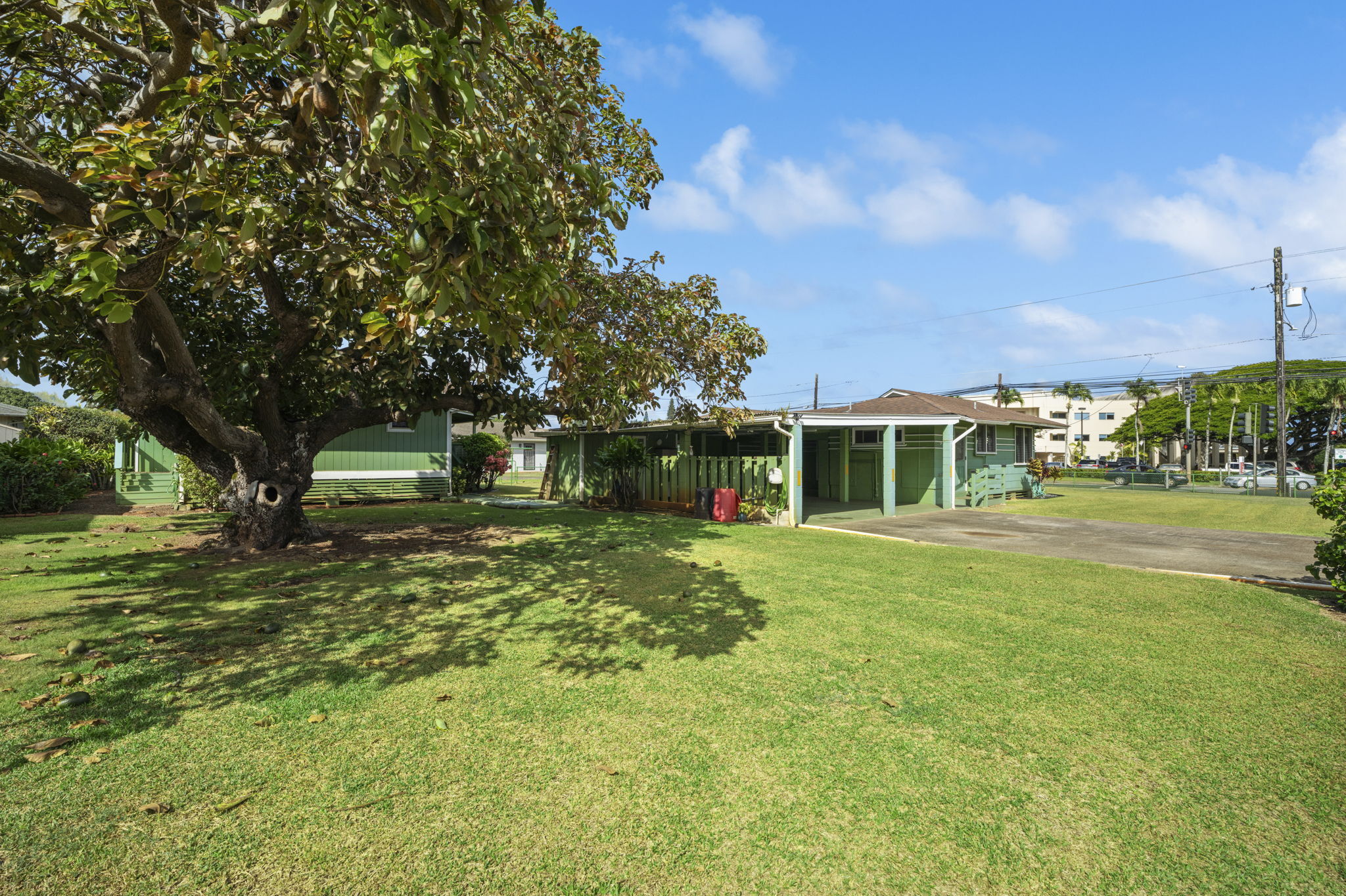 The main house has 2 bedroom and 1 bath. It was built in 1951 with solid redwood walls, canec ceilings and other vintage features common of island homes back in the day. Attached to the the home is a large front patio that overlooks a very fruitful avocado tree. The yard is fenced.