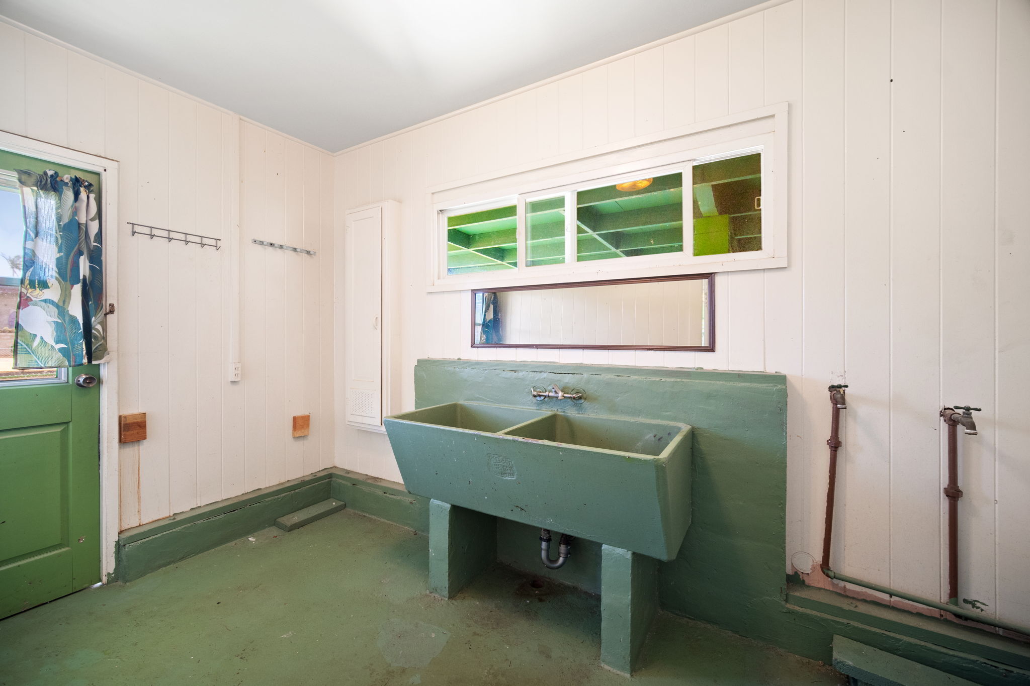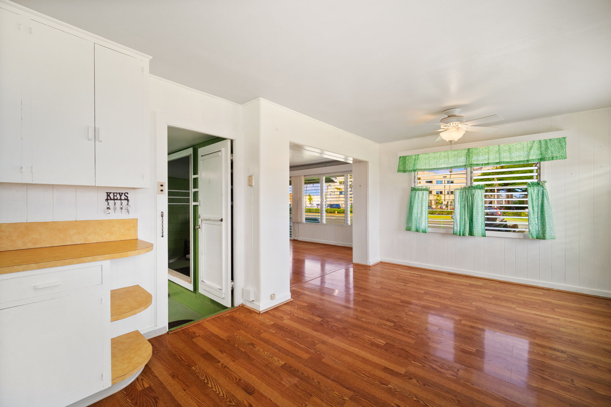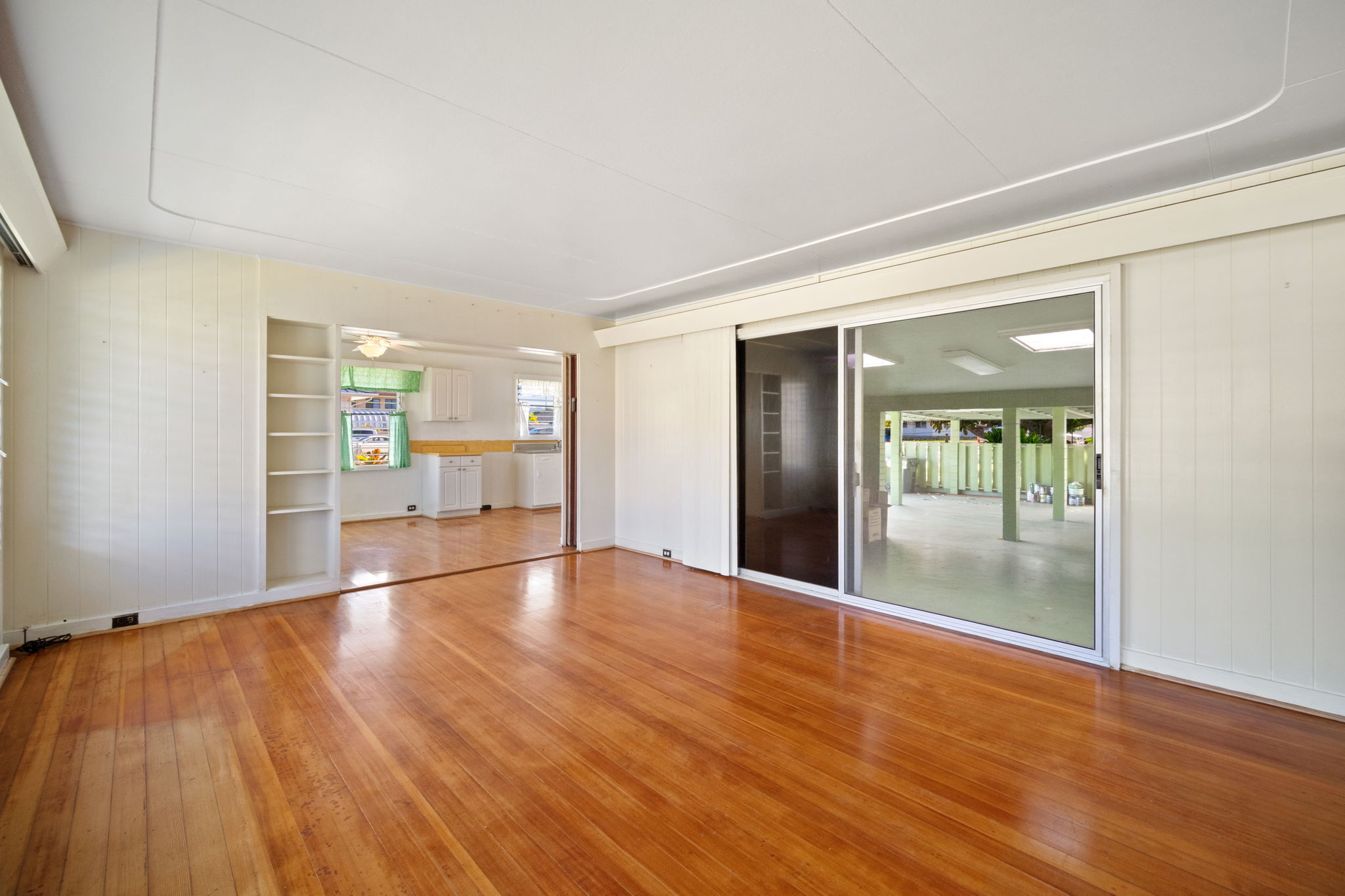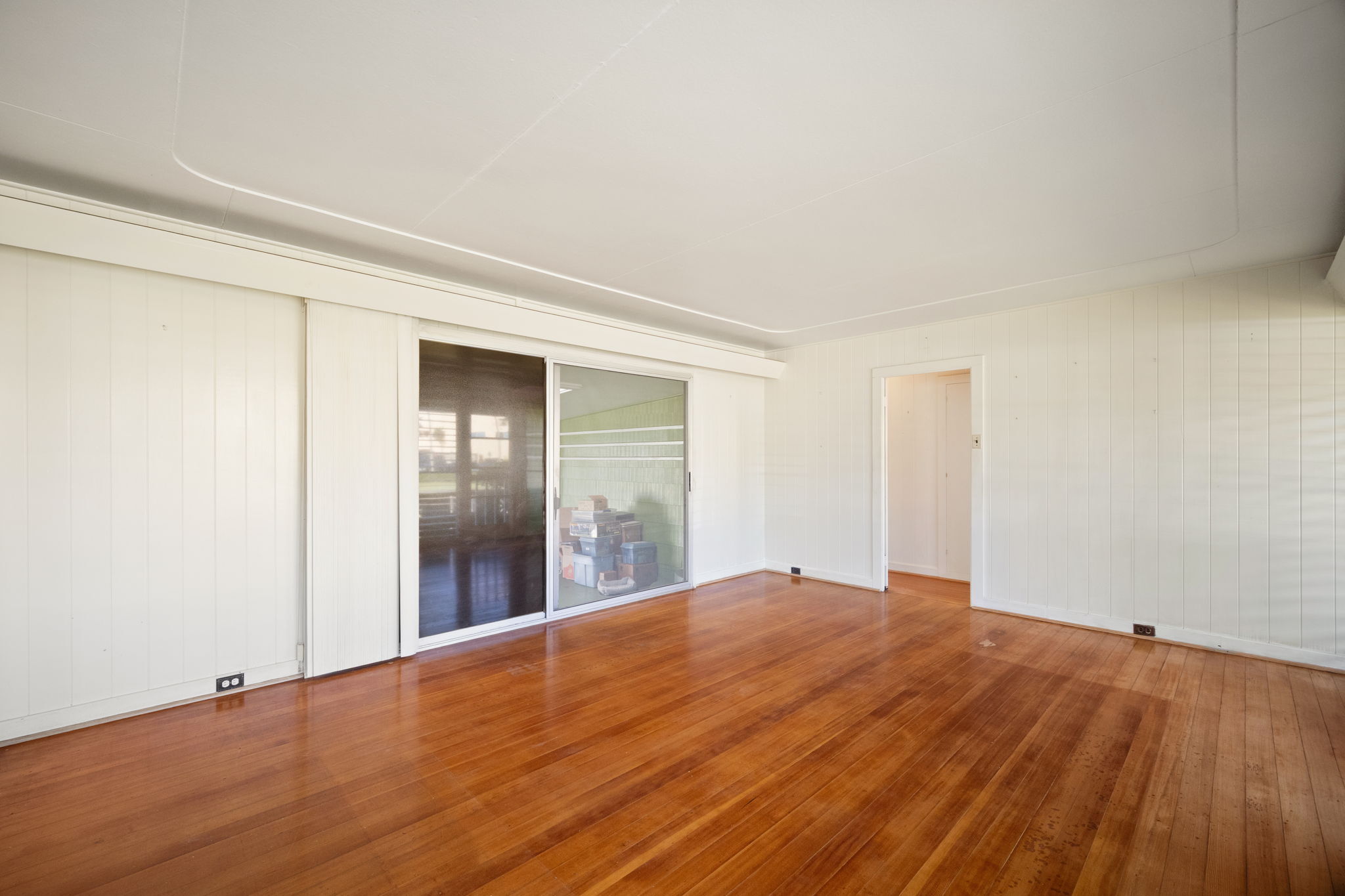 The main house has 2 bedroom and 1 bath. It was built in 1951 with solid redwood walls, canec ceilings and other vintage features common of island homes back in the day. Attached to the the home is a large front patio that overlooks a very fruitful avocado tree. The yard is fenced.