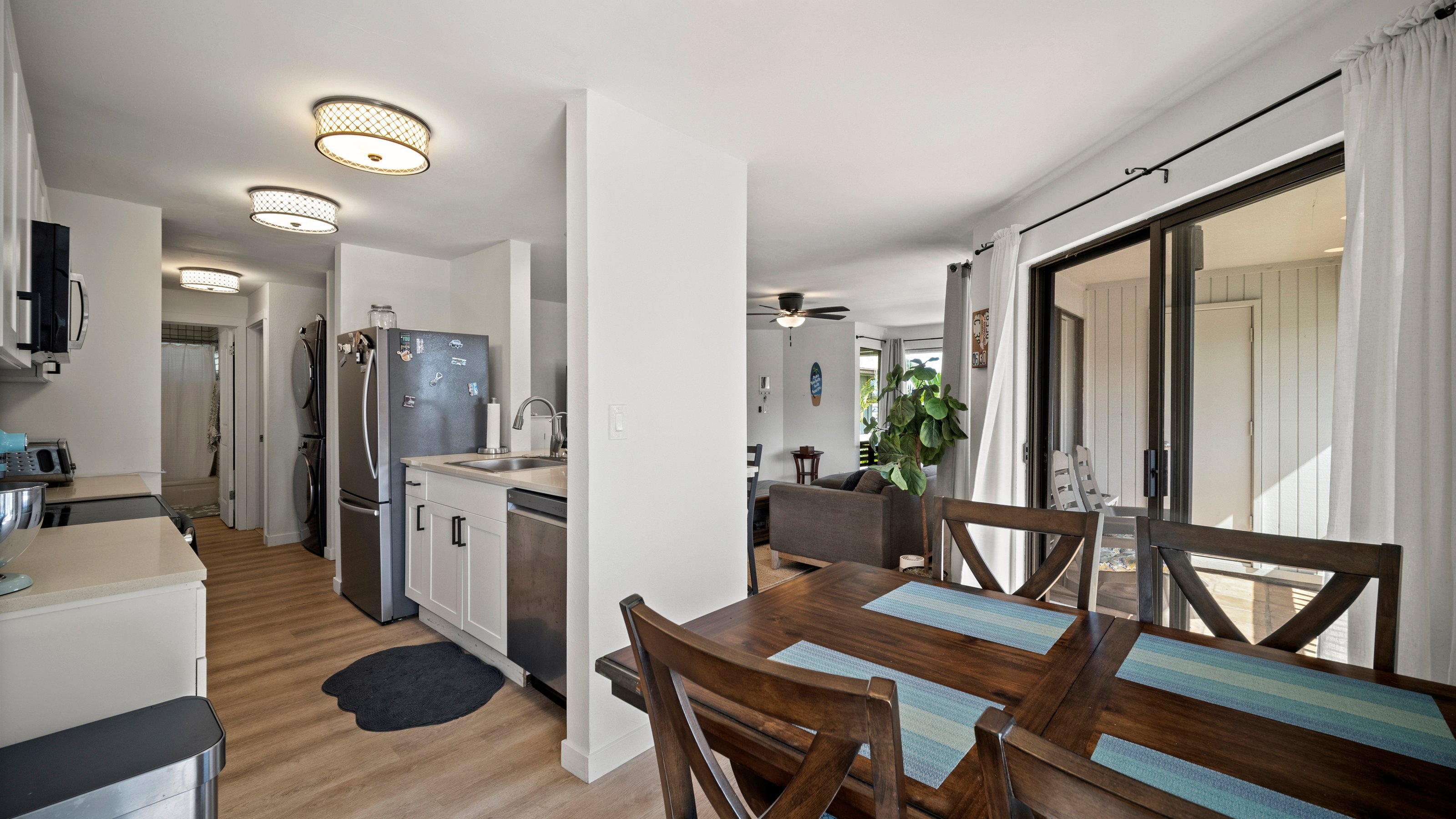 Located within the established Kalapaki Villas community, this updated 2-bedroom, 2-bathroom condominium offers a comfortable and functional living environment in central Lihue. The layout provides separation between living and sleeping areas while maintaining an open, practical flow suited for everyday living. Interior improvements include luxury vinyl plank flooring throughout, updated kitchen cabinetry, quartz countertops, stainless steel appliances, and a reverse osmosis water filtration system. Additional upgrades include new ceiling fans and refreshed fixtures, contributing to a clean, modern feel. The living room opens to a covered lanai where tradewinds circulate naturally and views of a mature banyan tree provide shade, privacy, and a peaceful backdrop. Kalapaki Villas offers community amenities that include a swimming pool and barbecue area, ideal for casual gatherings or relaxing outdoors. The property’s central location allows convenient access to many of Lihu‘e’s key destinations, including Kalapaki Beach, Lihu‘e Airport, Wilcox Medical Center, state and county offices, Kaua‘i Community College, and nearby golf courses at Hokuala and Puakea. Everyday shopping and services are easily accessible, with Costco, Target, Kukui Grove Center, Harbor Mall, Anchor Cove, Walmart, Home Depot, Safeway, and additional retail and dining options all within a short drive. Whether used as a primary residence or held as an investment, this updated condo presents a well-rounded opportunity in one of Kaua‘i’s most centrally connected locations.