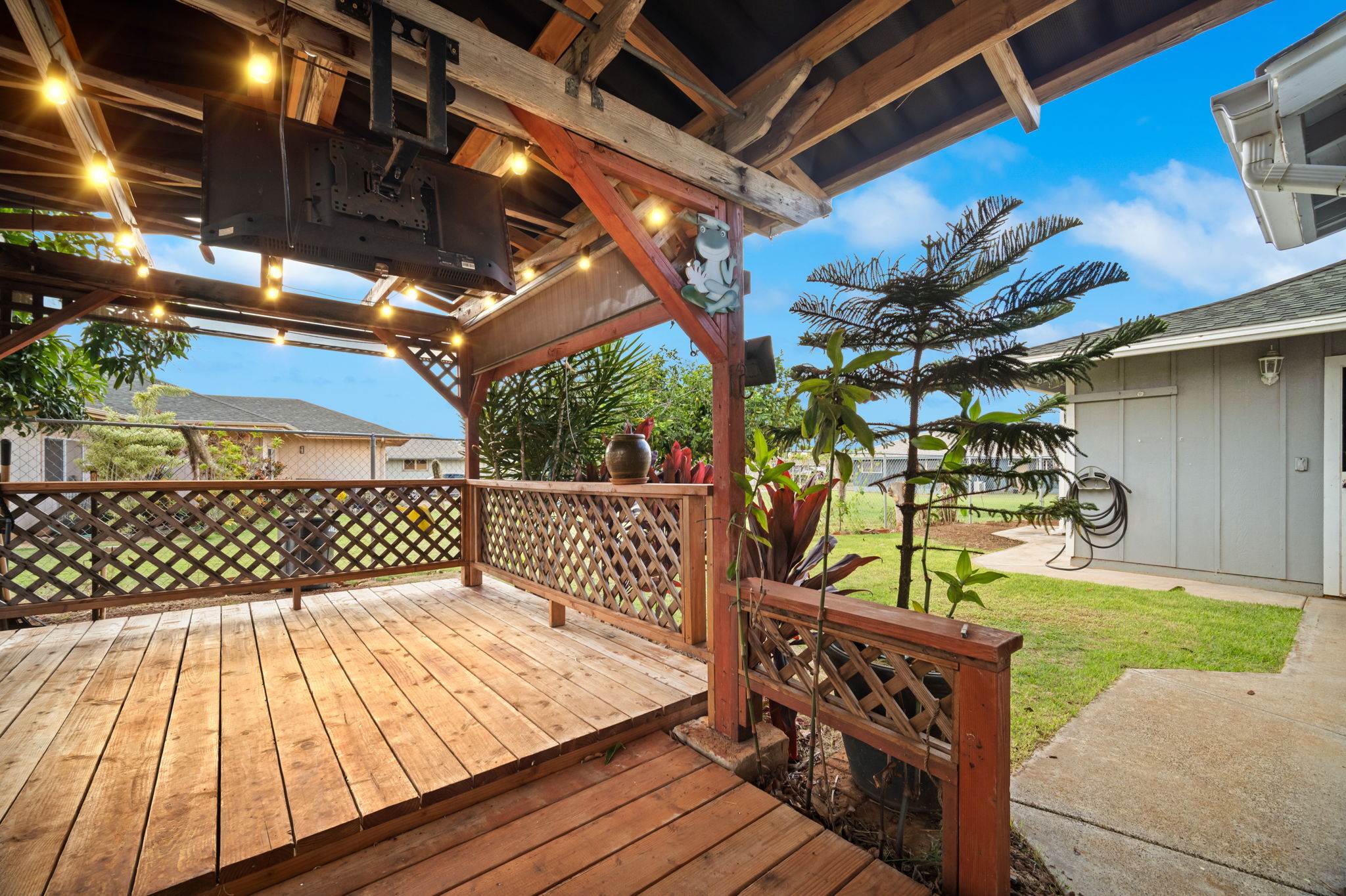 This lovely, well-maintained, one-story home is conveniently located in Molokoa, Lihue. The property includes many updates and features, such as: - Completely fenced yard - Backyard covered BBQ area - Screened-in porch - Large garage with a bathroom - Outside shower - New appliances - Hardwood floors - Skylight - Solar attic fan - Fruit trees including lime, lemon, mango, and guava Sale subject to Seller finding a replacement property
