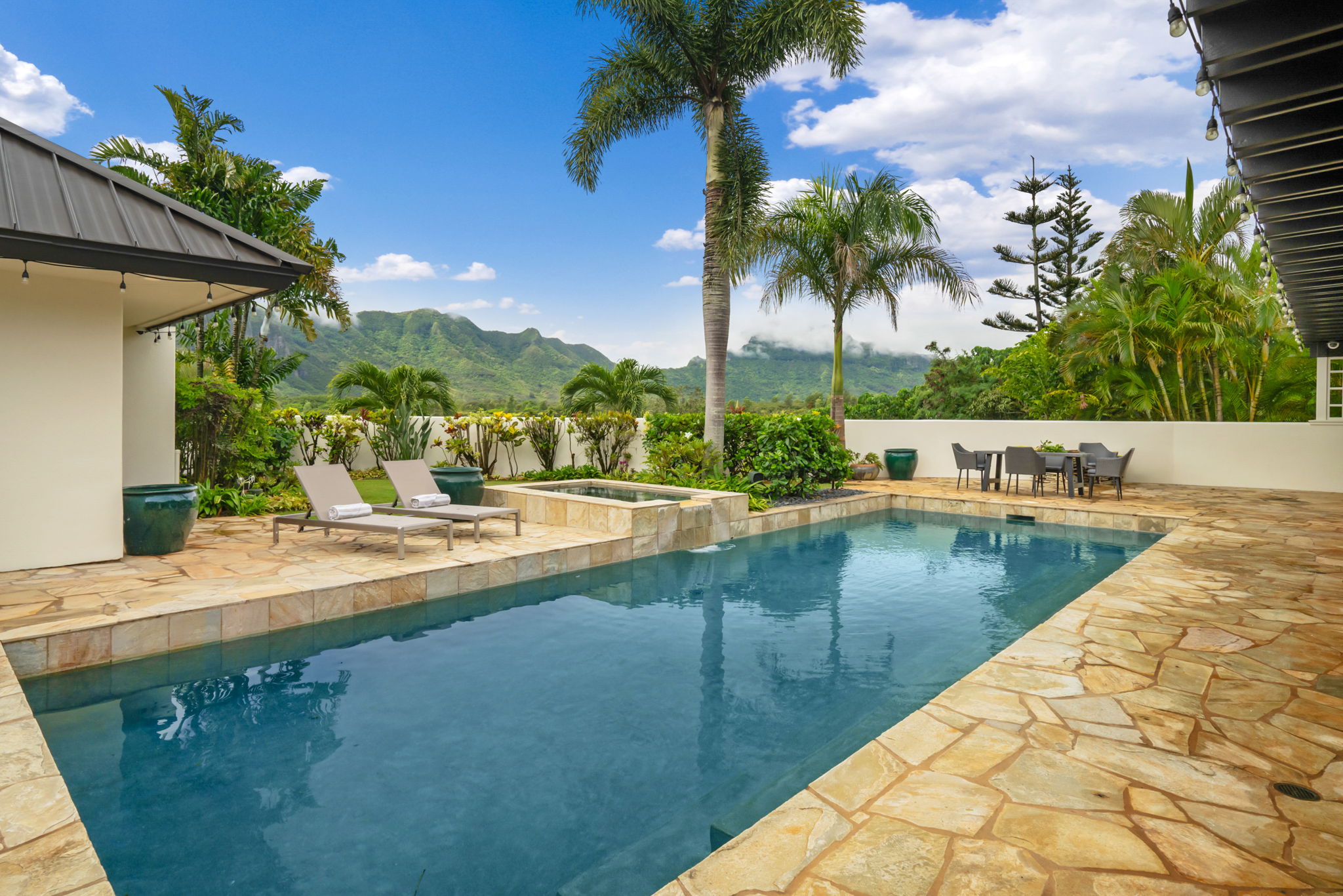Quartzite flagstone carries throughout. From the driveway to the elegant entry, the pool hardscape, and the complete living areas give this home the rich character to enhance any décor and indoor-outdoor Kaua’i style living and aesthetic. Built by J M Pacific, the home was constructed without bearing walls to support the unique roof structure; many of the more significant walls were engineered with steel framing. Extensive use of glass windows, doors, and walls creates expansive openness in every direction. Owners will not only appreciate but cherish the artistic attention to detail for generations — it is timeless with several hundred thousand dollars having been invested in new glass folding door systems, two new 5-ton Lennox variable speed high-efficiency air conditioning systems with air purification and Mylar air distribution system, two new Daiken mini split units, new insulation in the entire attic, new pool heater, new variable pool pump, new Pentair pool control system. New Savant audio video system, new televisions and speakers. The kitchen and bathrooms have new quartz countertops. New exterior paint. Hydrazzo polished pool finish, spa