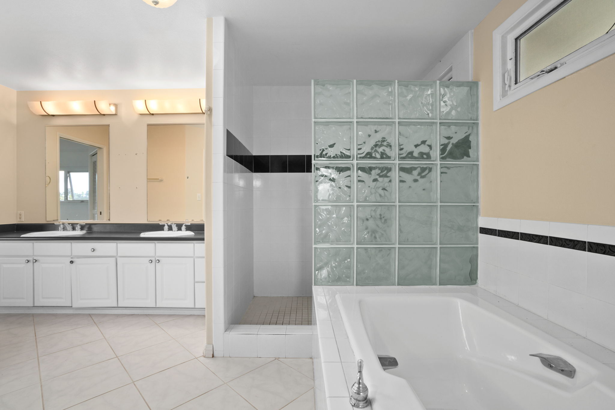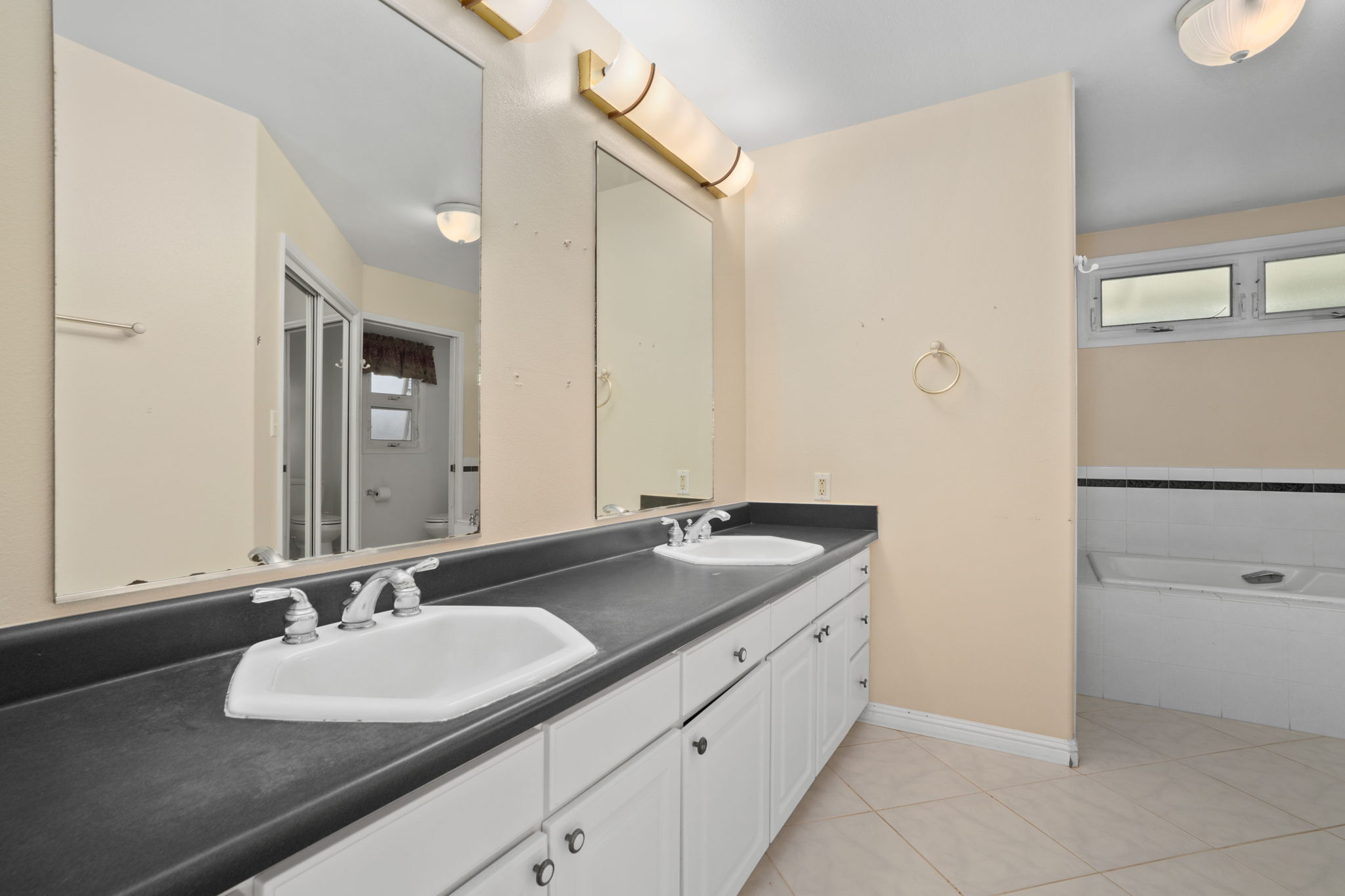 - Primary bath with double sinks, soaking tub, separate tiled shower, and private