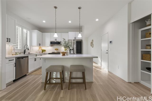 Welcome to Nanea at Koa Ridge! This extensively upgraded 5-bedroom home features 22 owned PV panels, wrap around stamped concrete walkways and rock walls - perfect for outdoor entertaining. Inside, the home features plantation shutters throughout, built-in cabinetry and shelving, California Closets, and pre-wired ceiling speakers for an elevated entertainment experience. A Lores security system (no subscription required) adds convenience and peace of mind. And the ground floor bedroom serves nicely as a guest or in-law suite. Ideally located near shopping, dining, and freeway access within the vibrant and growing Koa Ridge community, come see all that this home has to offer!