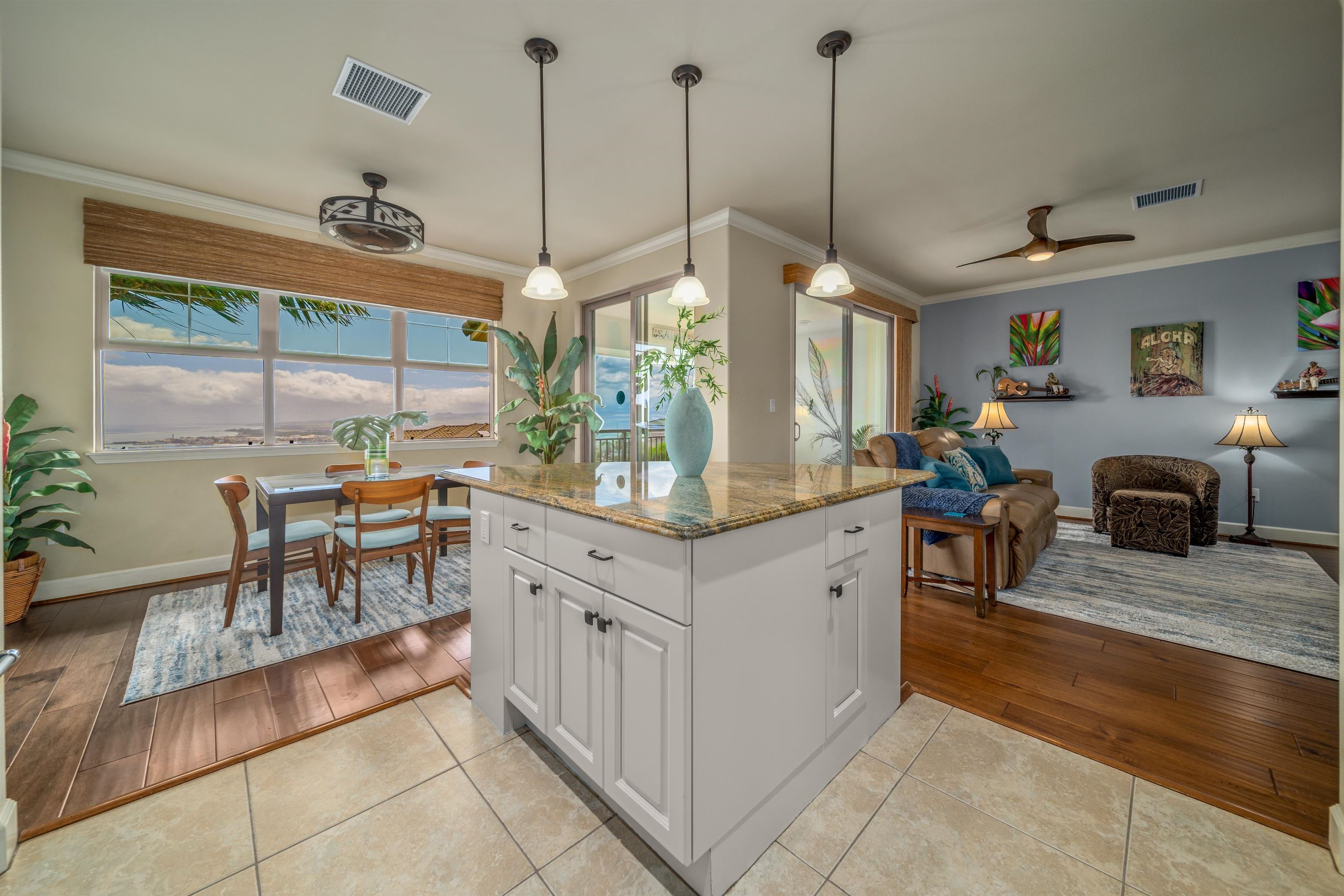 Sitting on a hillside, the Villas at Kehalani are known for some units having big ocean views. Unit 1002 has one of the BEST ocean and Haleakala views in the complex! Building 10 has superior views for two reasons: It’s located in the second row on a higher incline versus other rows resulting in increased elevation over the front row, and secondly, it’s perched over the open span of the gated entrance. This creates huge panoramic views even from the living areas on the first level. (Many units have limited ocean views and only from upstairs.) The cool breezes that flow over the master planned Kehalani community means you rarely use the central A/C. The moderate Wailuku weather makes for comfortable mornings on your lanai with a cup of coffee or at the end of the day with a glass of wine. The original upgrades from the developer included acacia hardwood floors on the ground level, crown molding throughout the home, 20” tile in the kitchen, bathrooms and lanai, closet organizers, and upgraded appliances. Recent improvements included having the kitchen cabinets and island refinished, new carpet installed upstairs, new water heater, as well as many other details being attended. Have your Realtor call so you can see this home in person TODAY!