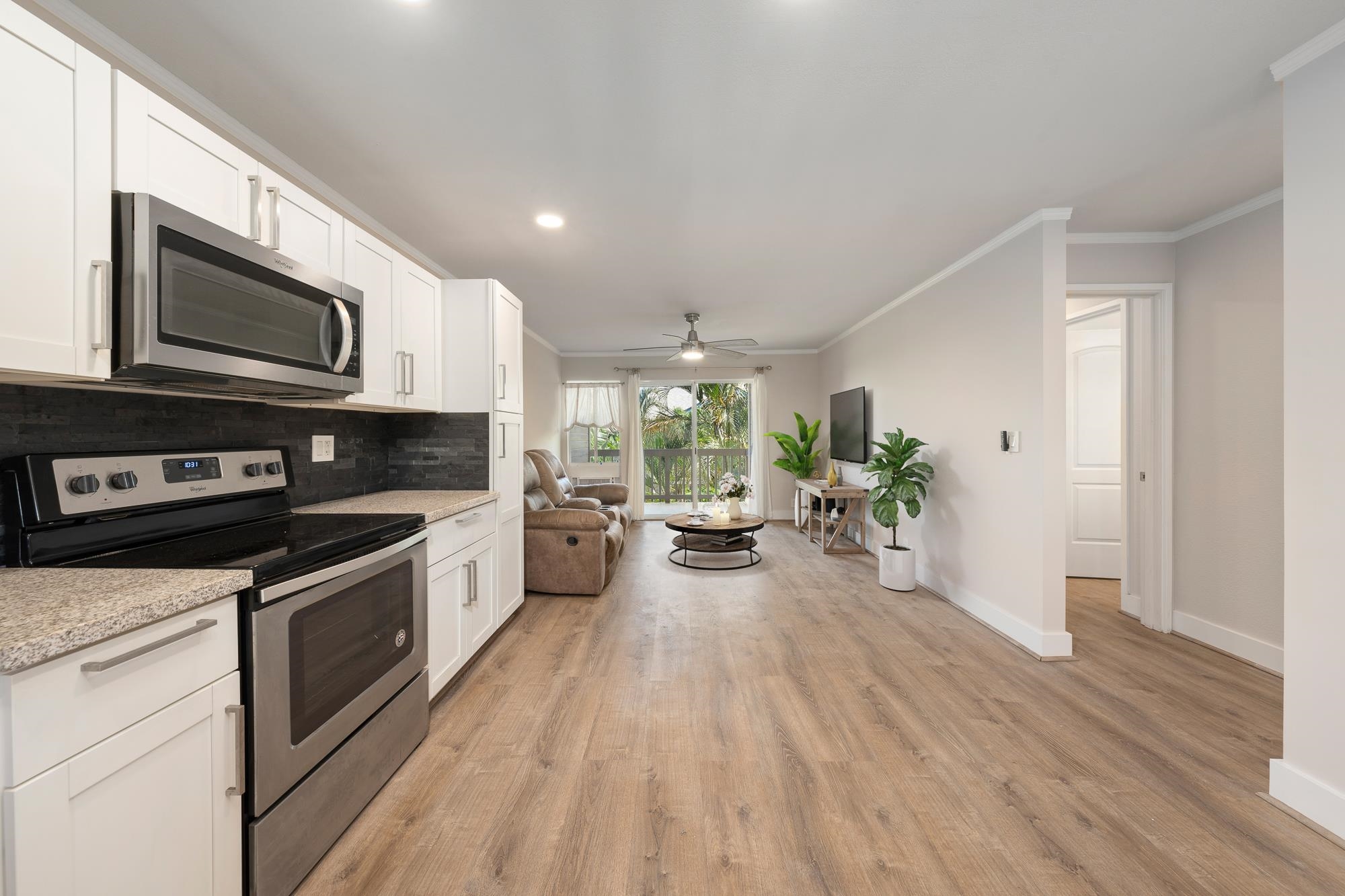 Come see this modern home containing 2 bedrooms and 2 full bathrooms. Once inside you are greeted by waterproof vinyl planking throughout and a beautiful, open floor plan. The kitchen features granite countertops, Whirlpool stainless steel appliances, and recessed lighting. The two bedrooms are located on the opposite ends of the condo for privacy. For convenience, your two parking spaces are located right in front of the unit. This complex offers an owners clubhouse, children’s play area, main office, security and on-site manager. This pet friendly community is just minutes away from the beach, dinning, and shopping. *Please note that elements in some photographs i.e. furnishings and decorations, have been virtually staged to demonstrate potential design ideas.