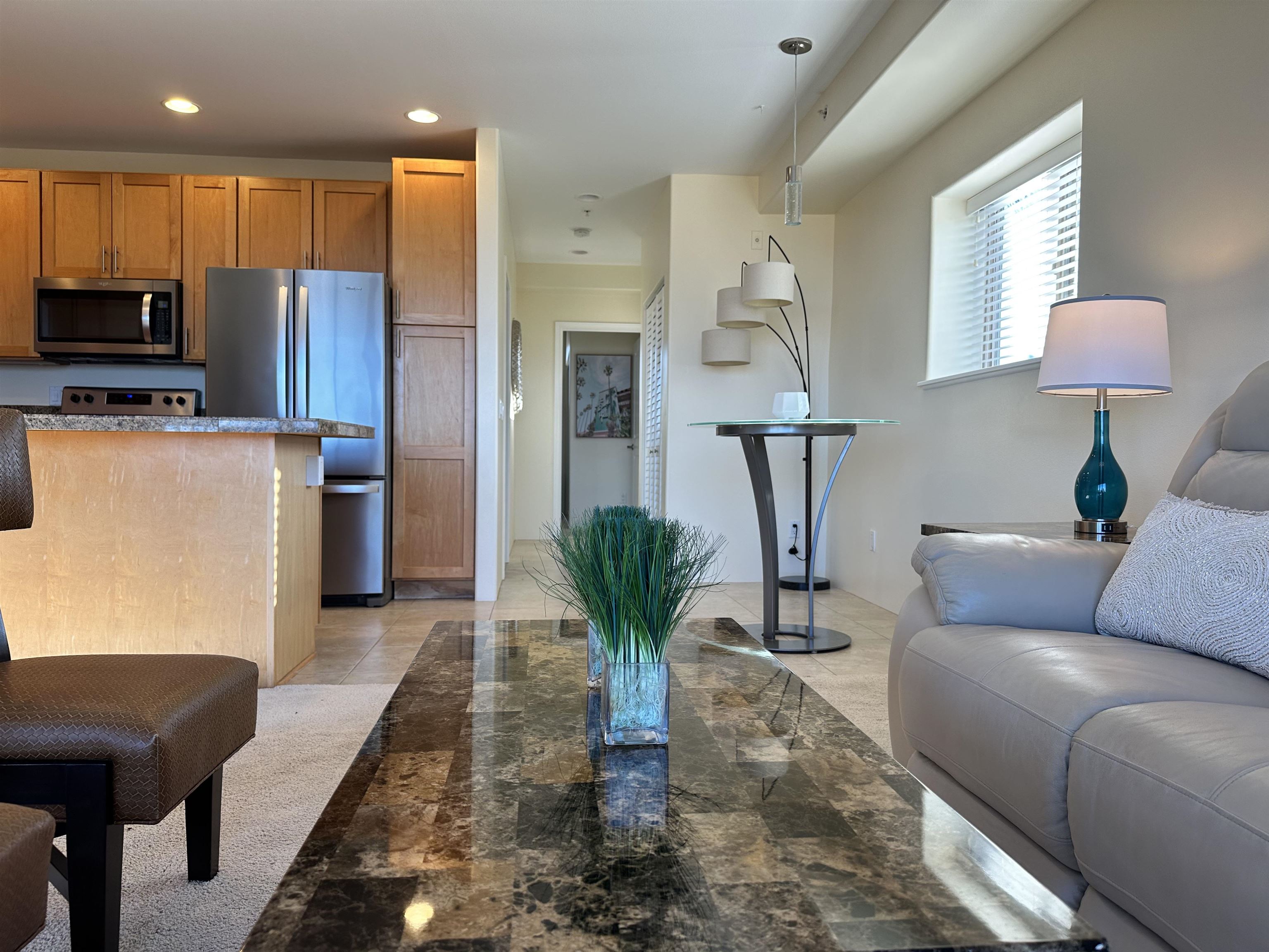 Panoramic ocean/sunset and Haleakala views from this 1 bedroom, 3rd floor end unit at Kihei’s centrally located hidden gem, Walaka Maui – a contemporary concrete and stucco building. Surf? Beach? Hungry? Just a short walk to Cove Park, Charley Young Beach, and the South Maui Gardens. Come home to a beautifully furnished, split air conditioned, fire sprinkled apartment with 2 BRAND NEW bathrooms, newer stainless appliances, full size stacking washer and dryer, window coverings, solar shades and solar panels! Take your choice of parking in your 2 deeded spaces and store all your extra stuff in the large, secure storage room. Elevator in building. Rarely available and a great opportunity!