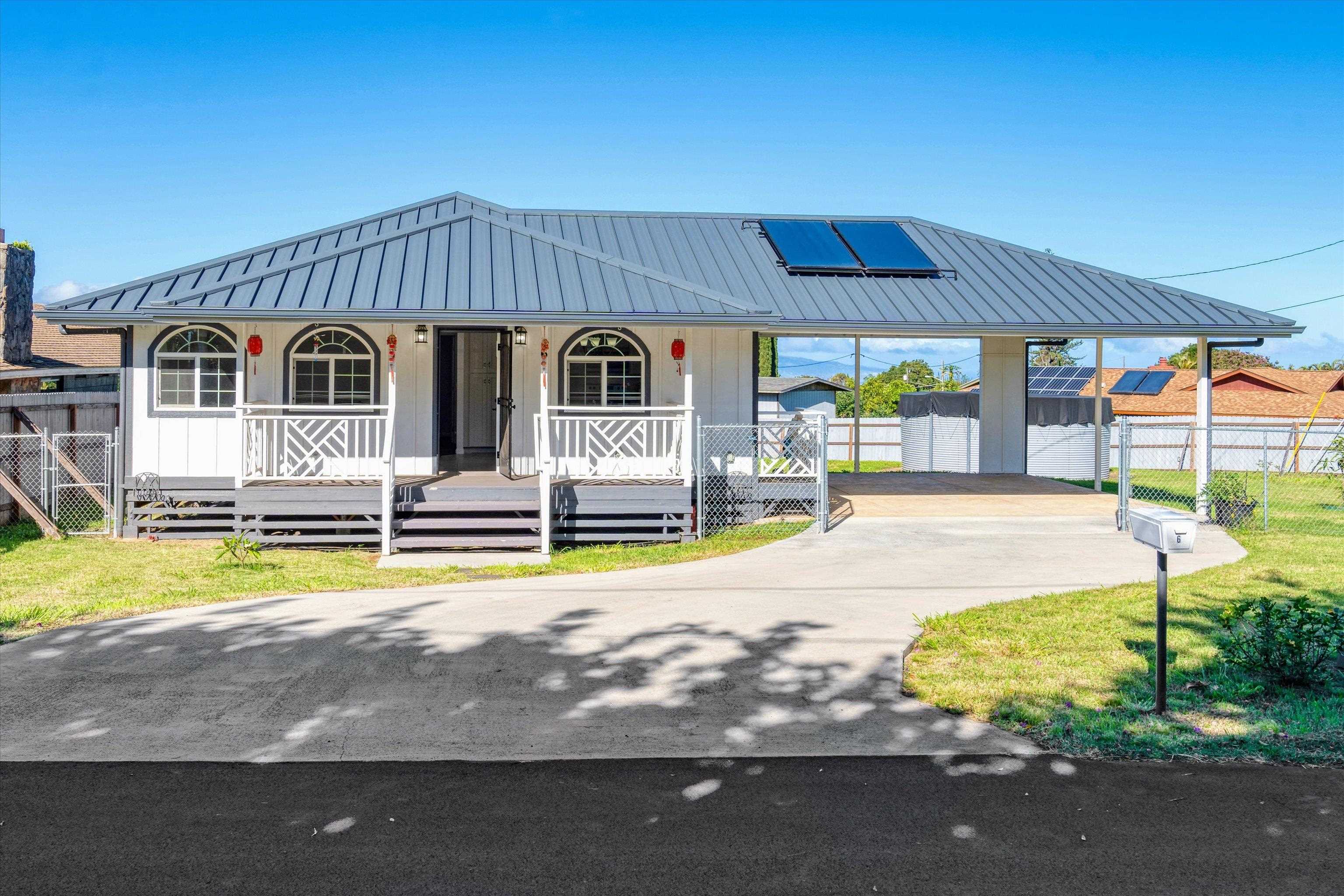 CUSTOM BUILT IN 2021! (NOT CPR'D) Plantation home in the heart of quaint Makawao town offering views of Haleakala, West Maui Mountains and the ocean! This home has a standing metal seam metal roof and an oversized carport. Sited perfectly on this 13,252 square foot corner fenced lot. Excellent floor plan with 2 spacious bedrooms w/ en-suite baths. The main bedroom features a walk-in closet and extends onto the cozy porch overlooking the backyard. The main living area is bright, open and airy with all new stainless appliances, granite countertop in kitchen with under-mount sink, new solar water heating, dual pane vinyl windows and slider door, three filtration water system for the 14,900 catchment and a 1250 gallon concrete septic system and more! Makawao Ranch Acres does not have an active association and there are no monthly dues. This property is situated in close proximity to the rural town center where you can grab your famous Kamoda pastries along with the boutique stores, Makawao library, post office, restaurants and the Eddie Tam Memorial Center equipped with basketball courts, baseball fields, gymnasium, and soccer fields. The current owner planted fruit trees and fenced in the majority of the backyard.