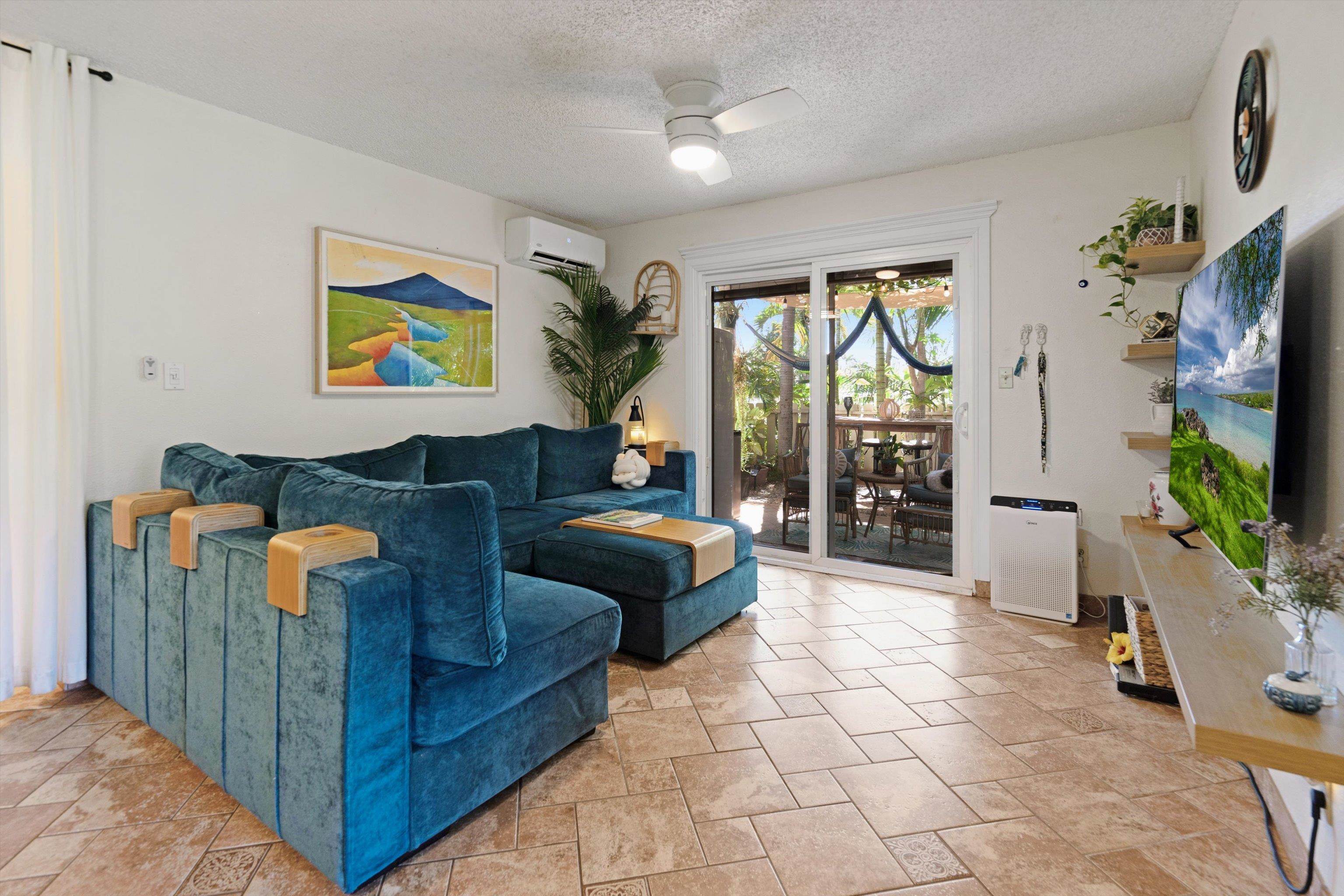 Prime Location in Kihei Villages — Charming 2-Bedroom Condo with a Private Tropical Oasis Welcome to the best location in Kihei Villages! This delightful 2-bedroom, 1.5-bath condo offers a serene retreat with a lush, landscaped yard that's both private and expansive. With gated access leading directly to the street, you'll enjoy the convenience of being close to a County park and just a short stroll to the sandy beach with magnificent views over Maalaea Bay.. The open-concept living, dining, and kitchen area creates a welcoming space, enhanced by upgraded windows that fill the home with natural light. The kitchen features solid surface counters, while tile and laminate flooring add a touch of style throughout. The dining area boasts a peek-a-boo ocean view, perfect for enjoying meals with a scenic backdrop. Stay comfortable year-round with a newly installed split AC system in the living room and both bedrooms. Outside, the two-level tropical yard with a stone retaining wall is your personal oasis, complete with a hammock for ultimate relaxation. Additional features include a decorative security door with unique palm tree design, low-maintenance yard care, an outdoor shower and a harmonious blend of indoor-outdoor living. This property is a perfect slice of paradise in one of North Kihei's most sought-after locations!