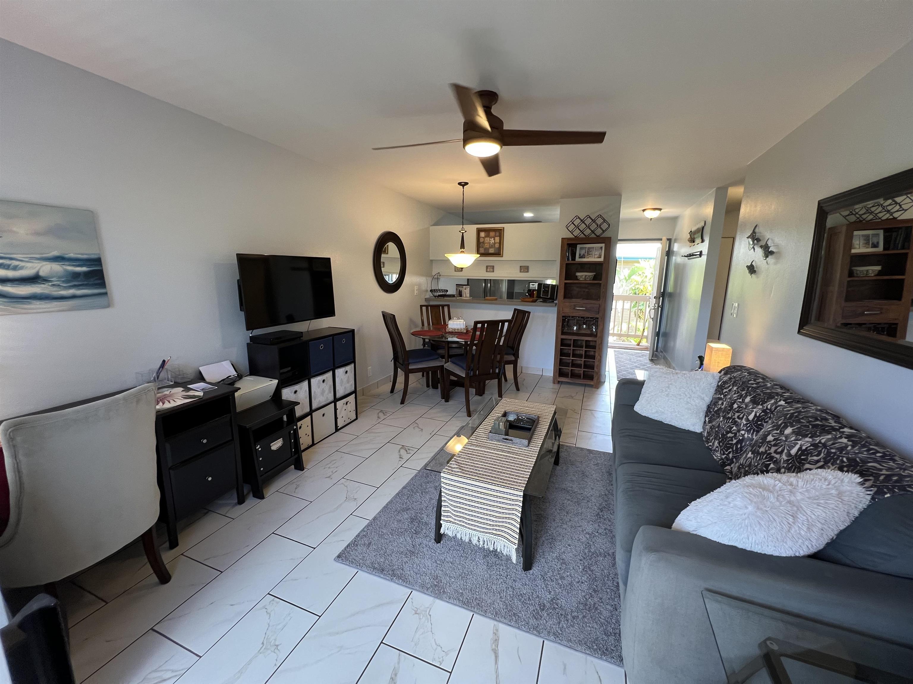 GREAT OPPORTUNITY primary residence or second home as "Home Sweet Home" IT IS! Feel right at home in this remodeled 2 bed, 2 FULL bath, condo with a causal living style, comfort and privacy from the neighboring units. A lanai for morning solitude coffee/tea or enjoying a sunset beverage. Great location in the back of the complex. Unit unoccupied since the remodel and is being sold FULLY furnished and turnkey. Just bring your clothes, unpack, go grocery shopping and settle in! Tiled in living, kitchen and bath areas with Life Proof rigid core vinyl plank flooring in the bedrooms. Freshly painted throughout, unit includes a NEW Daikin 3 Zone split A/C system for comfort, efficiency and lower electric costs. All new soft close cabinets, cupboards and drawers. Granite countertops in kitchen and baths with new plumbing, sinks, faucets and water saver toilets. New recessed lighting in kitchen and an over the stove microwave. The two bedrooms on opposite ends of the unit for more privacy within the condo and a FULL bathroom for each, no sharing needed! Even a custom painting in main bedroom to match the bedding! Brand new stackable full sized washer and dryer on Dec. 6, 2024. Water heater replaced 2022. Security door allows airflow and privacy. Two easy access tandem parking (256 & 257) near the unit. Complex offers a playground, BBQ's, a clubhouse, guest parking and is pet friendly. Internet and cable included in the maintenance fee! A few blocks from the ocean to enjoy sunsets and a short drive to Kihei or Kahului shopping and restaurants. Available and waiting for YOU! Don’t miss this one! Listor is owner. Call for a showing today.