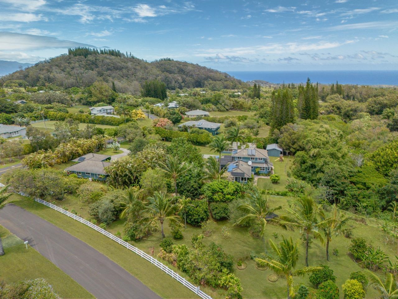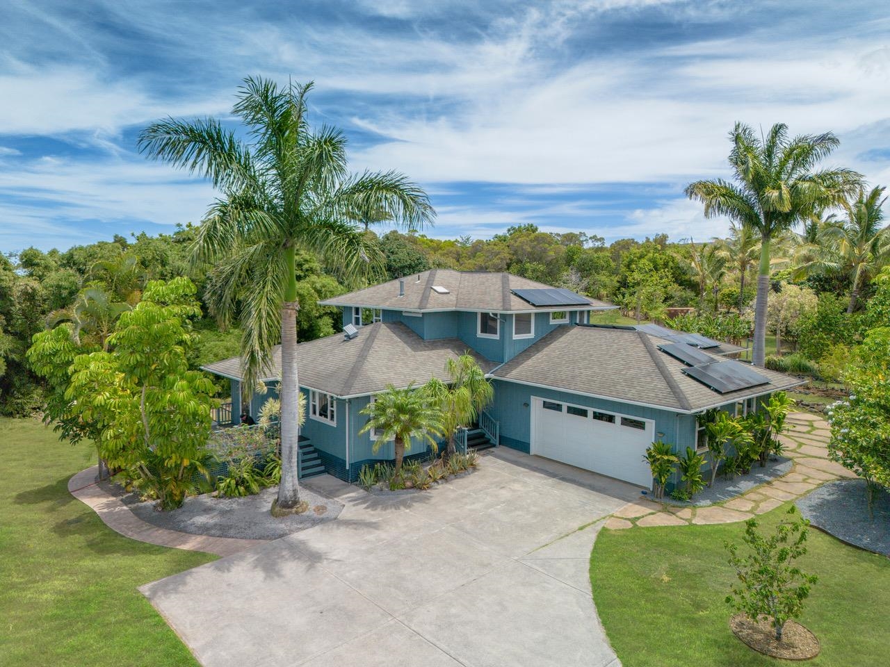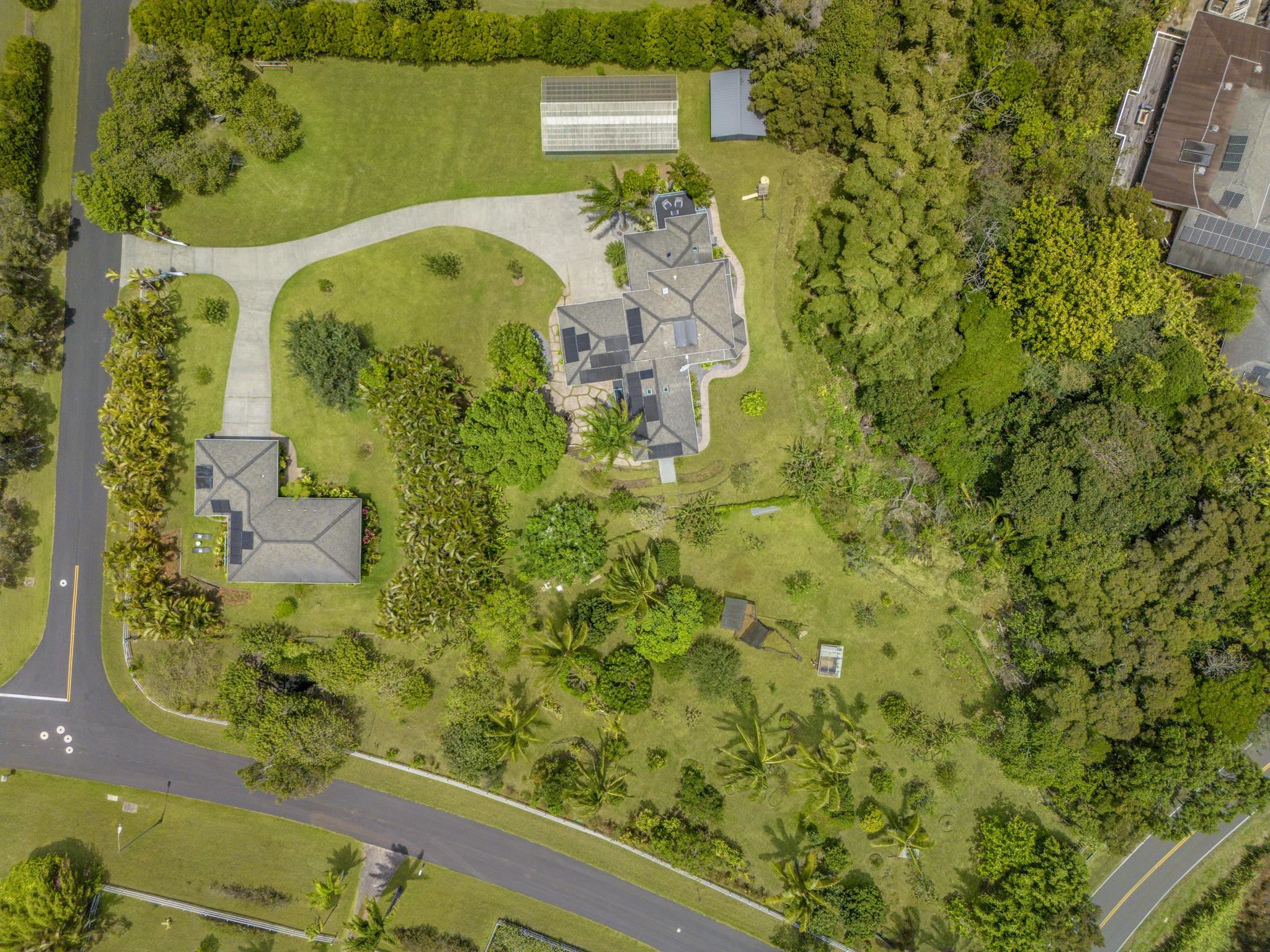 Discover the perfect blend of sustainability and modern luxury at this exceptional Haiku estate. Set on over two acres of lush tropical land, the property features a 4-bedroom, 3-bath main home (2,744 sq ft) and 3-bedroom, 2-bath ohana (1,000 sq ft). On the first floor in the main house the primary suite features a luxurious modern ensuite bathroom and walk in closet, and upstairs there are three bedrooms and a bathroom. There is also a separate mother-in-law suite, with a beautiful sunroom looking out on the fruit & vegetable gardens, with its own kitchenette. This suite can also serve as a large family room for everyone. Both homes are equipped with net-metered solar power systems, and the main house includes two Tesla Powerwall batteries, significantly reducing utility costs. Split AC systems in both homes provide year-round comfort. A gardener’s dream, the property boasts a 1,100 sq ft greenhouse and over 100 mature fruit trees including mango, avocado, citrus, cacao, lychee, and coconuts. Chicken and duck coops, a beehive, and a peaceful duck pond support a self-sufficient lifestyle, while an outdoor fire pit adds charm and more space for entertaining. Walking the grounds, you’ll find thoughtfully designed outdoor spaces perfect for relaxation or gatherings beneath the stars. Paths wind through abundant gardens, leading to shaded nooks and sunny patios, all framed by the gentle sway of palms and the sweet scent of plumeria and puakenikeni. The estate’s layout seamlessly balances communal areas with pockets of solitude, making it easy to envision quiet mornings with coffee or festive evenings surrounded by friends and family. Enjoy quiet privacy with convenience: just 7 minutes to Haiku and Makawao, 15 minutes to Ho’okipa Beach, and 25 minutes to Costco and the Airport. Whether you’re seeking a serene retreat, multigenerational living, or a self-sustaining homestead, 1865 Kalia Way offers an unparalleled opportunity to embrace Maui’s beauty and bounty. Call your favorite Realtor today to book a showing.