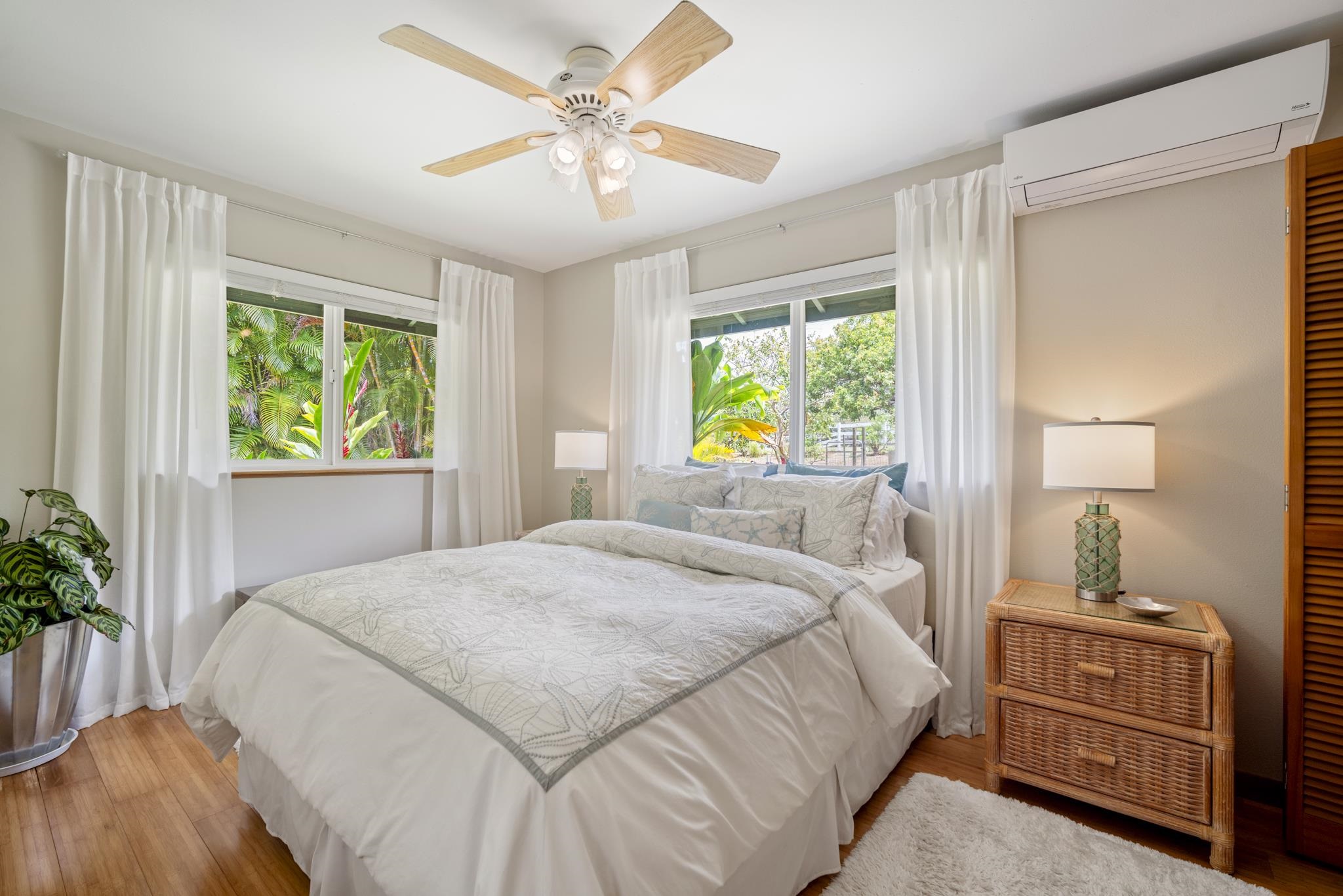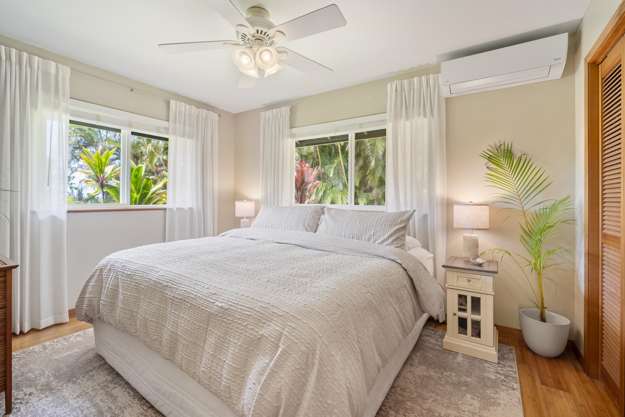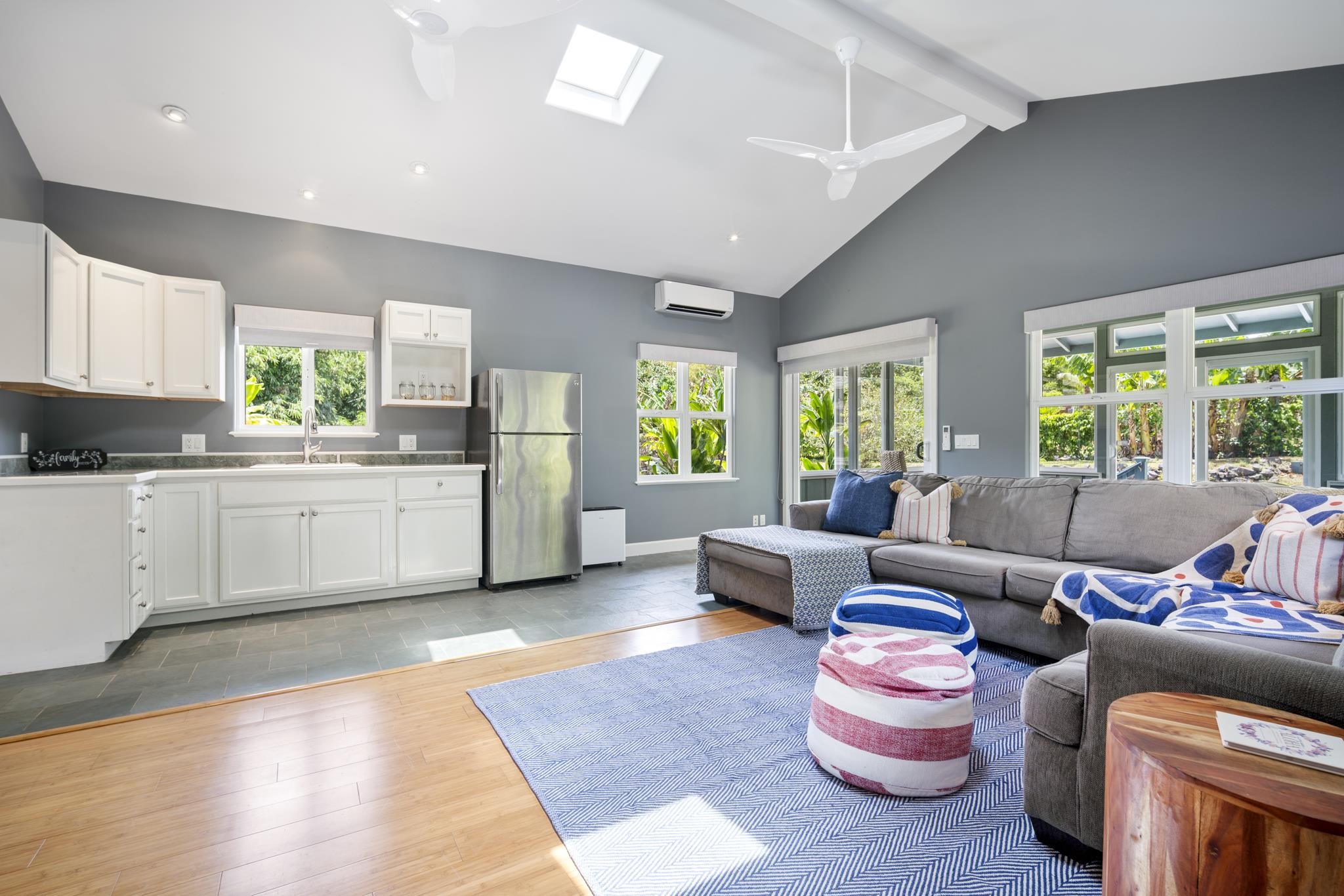 Discover the perfect blend of sustainability and modern luxury at this exceptional Haiku estate. Set on over two acres of lush tropical land, the property features a 4-bedroom, 3-bath main home (2,744 sq ft) and 3-bedroom, 2-bath ohana (1,000 sq ft). On the first floor in the main house the primary suite features a luxurious modern ensuite bathroom and walk in closet, and upstairs there are three bedrooms and a bathroom. There is also a separate mother-in-law suite, with a beautiful sunroom looking out on the fruit & vegetable gardens, with its own kitchenette. This suite can also serve as a large family room for everyone. Both homes are equipped with net-metered solar power systems, and the main house includes two Tesla Powerwall batteries, significantly reducing utility costs. Split AC systems in both homes provide year-round comfort. A gardener’s dream, the property boasts a 1,100 sq ft greenhouse and over 100 mature fruit trees including mango, avocado, citrus, cacao, lychee, and coconuts. Chicken and duck coops, a beehive, and a peaceful duck pond support a self-sufficient lifestyle, while an outdoor fire pit adds charm and more space for entertaining. Walking the grounds, you’ll find thoughtfully designed outdoor spaces perfect for relaxation or gatherings beneath the stars. Paths wind through abundant gardens, leading to shaded nooks and sunny patios, all framed by the gentle sway of palms and the sweet scent of plumeria and puakenikeni. The estate’s layout seamlessly balances communal areas with pockets of solitude, making it easy to envision quiet mornings with coffee or festive evenings surrounded by friends and family. Enjoy quiet privacy with convenience: just 7 minutes to Haiku and Makawao, 15 minutes to Ho’okipa Beach, and 25 minutes to Costco and the Airport. Whether you’re seeking a serene retreat, multigenerational living, or a self-sustaining homestead, 1865 Kalia Way offers an unparalleled opportunity to embrace Maui’s beauty and bounty. Call your favorite Realtor today to book a showing.
