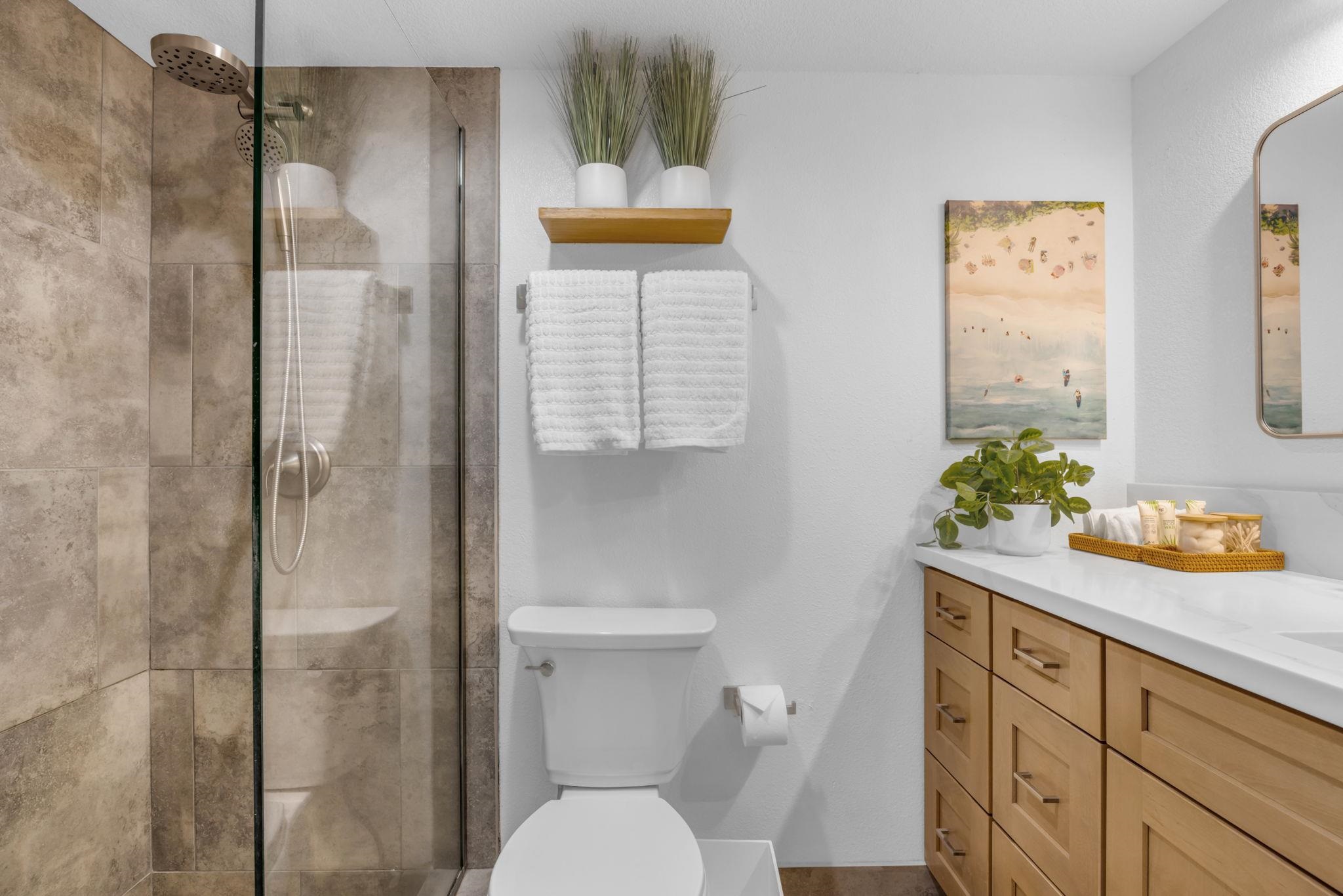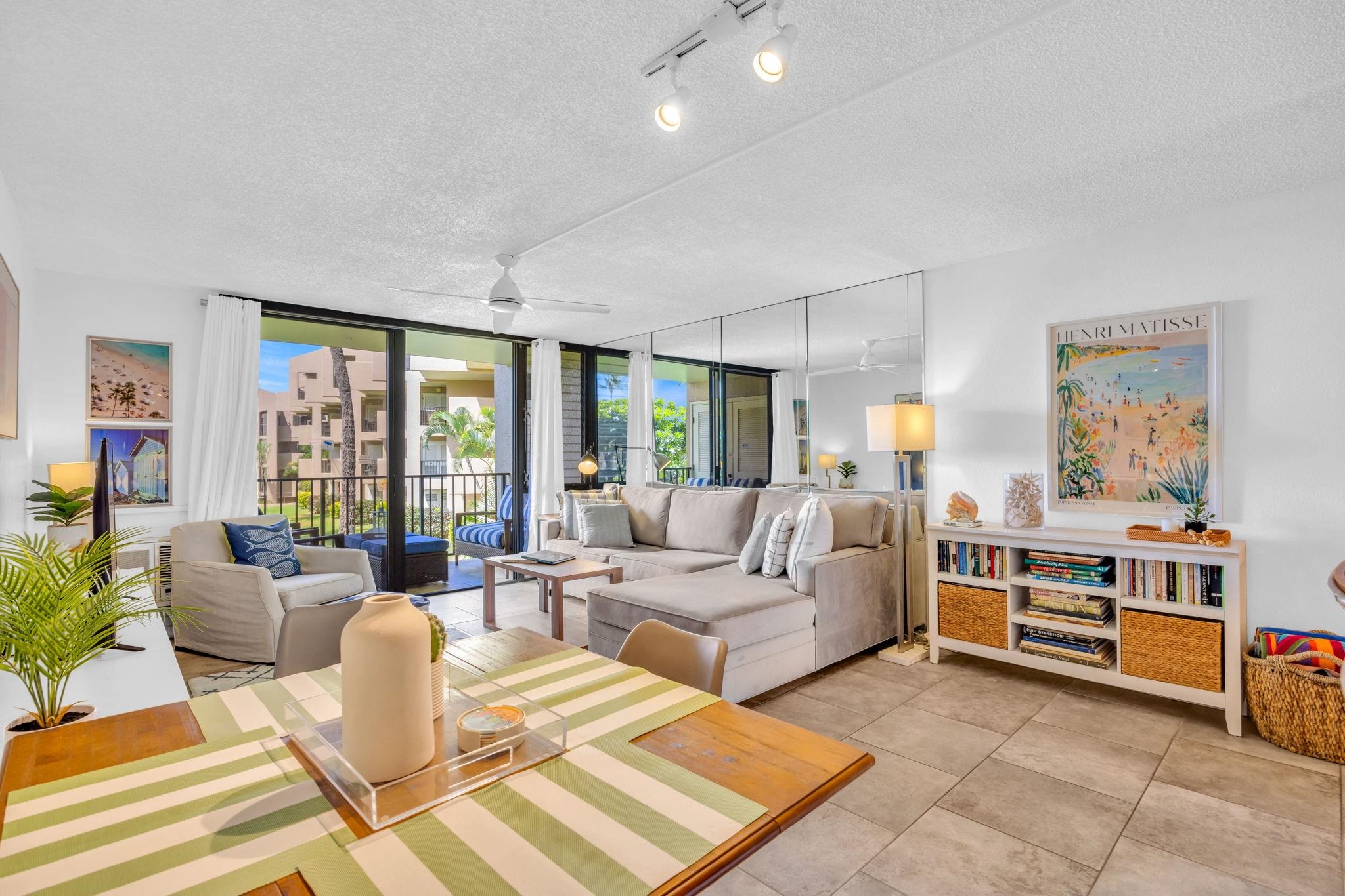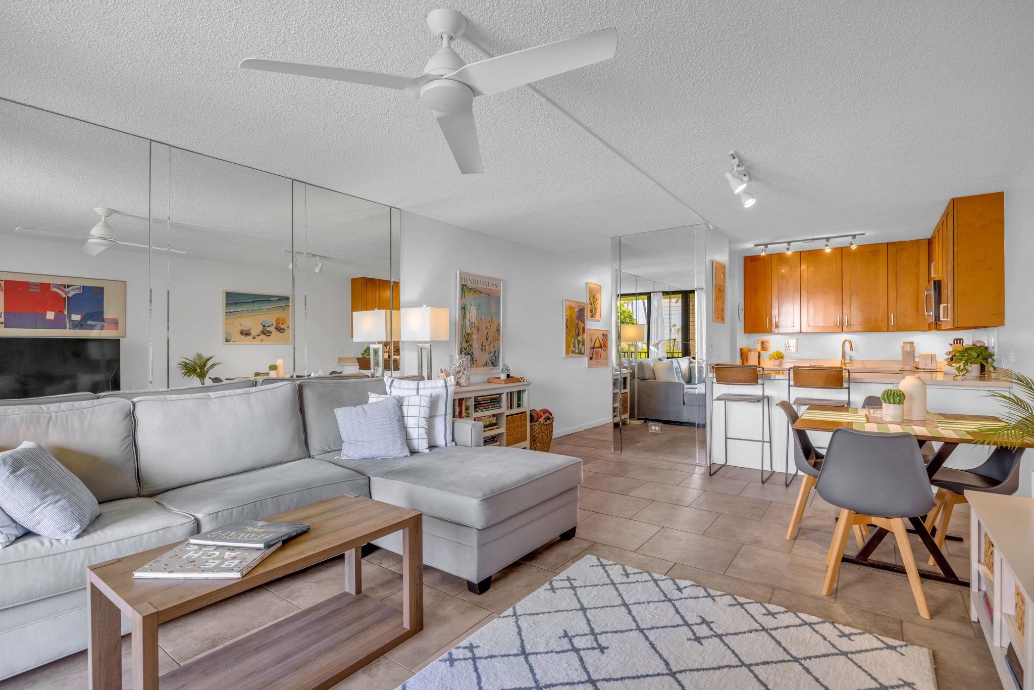 Welcome to Kamaole Sands 5-214, a beautifully upgraded 1-bedroom, 2-bathroom condominium in the heart of South Kihei. This thoughtfully maintained unit features a peekaboo ocean view and a host of recent renovations, including all-new kitchen appliances (2024), quartz countertops with a deep stainless-steel sink, and updated plumbing with nickel hardware. The bathrooms showcase custom vanities with quartz sinks (2024) and raised toilets, while the bedroom offers a plantations shutters, new closet and flooring (2022), plus a brand-new dresser and side tables (2025). A high-end sleeper sofa (2022) ensures extra comfort for guests. Nestled in a prime location, Kamaole Sands sits across the street from Kamaole Beach Park III and within walking distance to Kamaole I and II, as well as shops and restaurants. Residents enjoy elevators for convenience, a lush inner courtyard with blooming plumeria trees, fountains, and a garden walkway to the beach. Resort-style amenities include 2 tennis courts, 3 pickleball courts, a beautiful pool with two spas, barbecue areas, and weekly Hawaiian music and hula performances. Seasonal highlights include ocean talks from the Maui Ocean Center, plus an AOAO surfboard/kayak rack with assigned spaces for ocean enthusiasts.This turnkey condo offers the perfect blend of modern upgrades and island living.
