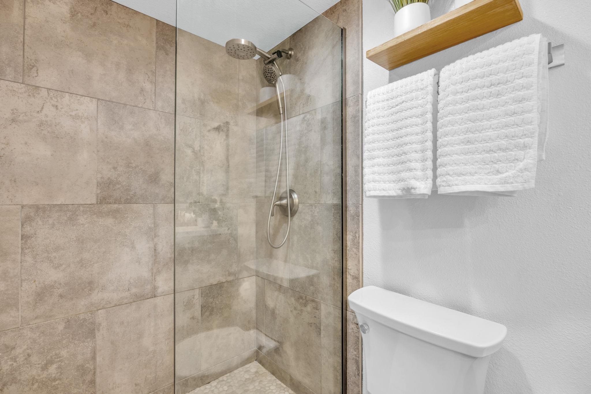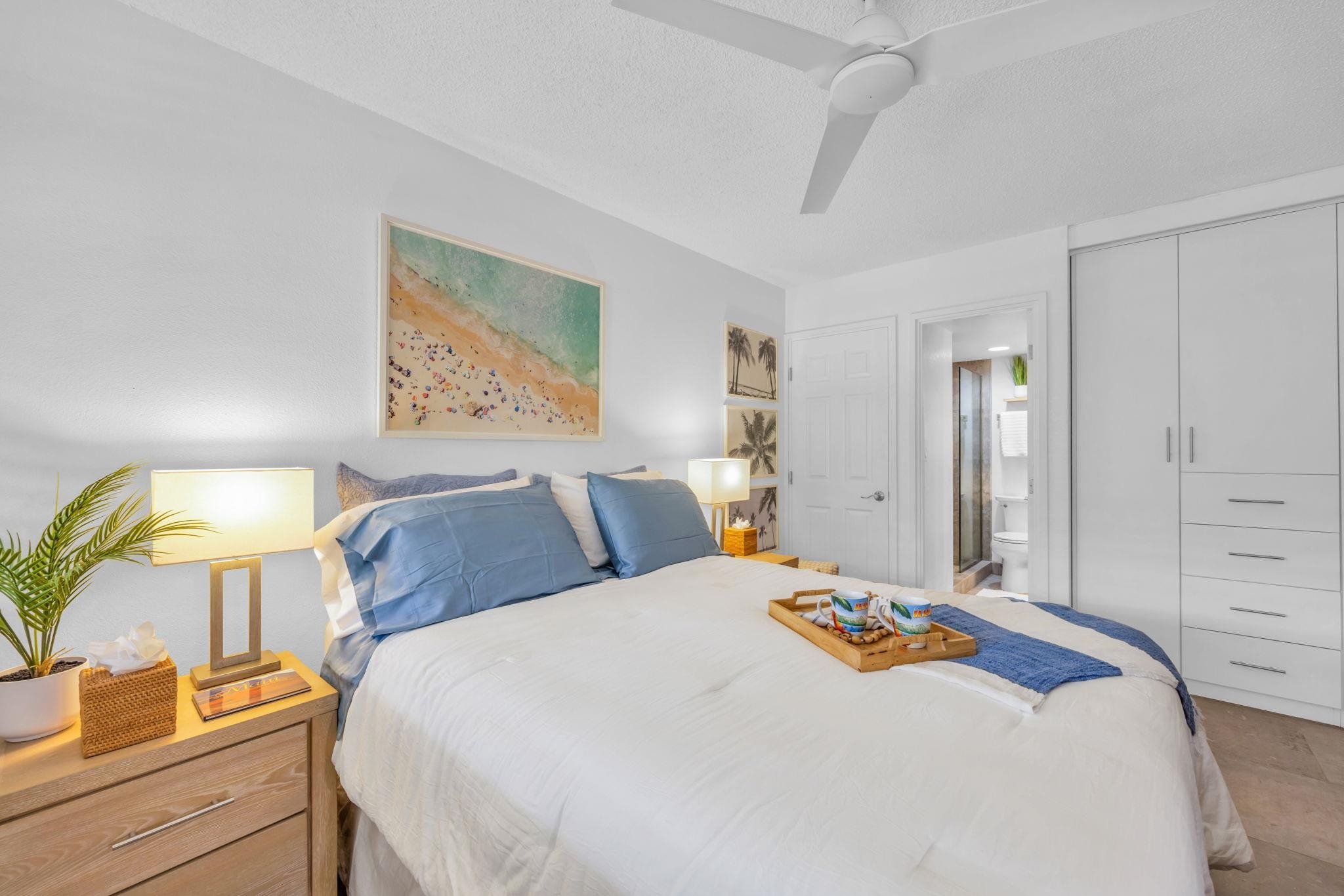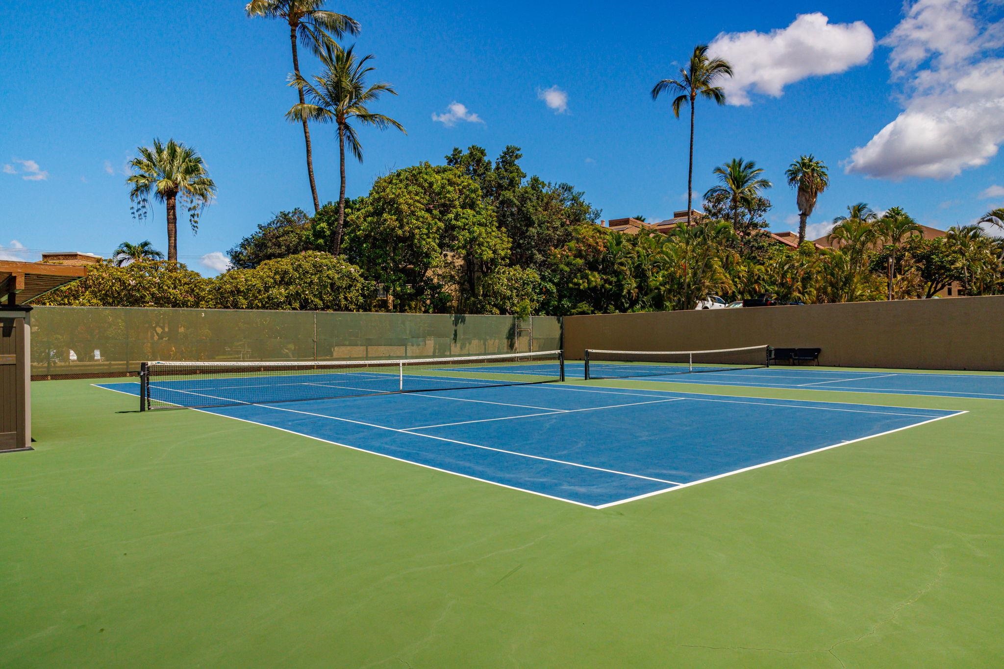 Welcome to Kamaole Sands 5-214, a beautifully upgraded 1-bedroom, 2-bathroom condominium in the heart of South Kihei. This thoughtfully maintained unit features a peekaboo ocean view and a host of recent renovations, including all-new kitchen appliances (2024), quartz countertops with a deep stainless-steel sink, and updated plumbing with nickel hardware. The bathrooms showcase custom vanities with quartz sinks (2024) and raised toilets, while the bedroom offers a plantations shutters, new closet and flooring (2022), plus a brand-new dresser and side tables (2025). A high-end sleeper sofa (2022) ensures extra comfort for guests. Nestled in a prime location, Kamaole Sands sits across the street from Kamaole Beach Park III and within walking distance to Kamaole I and II, as well as shops and restaurants. Residents enjoy elevators for convenience, a lush inner courtyard with blooming plumeria trees, fountains, and a garden walkway to the beach. Resort-style amenities include 2 tennis courts, 3 pickleball courts, a beautiful pool with two spas, barbecue areas, and weekly Hawaiian music and hula performances. Seasonal highlights include ocean talks from the Maui Ocean Center, plus an AOAO surfboard/kayak rack with assigned spaces for ocean enthusiasts.This turnkey condo offers the perfect blend of modern upgrades and island living.