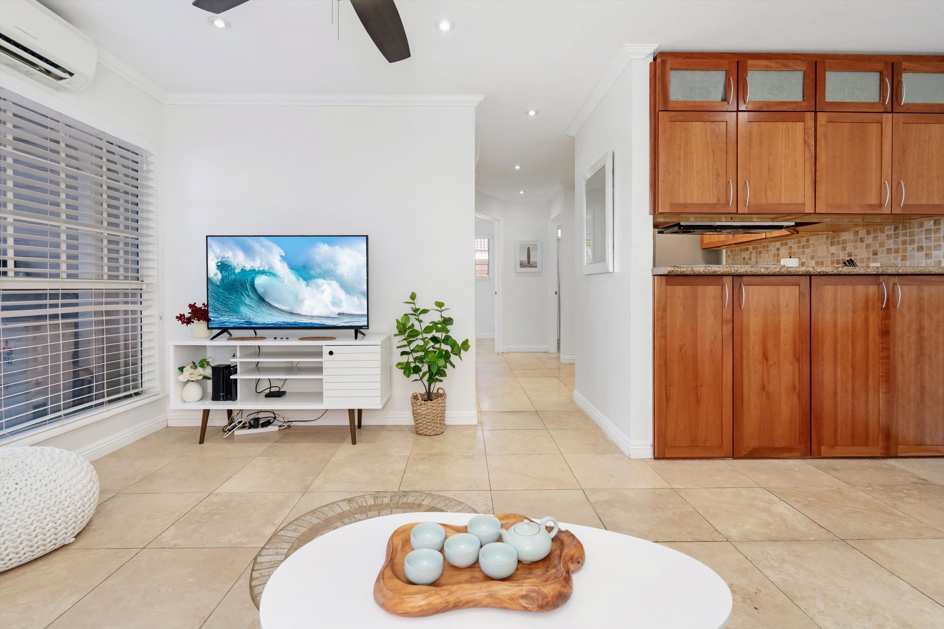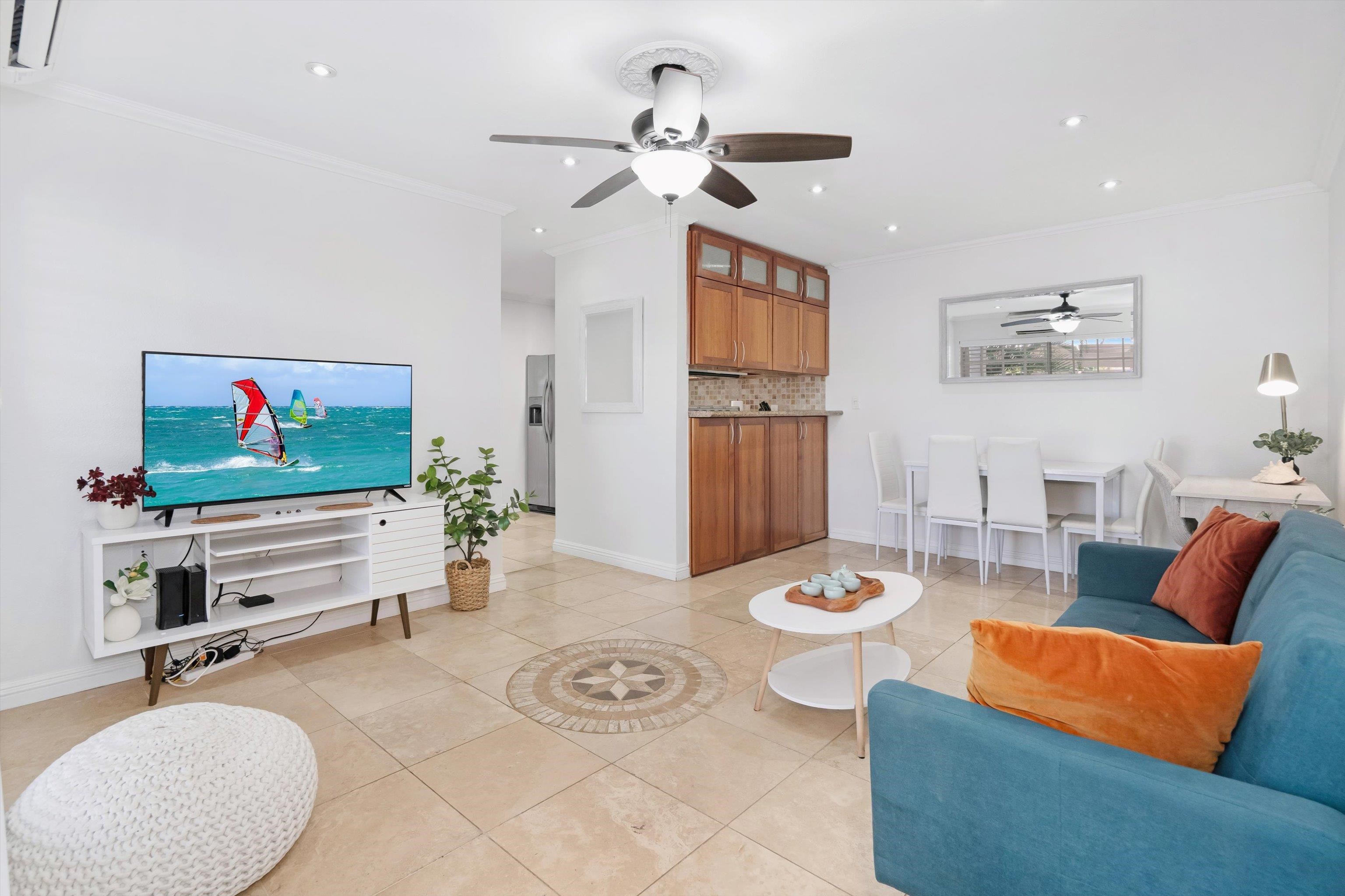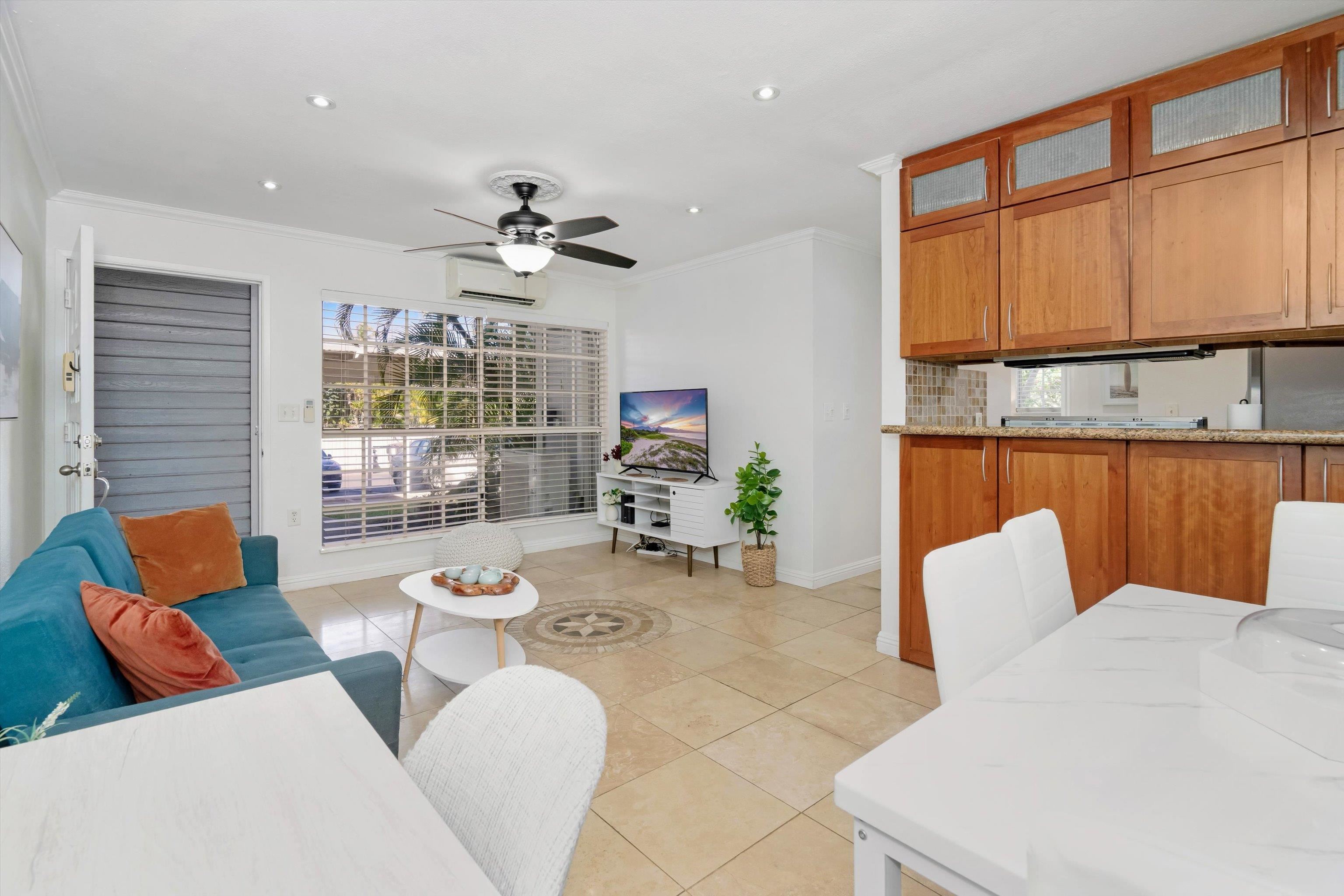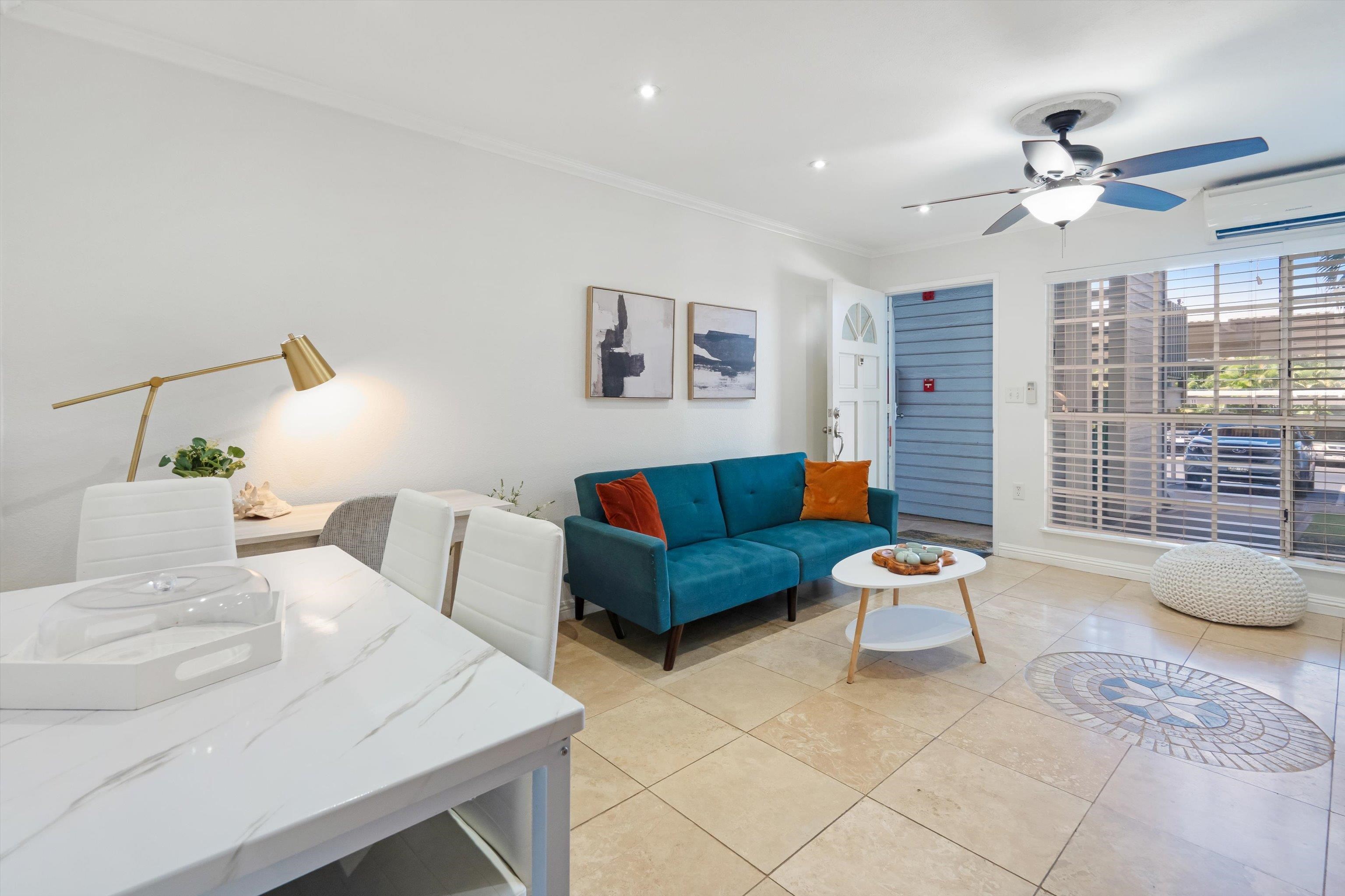 Escape to paradise with Keonekai Villages Unit 14-101, a beautifully appointed 2-bedroom, 1-bathroom ground-level condo located across from the breathtaking Kamaole Beach Park III in Maui, within walking distance to the wonderful Kamaole beaches, renowned as the best sunset-watching area in Maui. Keonekai is also the southern most Kihei neighborhood before entering into Wailea where there is a mall, shops, and amazing restaurants. This move-in-ready gem features travertine tile flooring throughout, freshly painted walls, and modern lighting, creating a fresh and contemporary vibe. The updated kitchen shines with style and functionality, while the bathroom boasts a sleek, tiled shower. Stay comfortable year-round with split AC in every room, and enjoy the convenience of a fully furnished unit. The property includes two parking stalls (263 + 264) –1 covered and 1 uncovered–for added convenience. With low maintenance fees compared to other Maui complexes and situated outside the special flood area, this condo is a rare find. Just 26 minutes from the airport, this coastal retreat is easy to show and ready for you to make it your own!