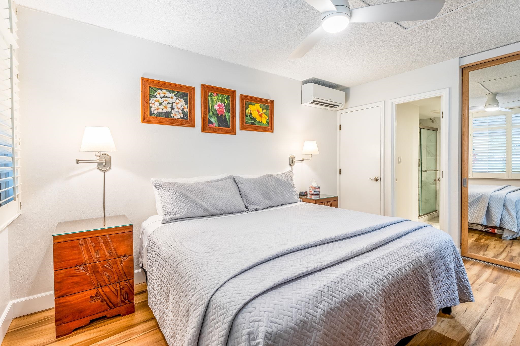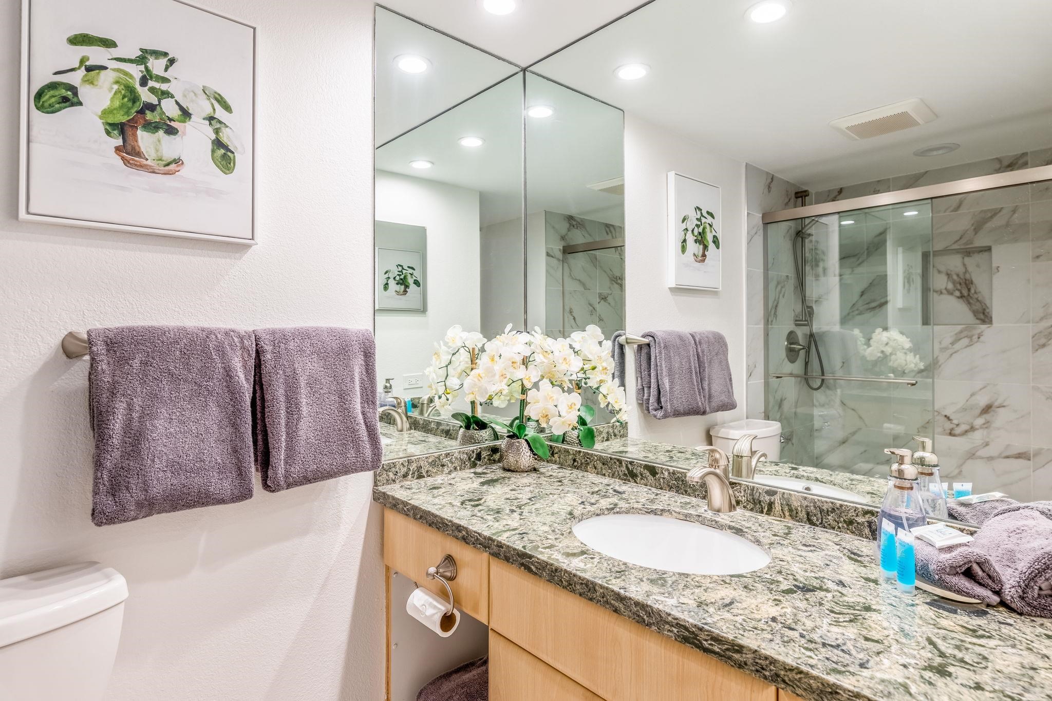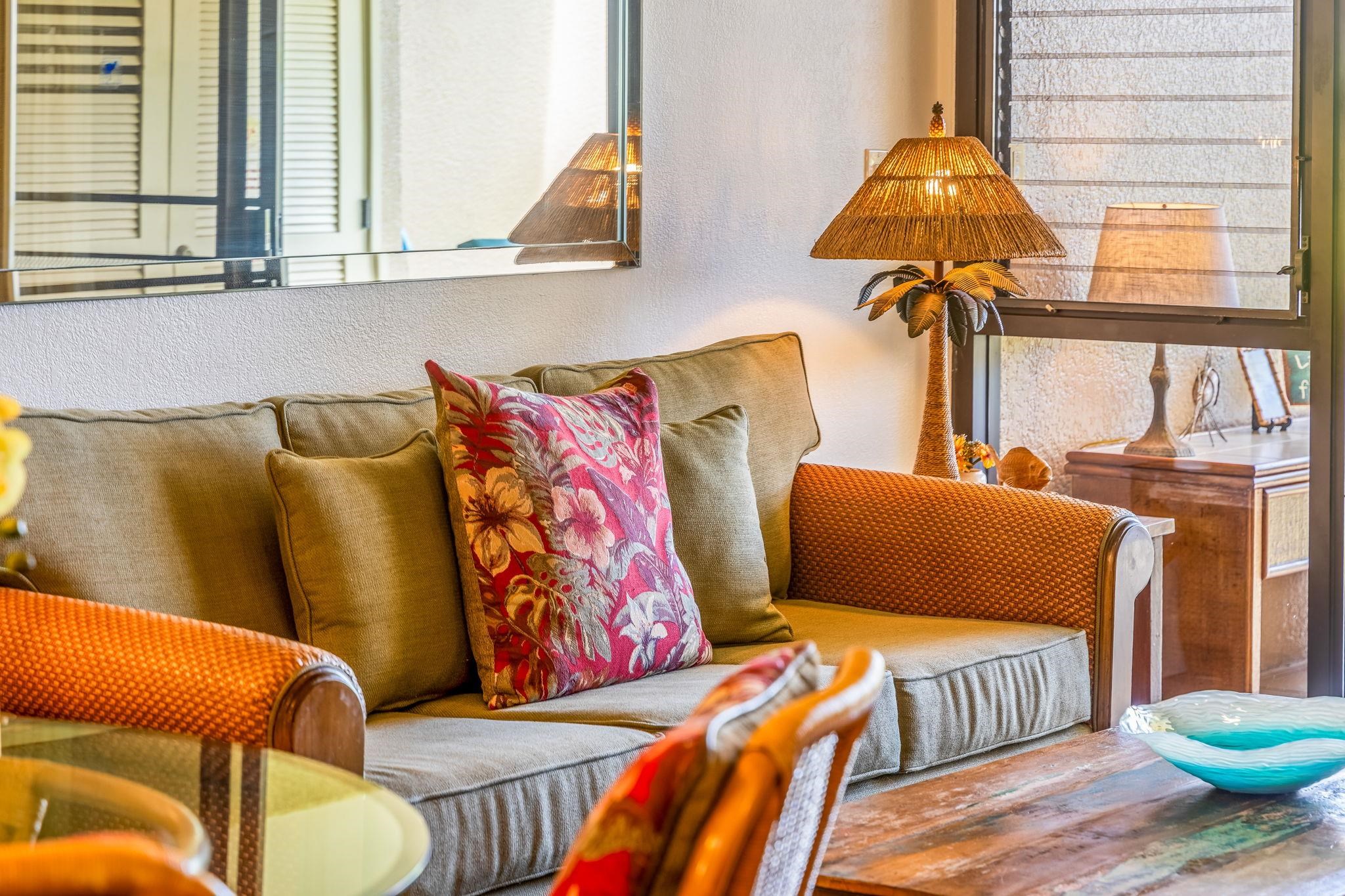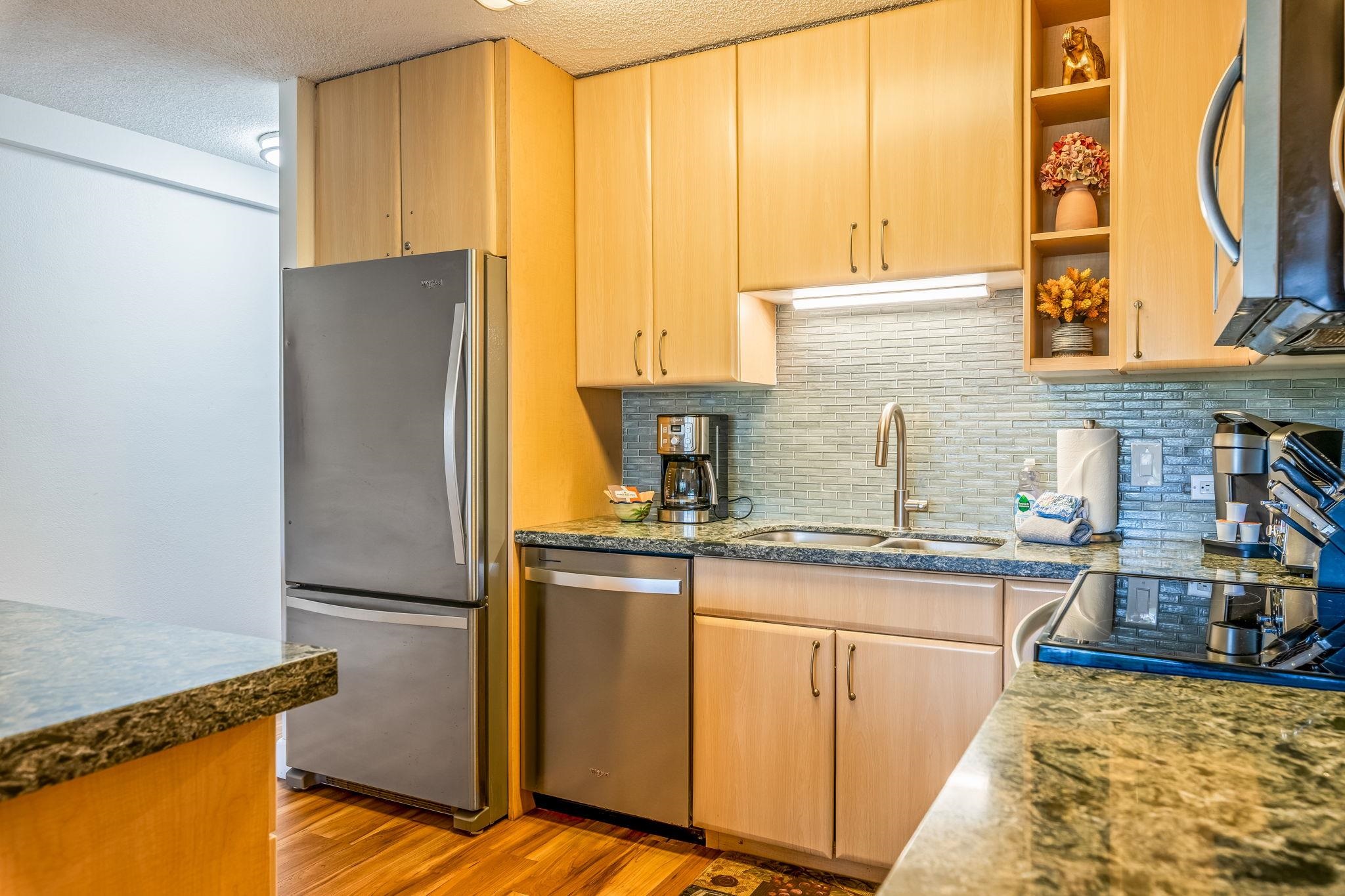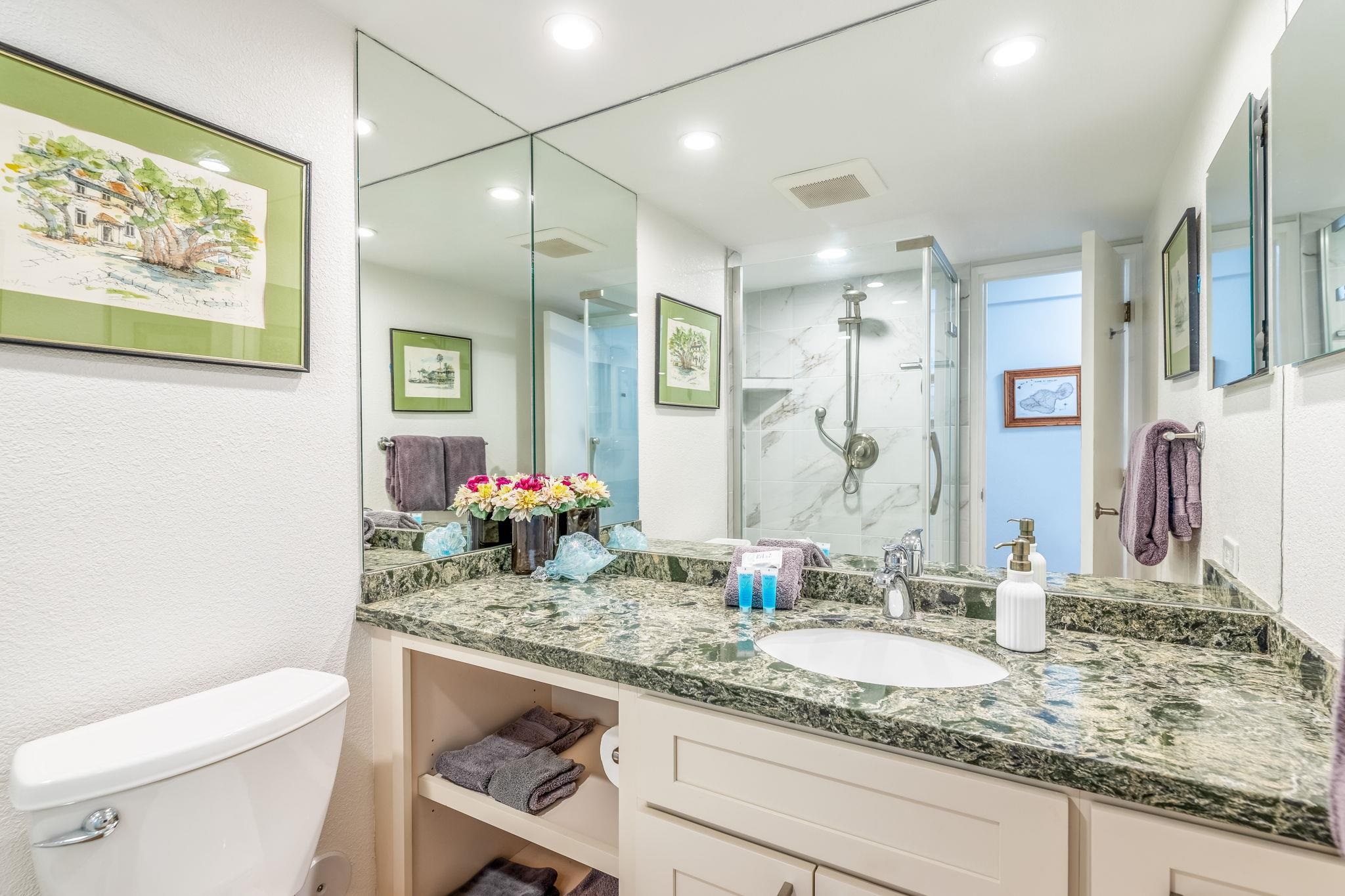 Nicely updated, turnkey and priced to sell! This 1 bedroom, 2 bathroom condo at Kamaole Sands features ground floor convenience, a large lanai with an inner court picturesque location, and close proximity to the pool with beautiful garden views. The condo has been a guest favorite with features including easy access to the pool and BBQ area's, luxury vinyl laminate flooring, cabinetry with granite counters, dual split system AC, stainless steel kitchen appliances, a well equipped kitchen, nicely renovated showers, and a full sized washer and dryer. The condo is being sold furnished and is turnkey. Located just steps away from Kamaole Beach Park III, makes this condo an ideal location. Resort amenities include a children’s wading pool, an adult and family hot tub, fitness room, ping pong table, gas BBQ area's throughout the resort, 3 pickle ball courts and 2 tennis courts. Kamaole Sands is an extremely popular resort, as the condo is within walking distance to restaurants, shops, and a number of great beaches in South Kihei.
