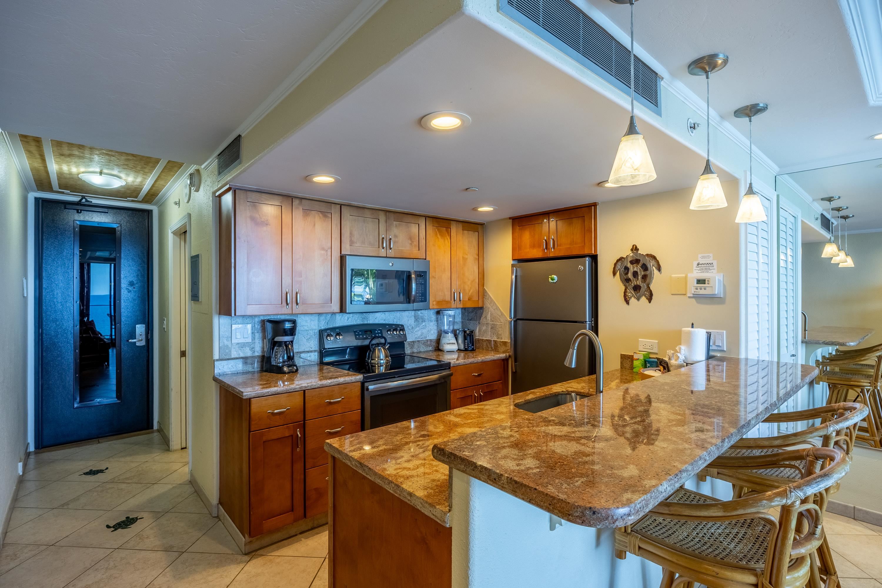 Welcome to Mahana at Kaanapali, an exclusive oceanfront resort nestled in the heart of Maui's stunning Kaanapali coast. Studio #612, located on the 6th floor, offers expansive, panoramic views of the ocean. This beautifully designed unit features a fully equipped kitchen, cozy amenities, private lanai, and the option of refreshing Tradewinds or Central Air Conditioning to keep you cool. The Mahana is zoned for hotel use, making it an ideal vacation getaway or investment. Resort amenities include open parking, a welcoming front desk, an oceanfront pool, tennis courts, shuffleboard, and easy access to the famous Beachwalk, which winds through the best of Kaanapali. With its unbeatable combination of natural beauty, modern comforts, and upscale amenities, Mahana at Kaanapali delivers a truly extraordinary vacation or living experience.