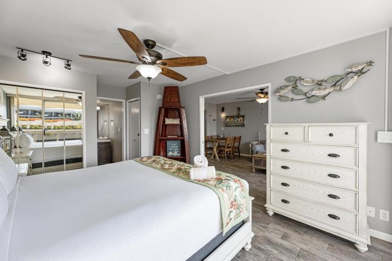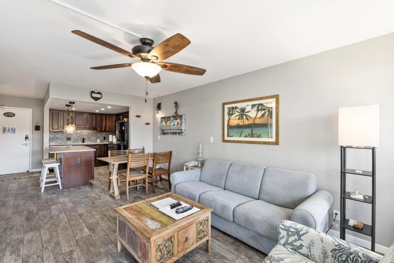 Centrally located on the south side of Maui and just across the street from Kamaole Beach Park II with nearby restaurants and shopping and minutes from Wailea. The Maui Banyans condominium offers two pool areas each with jet spas, barbeque grills and covered entertain area with tables and chairs. After a day at the beach, you can relax in comfort in a fully furnished, recently updated one bedroom two full bath condo. Tile flooring throughout, updated kitchen with all the amenities. You’ll enjoy the beautiful sunset and ocean view from the covered lanai. Condo features, king bed, Italian Revers modern sofa sleeper along with some local artwork and designer pieces.