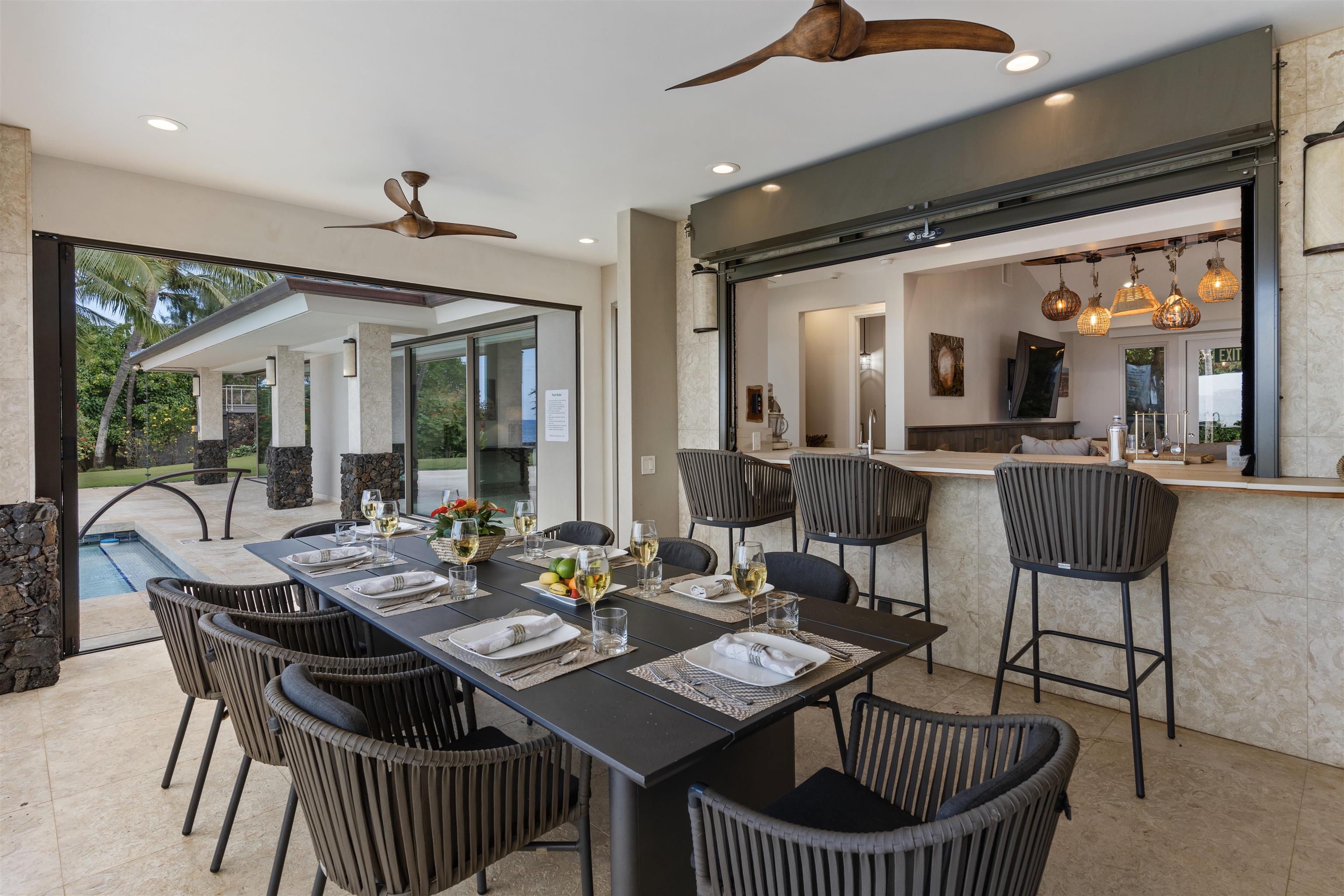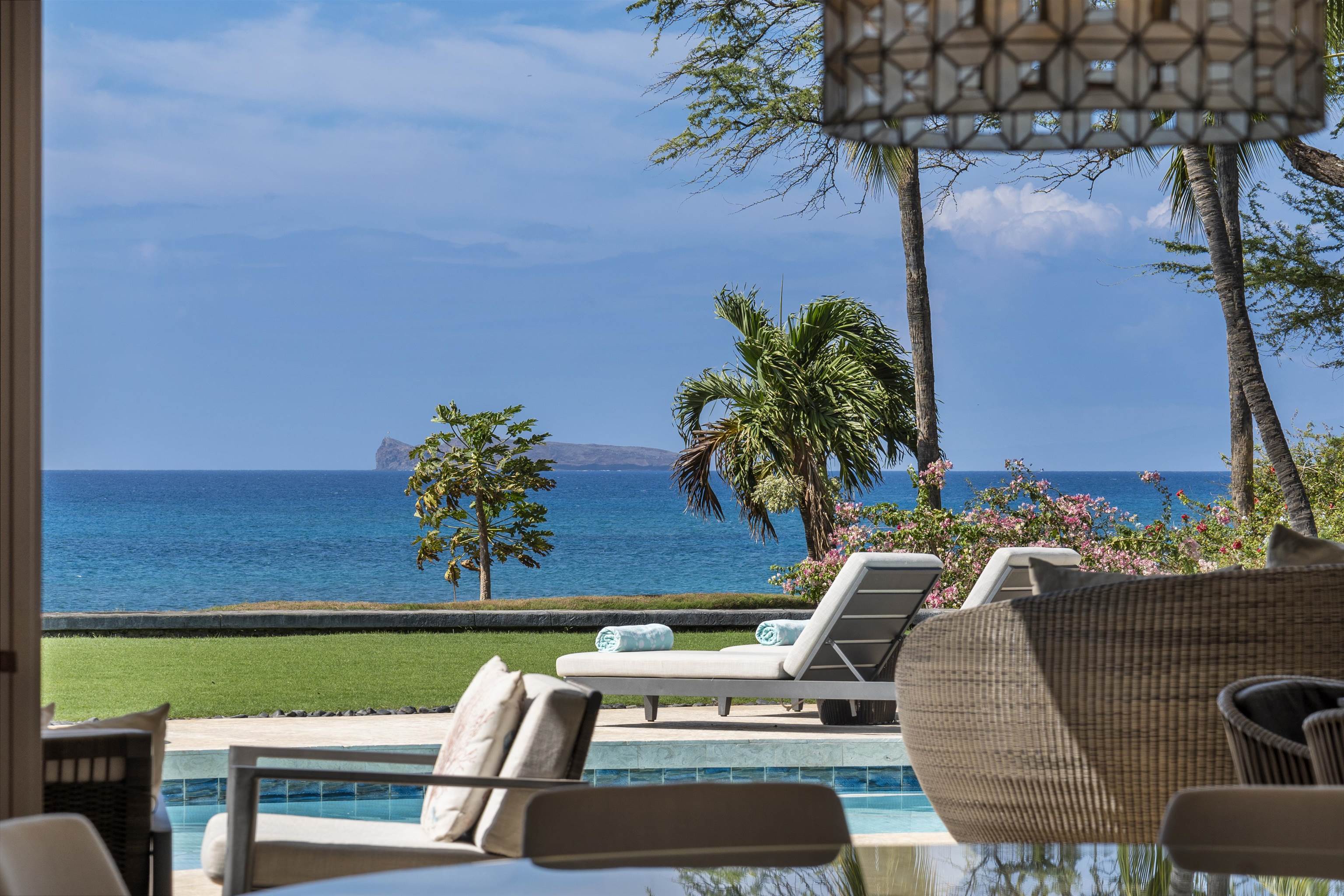 Tranquility. Exclusivity. Privacy. All are embodied within this ultimate ocean-lovers retreat in Makena on Maui’s coveted south shore. With incomparable panoramic ocean views spanning all the way to the sandy Big Beach shoreline, every aspect of this one-of-a-kind property is oriented to delight in the ever-changing palette from sunrise to sunset into the starry night sky. Situated on just over an acre of land on a natural promontory, easy ocean access in a sandy cove lies just outside the front entry gate. Meticulously renovated top to bottom in 2020, Makena Kai is the quintessential Maui beach home from the vibrant blue Monier tile roof to the imported Shells Reef limestone tile underfoot. Filled with natural light and ocean breezes, retractable sliding glass walls create a seamless transition between the indoor and outdoor living, dining, and relaxation spaces. The custom Tervola chef’s kitchen is an art piece featuring alder wood cabinetry, Thermador appliances, and quartzite countertops. Chic accent lighting throughout highlights the expansive avocado wood slab breakfast bar with inlays of backlit sea glass. A separate avocado burl wood bar near the pool makes outdoor entertaining effortless. All four of the bedrooms feature ensuite baths with Porcelanosa tile flooring, and the downstairs baths enjoy individual lava rock outdoor showers. With each suite uniquely styled for comfort and elegance, the beach-inspired design details create a modern coastal ambiance. Dual primary suites on the ground and second floor showcase vaulted ceilings, walk-in closets, and spa bathrooms with freestanding soaking tubs. Crafted with recreation at the forefront, Makena Kai offers a media room, yoga/reading room, and an air-conditioned home gym area. Technological sophistication is evident with photovoltaic solar panels, fiberoptic internet, and a security system. In addition to the outdoor heated pool, there are two jacuzzi hot tubs and a professionally-designed putting green, complimented by a hammock and palapa for relaxing and reveling in the year-round spectacular sunset views. Located just a few homes outside the Ahihi-Kinau Natural Area Reserve, one can observe humpback whales and bountiful marine life directly out front in the channel between Kahoolawe and Molokini Crater, all from the comforts of this private oasis. Discover the exquisite artistry and unique details that define the Makena Kai estate, and indulge in a Maui lifestyle that is nothing short of a dream.