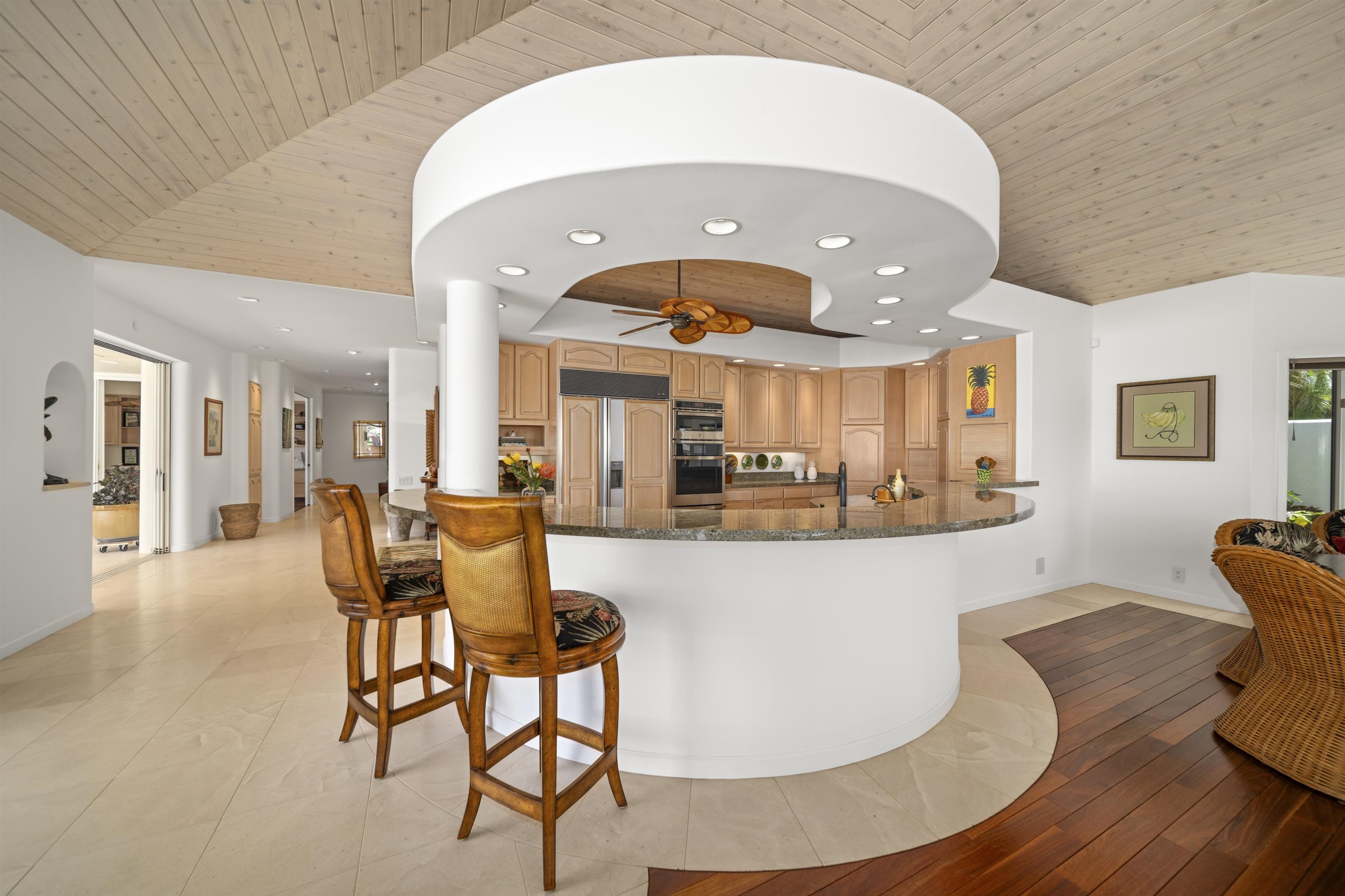 Ideally positioned near the top of an exclusive cul-de-sac in one of Wailea’s most desirable gated communities, 206 Heleuma Place captures the essence of refined Hawaiian island living. Gentle trade winds drift through open, airy interiors where ocean views shimmer beyond the poolside lanai. This warm, single-level retreat spans over 3,100 square feet, seamlessly blending three bedrooms and two and a half baths with inviting outdoor spaces–creating an effortless flow that expands the home’s livable footprint and celebrates the art of indoor-outdoor living. Perfectly situated within moments of Wailea’s world-class beaches, fine dining, and championship golf courses, the property is also eligible for membership to the exclusive Wailea Golf Club, offering an exceptional lifestyle that embodies the very best of South Maui. At the heart of the home, an open-concept kitchen and living area transition effortlessly to the covered lanais. Distinctive design elements–such as curved countertops, seamless flooring transitions, and an innovative indoor-outdoor bar–blur the boundaries between interior comfort and open-air living. With the expansive sliding glass doors open, the bar becomes a dynamic gathering space, creating a full-circle connection that invites effortless entertaining. The primary suite enjoys tranquil views of the pool and features a spa-inspired bathroom with dual vanities, a spacious walk-in closet, and a private outdoor shower framed by lush tropical foliage. The guest suite offers its own convenient en suite bath and a custom Murphy bed, providing both comfort and versatility for visiting guests or flexible use of space. The resort-style pool and spa are framed by lush tropical landscaping along the greenbelt, creating both beauty and privacy. Soft curves, natural textures, and the home’s deliberate avoidance of sharp lines foster a sense of calm that mirrors Maui’s gentle rhythm. From this serene vantage point, sunsets glow across the Pacific and starlit skies emerge over the horizon–an idyllic backdrop for evenings spent in quiet reflection or effortless entertaining.