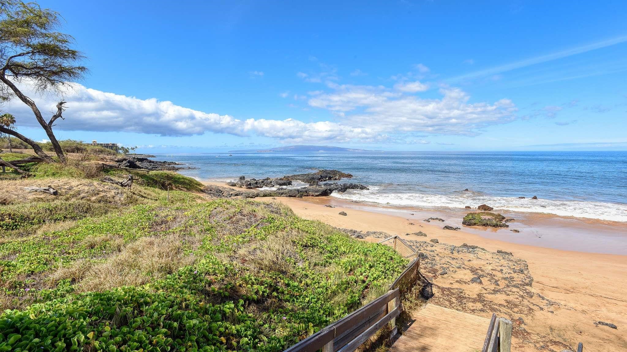 Discover the perfect opportunity to own a highly sought after 2 bedroom, 2 bathroom condominium in South Kihei's premier location. Haleakala Shores A-309 is ideally positioned just one block from the world famous golden sands of Kamaole Beach Park III, renowned for excellent snorkeling, calm swimming, and spectacular sunsets. The spacious floor plan is designed for maximum comfort and privacy, easily accommodating two couples with two distinct king sized bedroom suites. The main primary bedroom offers a serene retreat with an en-suite bathroom featuring a large walk in shower and pedestal sink, while the generous guest suite also includes a king-sized bed, lanai access via sliding glass doors, and a separate full guest bathroom with a walk in shower and bench. No detail is overlooked in this turn key offering including a washer and dryer. The main living area seamlessly connects the living room, dining space, and a fully equipped kitchen, creating a great room atmosphere perfect for entertaining. The kitchen boasts everything needed for preparing your favorite meals, with the option to utilize the community BBQ area with gas grills. Enjoy your meals al fresco on the covered lanai, which offers lovely views of the lush resort gardens and Haleakala. Amenities enhancing the property include large flat-screen cable TV, a DVD player, CD player, and free high-speed Wi-Fi access. The Haleakala Shores community provides a beautiful community pool, sun deck, covered lounge area, dining areas, and tropical garden grounds. The location is highly walkable, placing you close to popular local restaurants, shopping, and easy driving distance to world-class golf courses in Wailea and Makena. Haleakala Shores A-309 is the ideal blend of convenient location, resort style amenities, and spacious living, making it the perfect offering on the Maui real estate market.