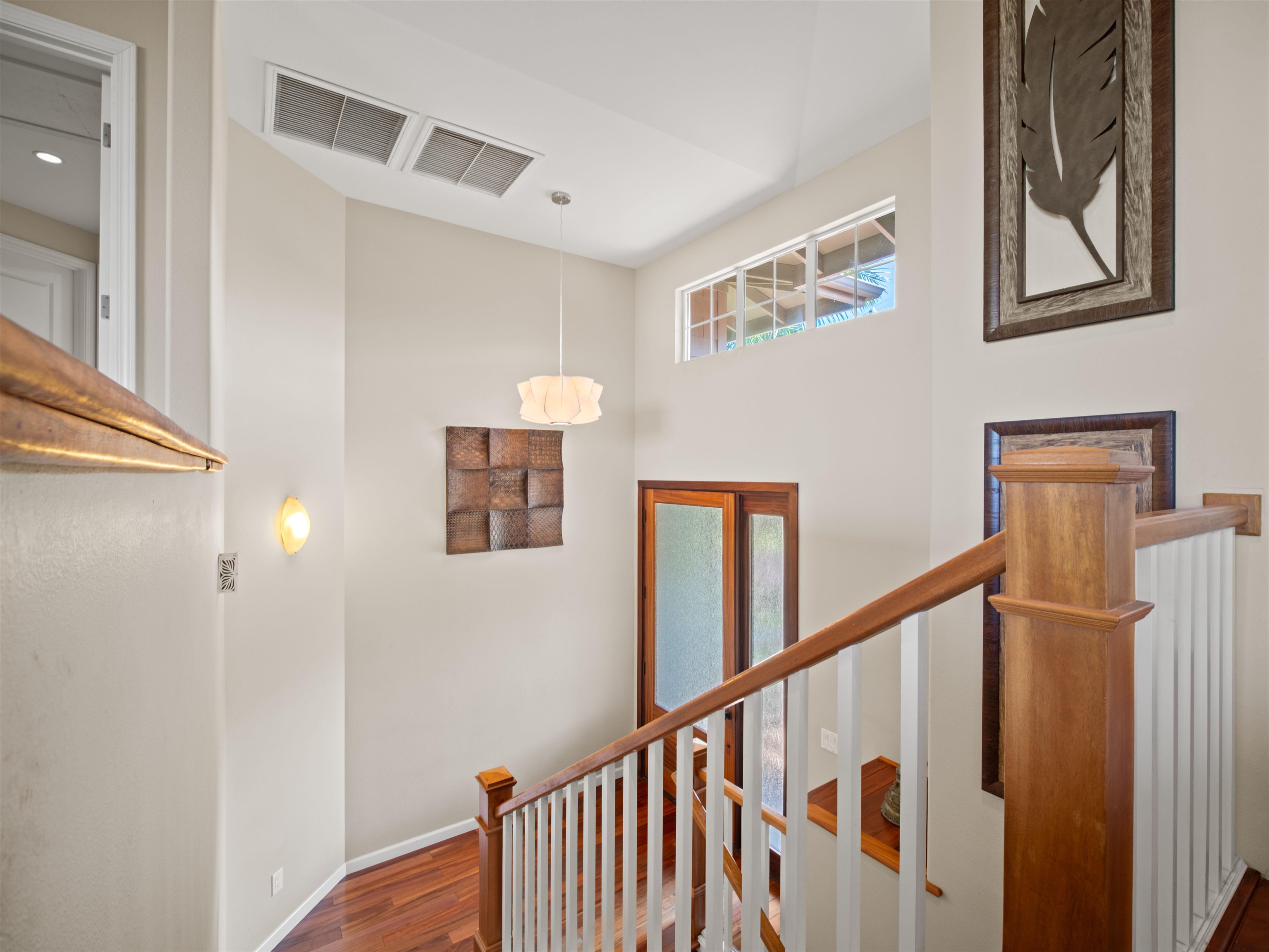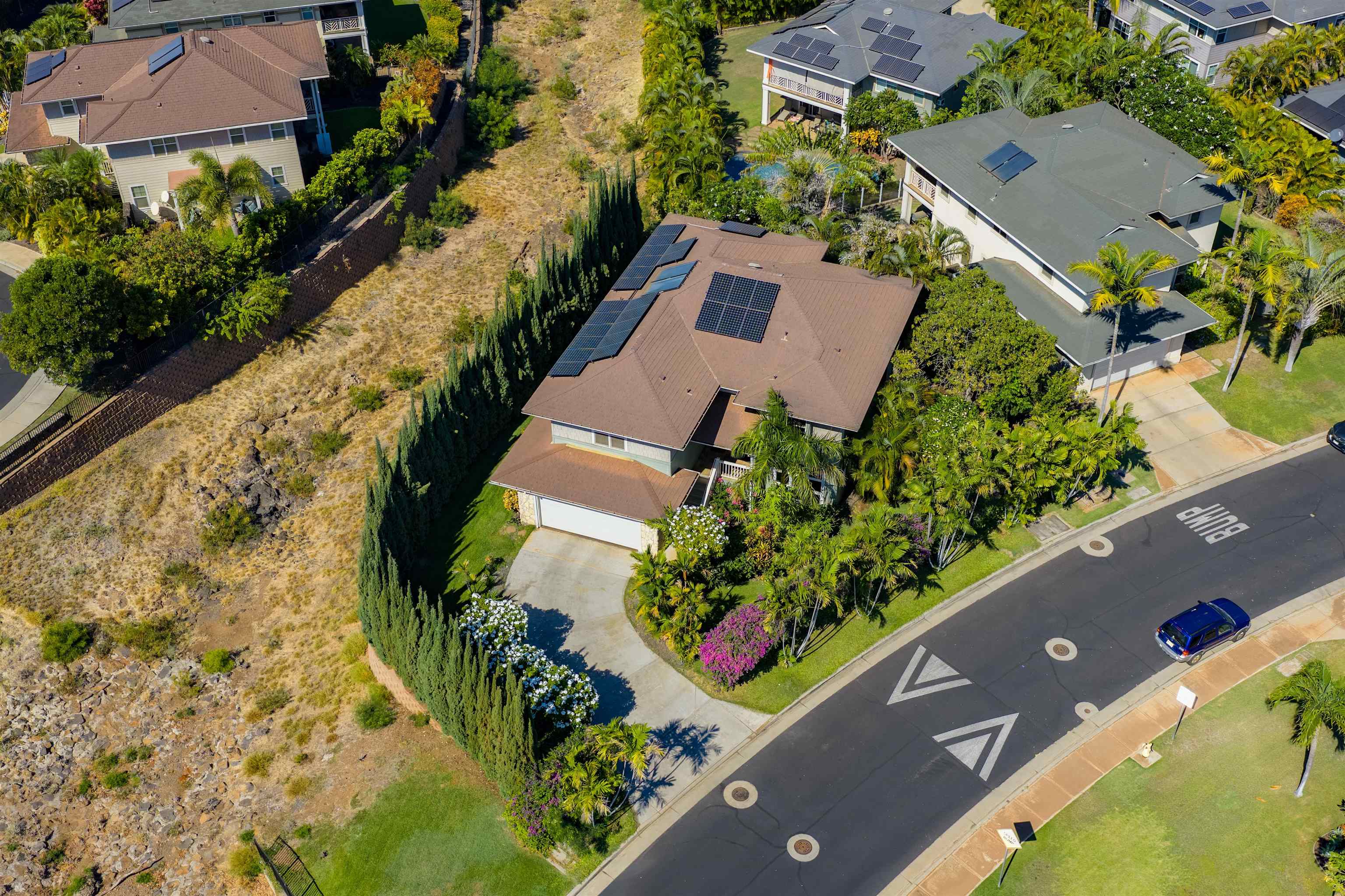 Nestled in the desirable Moana Estates w/ an Oceanview! Just a short drive from Wailea, Kihei, and South Maui’s pristine beaches, 94 Laukahi is a breathtaking 4-bedroom, 3-bathroom residence with a versatile bonus room. Positioned on a tranquil corner lot with only two neighboring properties, this home offers unparalleled privacy and mesmerizing views of Haleakala Mountain and vibrant ocean sunsets from both the lanai and living areas. The gentle trade winds enhance the seamless indoor-outdoor Maui lifestyle, creating a refreshing and peaceful atmosphere perfect for those craving a calm island escape. Enter through the impressive front entrance to discover elegant tigerwood flooring that flows upstairs into the spacious main living space. The modernized kitchen, ideal for both everyday dining and hosting, features sleek granite countertops and stainless steel appliances. A convenient laundry room is equipped with a stylish black steel front-loading washer and dryer. Built with sustainability in mind, the home boasts 27 owned solar panels for low electricity costs and a garage with two EV charging stations. The private, fully irrigated yard is a tropical haven, adorned with Italian cypress, fruit-bearing avocado, tangerine, and orange trees, alongside aloe vera, ginger, and fresh herbs. Vibrant lipstick palms and plumeria trees complement the lush setting, while a volcanic rock wall ensures seclusion and a deep connection to nature. The expansive bedrooms prioritize comfort with plush carpeting and generous closet space, and each ground-floor bedroom opens directly to the backyard lanai, blending indoor and outdoor living effortlessly. This home is well built and low maintenance materials such as cement board siding. From the lanai, savor stunning Pacific sunsets that paint the sky nightly, offering a serene and convenient retreat that perfectly balances relaxation and accessibility in an extraordinary island home.