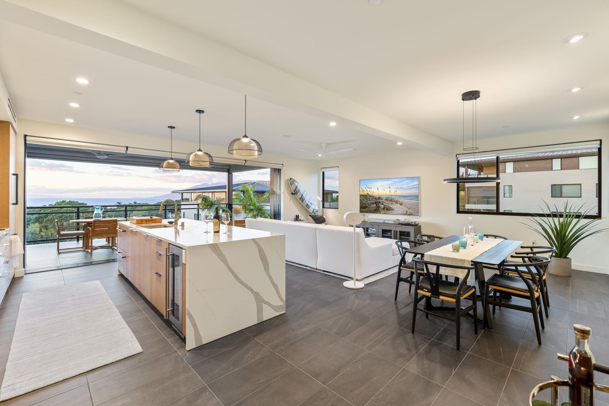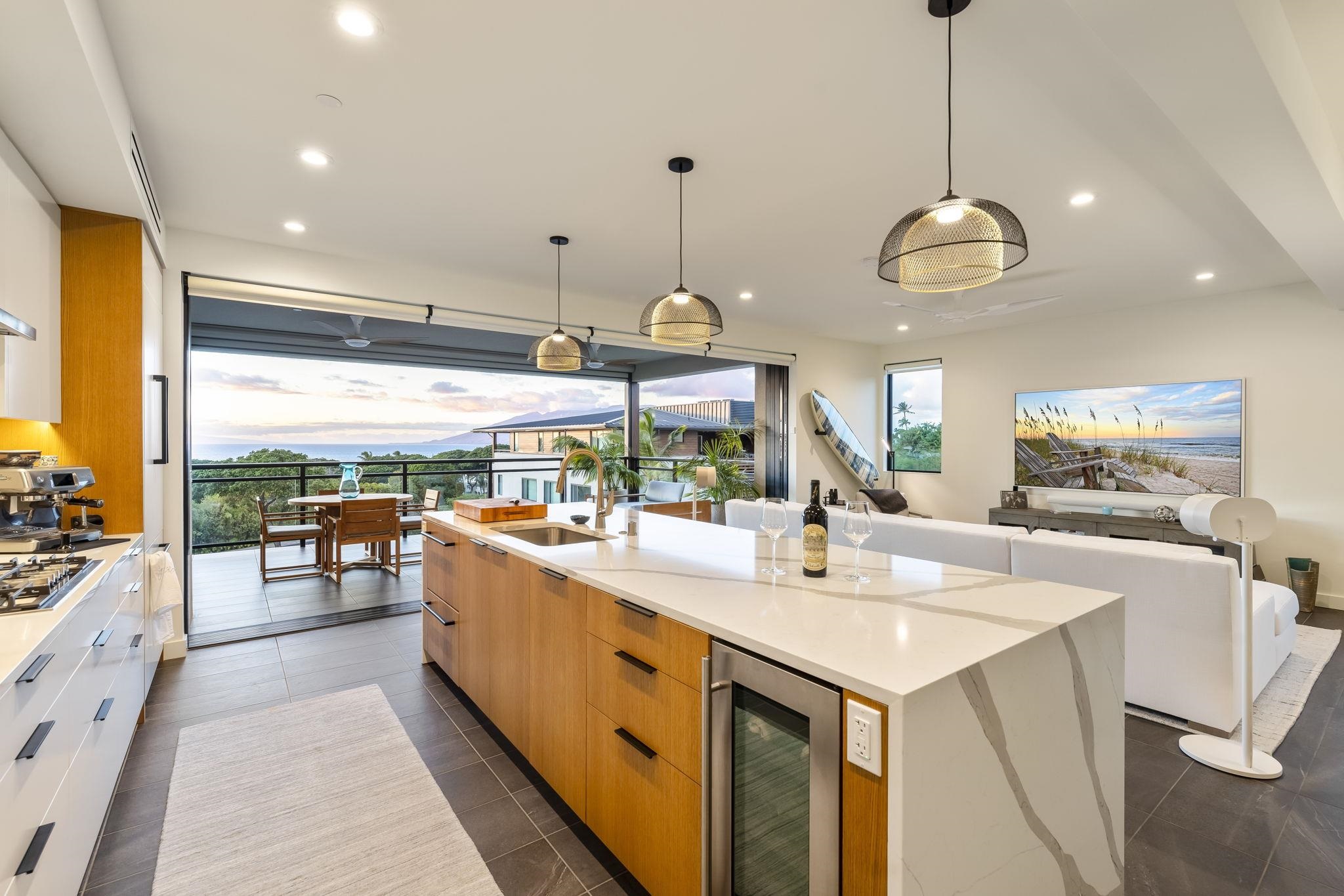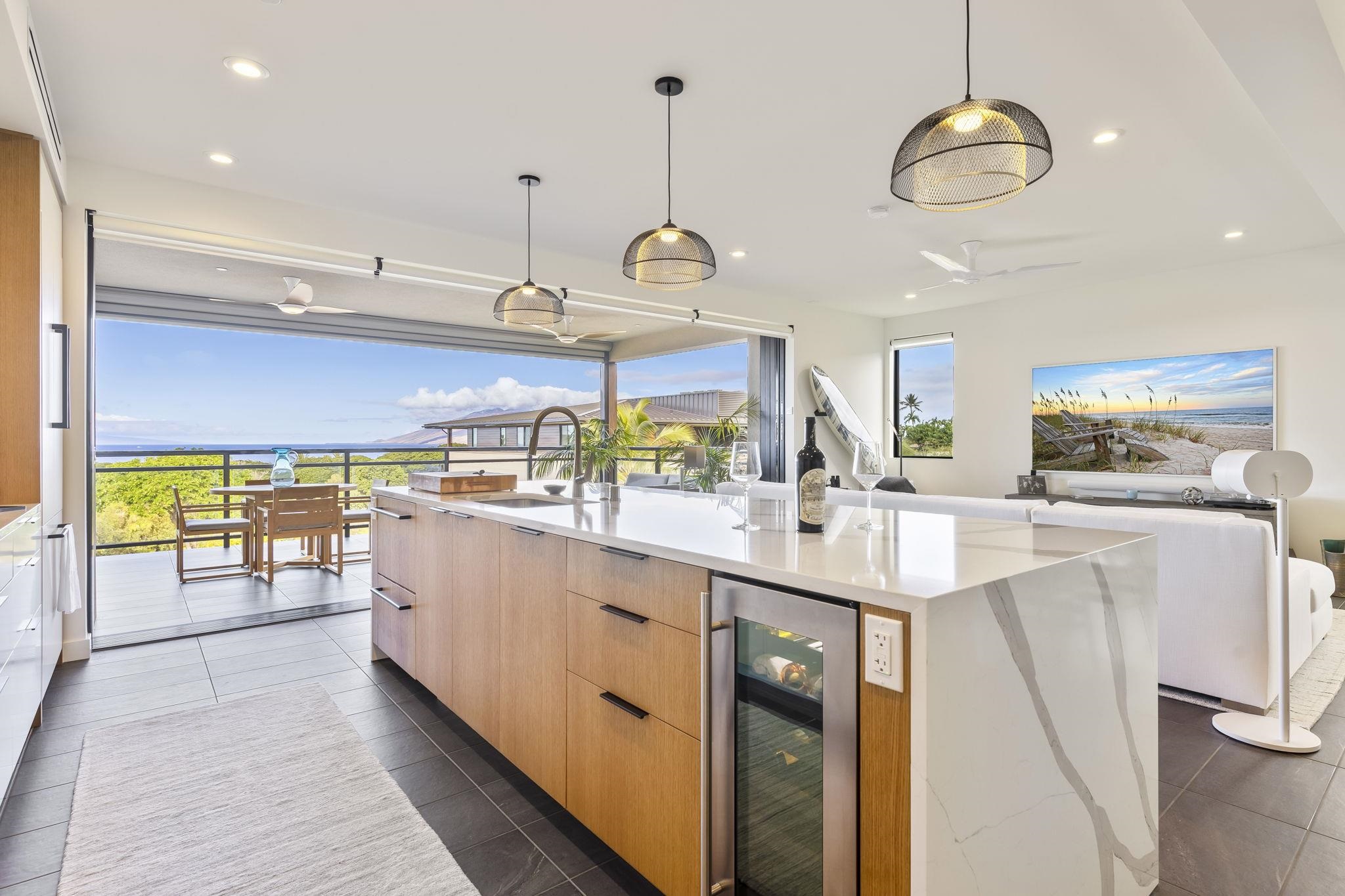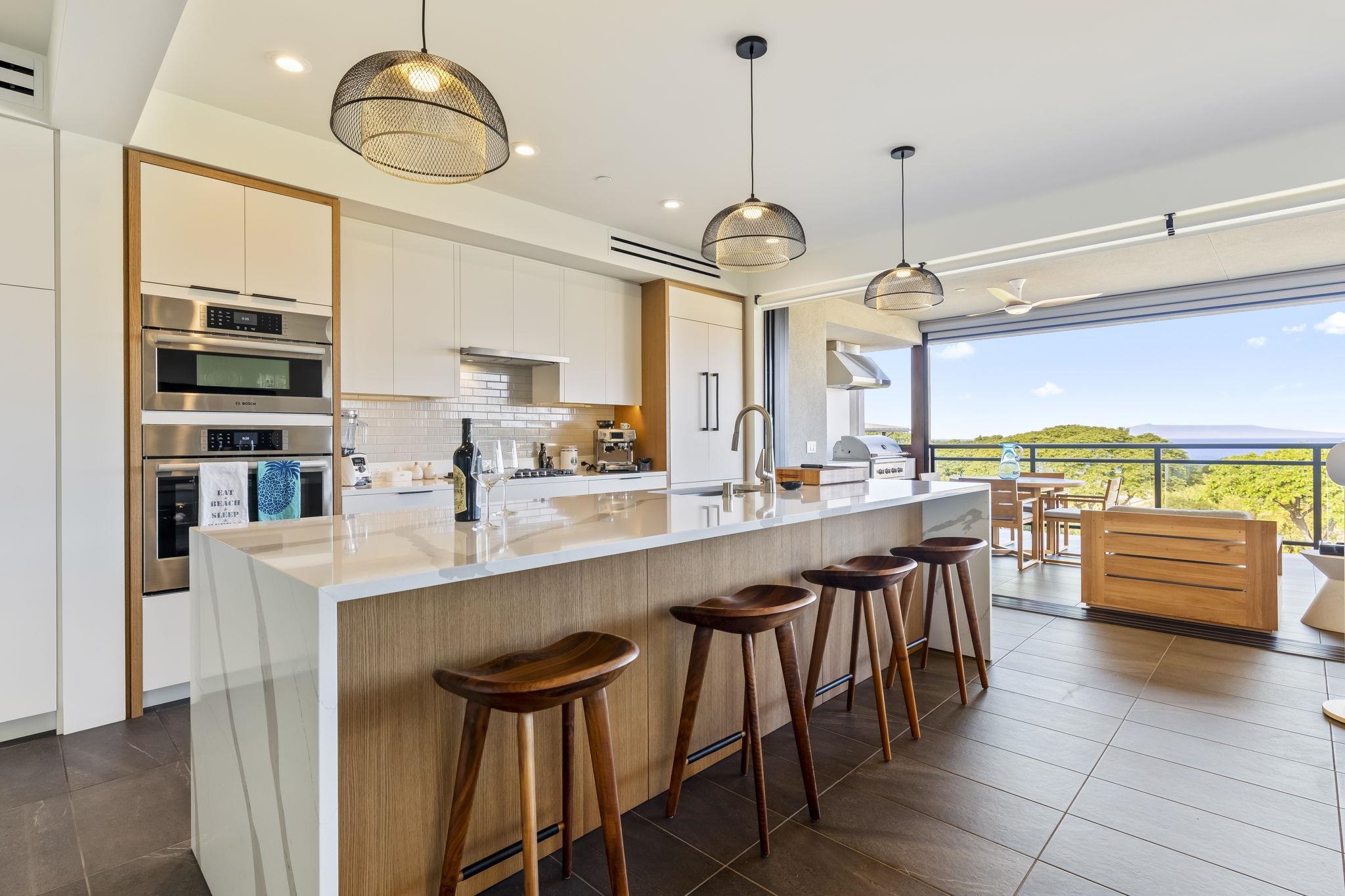 The Pristine Wailea Residence you've been waiting for! Impeccable La’i Loa 3 bedroom 3 Bath Luxury Condo with expansive Ocean and Outer Island Views from the living areas and primary suite. The spacious quality extends in all directions on upgraded beautiful tile floors throughout. Generous open concept living, dining and state of the art kitchen, wide and comfortable, flows unobstructed out to the expansive 312 SF lanai as the handsome gliding glass doors disappear into the wall. Your modern kitchen features stainless Bosch appliances including refrigerator, oven, microwave and propane cooktop, Fisher Paykel double dishwasher, U-Line wine cooler and custom Blum cabinets. Huge quartz waterfall island has bar seating with handsome barstools and pendant lighting. The main lanai features a built in stainless four burner Coyote gas grill with vent. Beautiful furnishings specifically designed for this home are included, so you can enjoy the sumptuous comfort of your new Maui life from Day One. (Owners art excluded) The primary suite will be your luxury sanctuary complete with its own private 112 SF lanai area boasting stunning views plus the amazing primary bath. The premier electronics viewing and entertainment package includes 4 Samsung “The Frame” technology TVs and whole house wireless Sonos sound system. Custom Lutron auto shades and programmable Lutron lighting throughout are available to suit your every mood. Enjoy upgrades galore plus the elegant Hans Grohe fixtures, Rinnai propane fired instant hot water recirculating system, Blum cabinets and Toto toilets. One car garage downstairs with remote garage door access plus huge bonus storage room and an additional assigned parking space. The well equipped workout facility sits next to the tranquil infinity edge pool with bonus lap area and giant hot tub/spa with sauna and steam rooms available. Giant covered community entertainment area with extra grills and prep areas. The community gate puts you a short stroll from the Wailea Beachwalk, the Wailea Resort Hotels, The Shops at Wailea, and multiple world class beaches. Get ready to wake up, grab your coffee and Live the Life You’ve Earned!