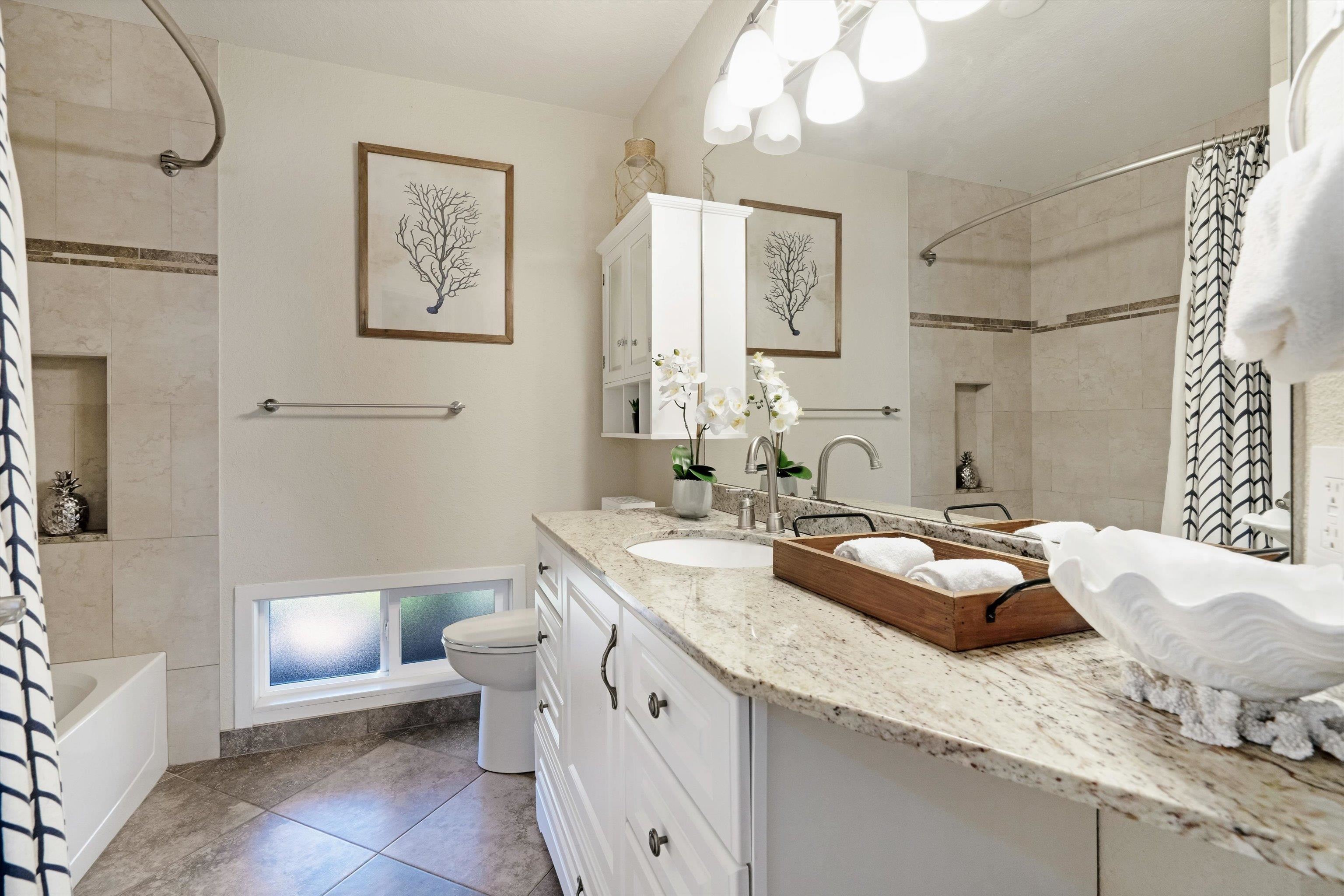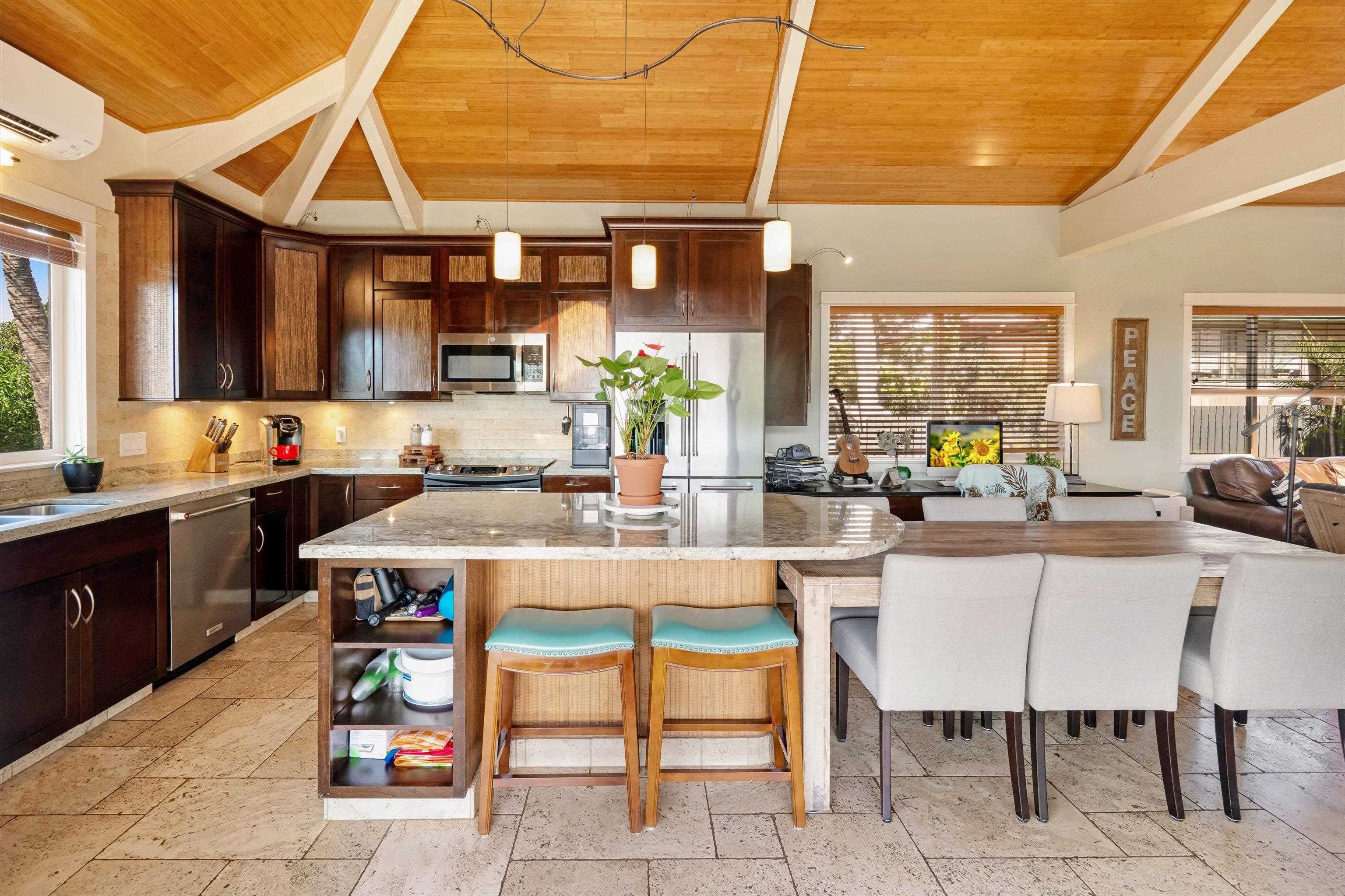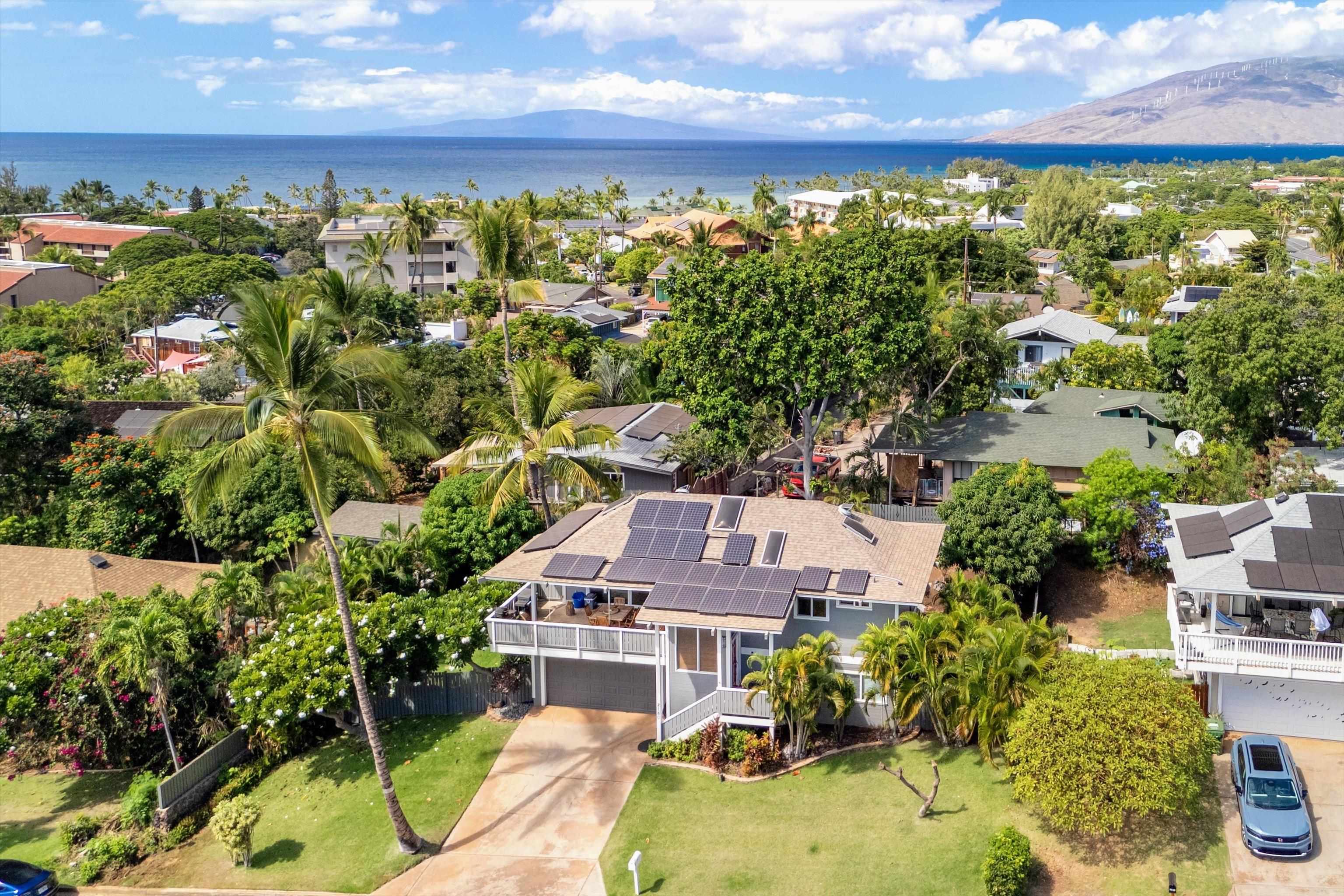 Nicely updated home situated in a peaceful cul-de-sac neighborhood, offering captivating ocean and Haleakala views. Vaulted ceilings and skylights flood the interior with natural light, enhancing the open and inviting floor plan. The spacious lanai adjoining the kitchen/great room boasts stunning ocean and mountain vistas, perfect for entertaining guests or relaxing in tranquility. The split-level layout provides privacy with the master suite on the upper floor and two guest bedrooms plus a full bath downstairs.The great room and kitchen feature elegant natural stone travertine flooring, rich cherry wood cabinetry with reed bamboo details, and durable solid surface granite countertops. Both bathrooms are beautifully tiled with glass and porcelain, including an etched glass shower, while the master bath impresses with a mahogany vanity and solid limestone countertop. Recent upgrades by the owner include the installation of energy-efficient dual-pane low-E windows, new premium self-venting skylights, and the addition of two high-efficiency Daikin split AC units for superior cooling comfort. The exterior has been freshly painted, enhancing the home's curb appeal. Sustainability and energy independence are ensured with a 28-panel photovoltaic (PV) solar system complemented by two Tesla Powerwalls, providing reliable power storage. Additionally, a new irrigation control unit supports the lush tropical landscaping. Located close to Kamali’i School and some of South Maui’s best beaches, dining, shopping, and resort golf courses, this home perfectly balances comfort, style, and location. NO HOA FEE!