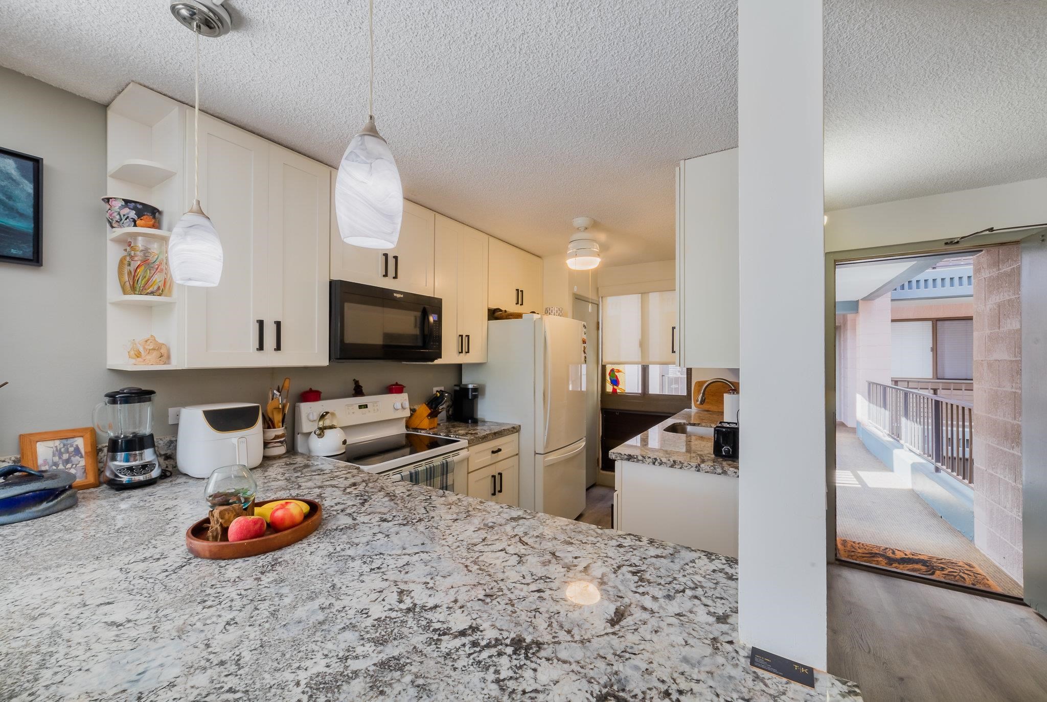 Hotel Zoned 2-bed 2-bath fee simple condo located in a unique position in the complex with no neighbors to the side of you. Recent updates include: granite counter tops, soft-close cabinets, washer and dryer, and flooring. Quiet complex with overnight security. In-ground pool near the unit. Peaceful mountain views from lanai. The unit captures the trade winds to keep it cool. Includes one assigned parking stall (#30). Kahana Manor is a condominium complex that features shops, a pub & cafe (Dollies), a restaurant (Miso Phat), a nail salon, and a grocery store on the first level. Located across the street and just a short walk to the public beach access.