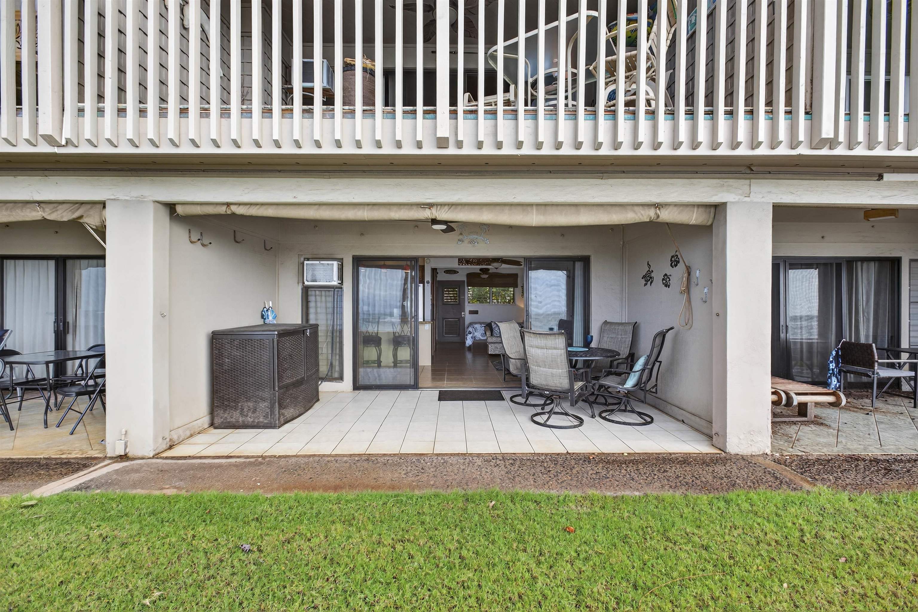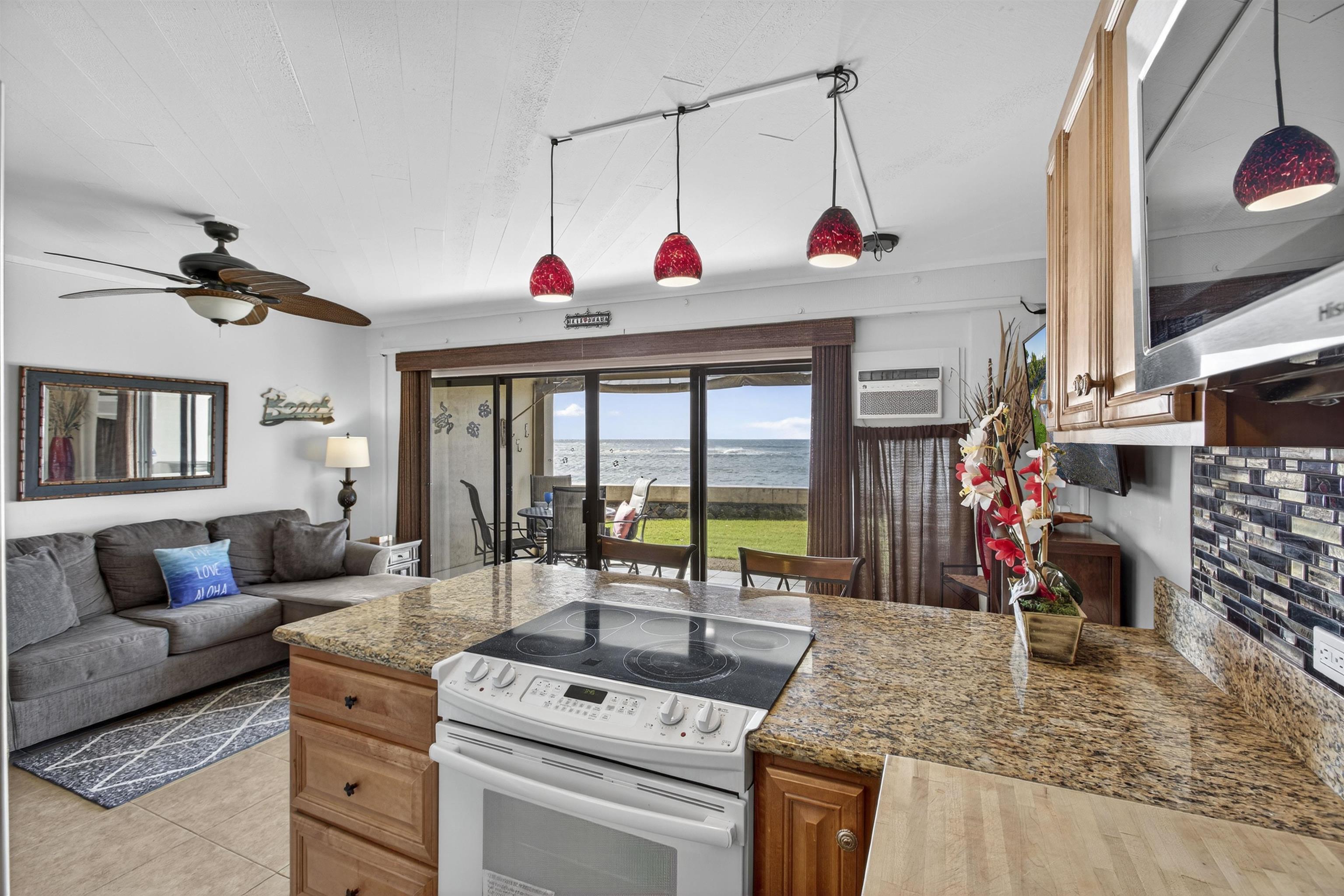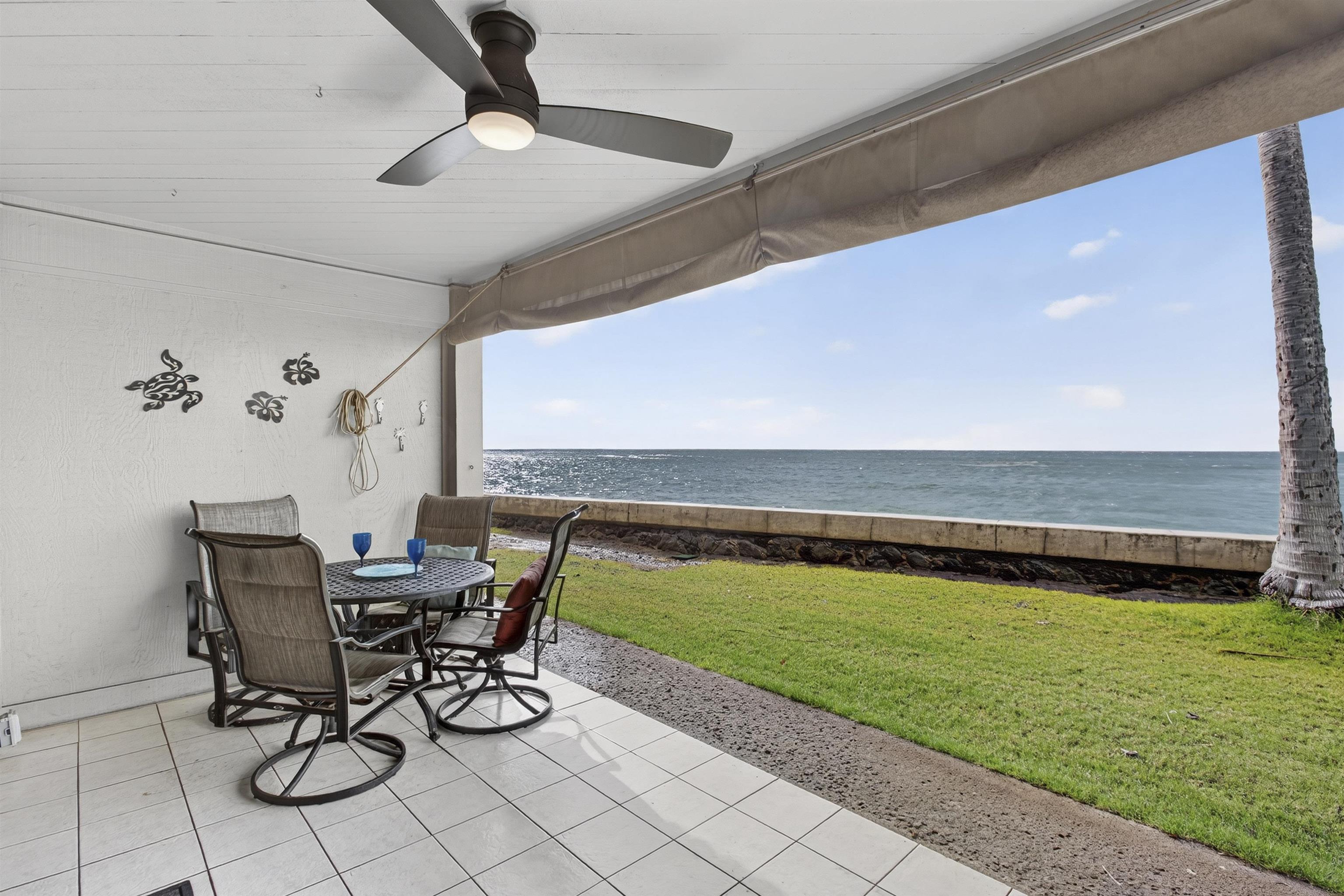 Oceanfront bliss in Kahana. Live just steps from the sea in this beautifully remodeled, ground-floor studio at Pohailani Maui. From your private lanai, take in sweeping views of Moloka‘i, Lana‘i, and year-round sunsets–then wander straight onto your own grassy oceanfront lawn. Thoughtful upgrades include new granite countertops, a permanent butcher-block with a new kitchen sink, fresh backsplash, a newly tiled shower, updated lighting, new paint, blinds, and a mounted smart TV. The kitchen includes newer stainless-steel appliances–full-size dishwasher and refrigerator–and a newer A/C unit to keep you cool after long beach days. Relax into HOTEL-ZONED resort-style living with two pools, a community kitchen, tennis courts, oceanfront BBQs, and a designated covered parking space. Additional parking and surfboard storage add to the convenience. Perfectly situated between Ka‘anapali and Kapalua and just a short stroll to Kahana’s cafés, shops, and sandy beaches, this turnkey condo blends comfort, quality, and timeless island charm. An exceptional value in a truly irresistible oceanfront setting.