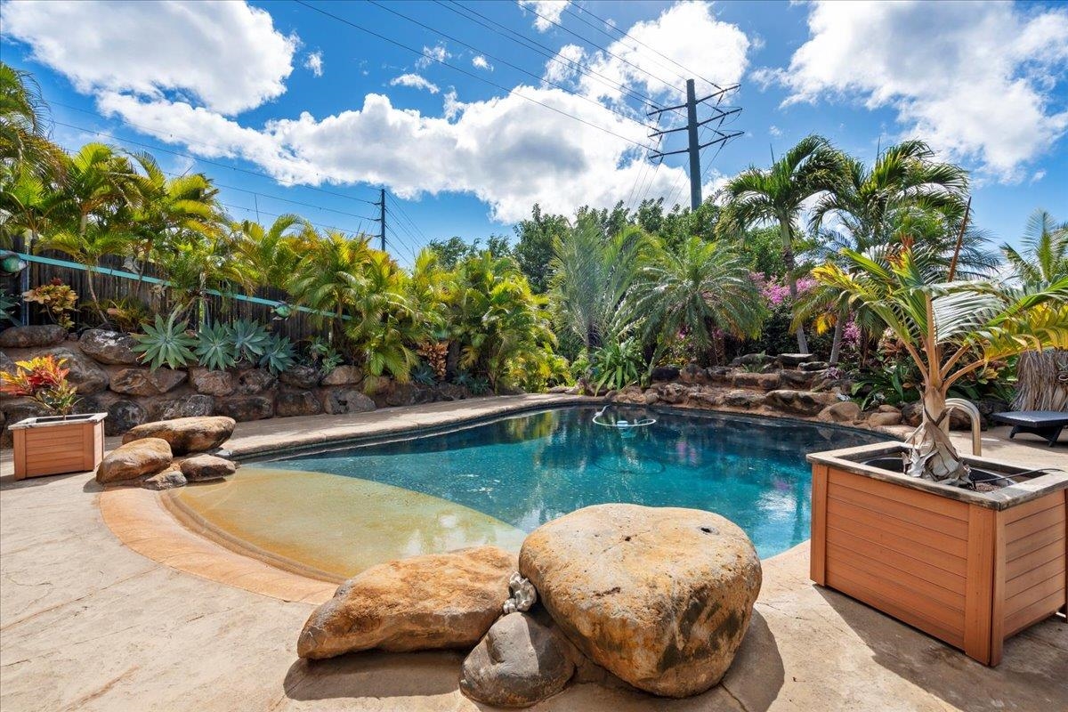 Your private and secluded Launiupoko home awaits. As you drive through the gated entrance, this elevated setting reveals sweeping ocean, outer island, and sunset views. This two-bedroom, two-bath home is perfectly sized for a Maui retreat or full time residence, with ample outdoor areas ideal for easy entertaining. The living room and kitchen feature soaring 15-foot ceilings, and the views become even more impressive as you step onto the expansive lanai of over 1,000 sq ft. The pool area includes a tiki bar lounge and a sprawling covered space full of possibilities. A three-car garage provides protected parking for your vehicles and recreational gear. A generous driveway and multiple parking areas offer plenty of space for gatherings or even boat storage. This is a residential condo located in an agricultural subdivision. Wander through your acre of productive and mature tropical landscaping where you’ll find mango, lilikoi, banana, pineapple, orange, lime, and dragonfruit. Several raised beds offer a clean slate for your next planting project. This is an exemplary property that defines what West Maui living is all about.