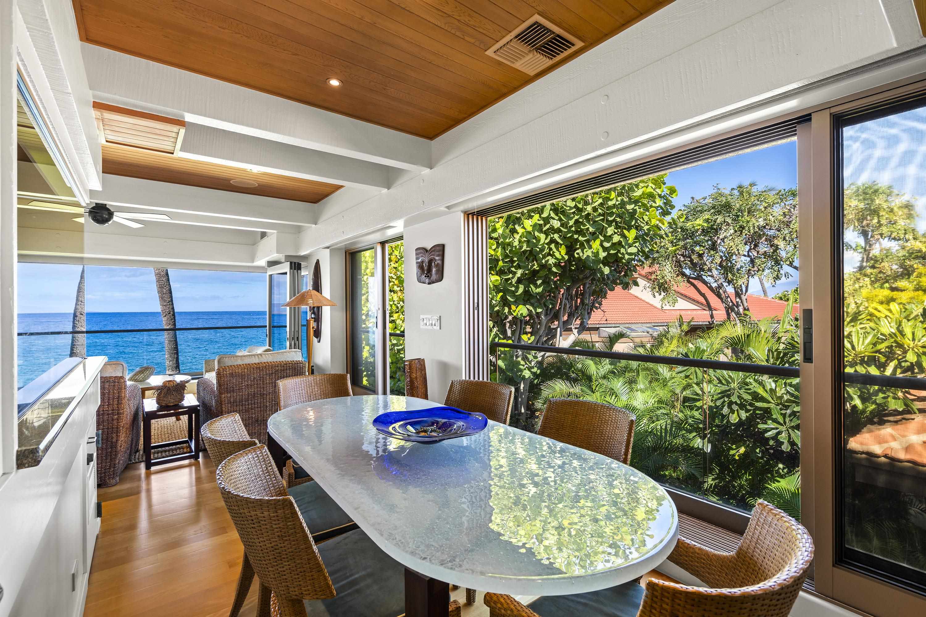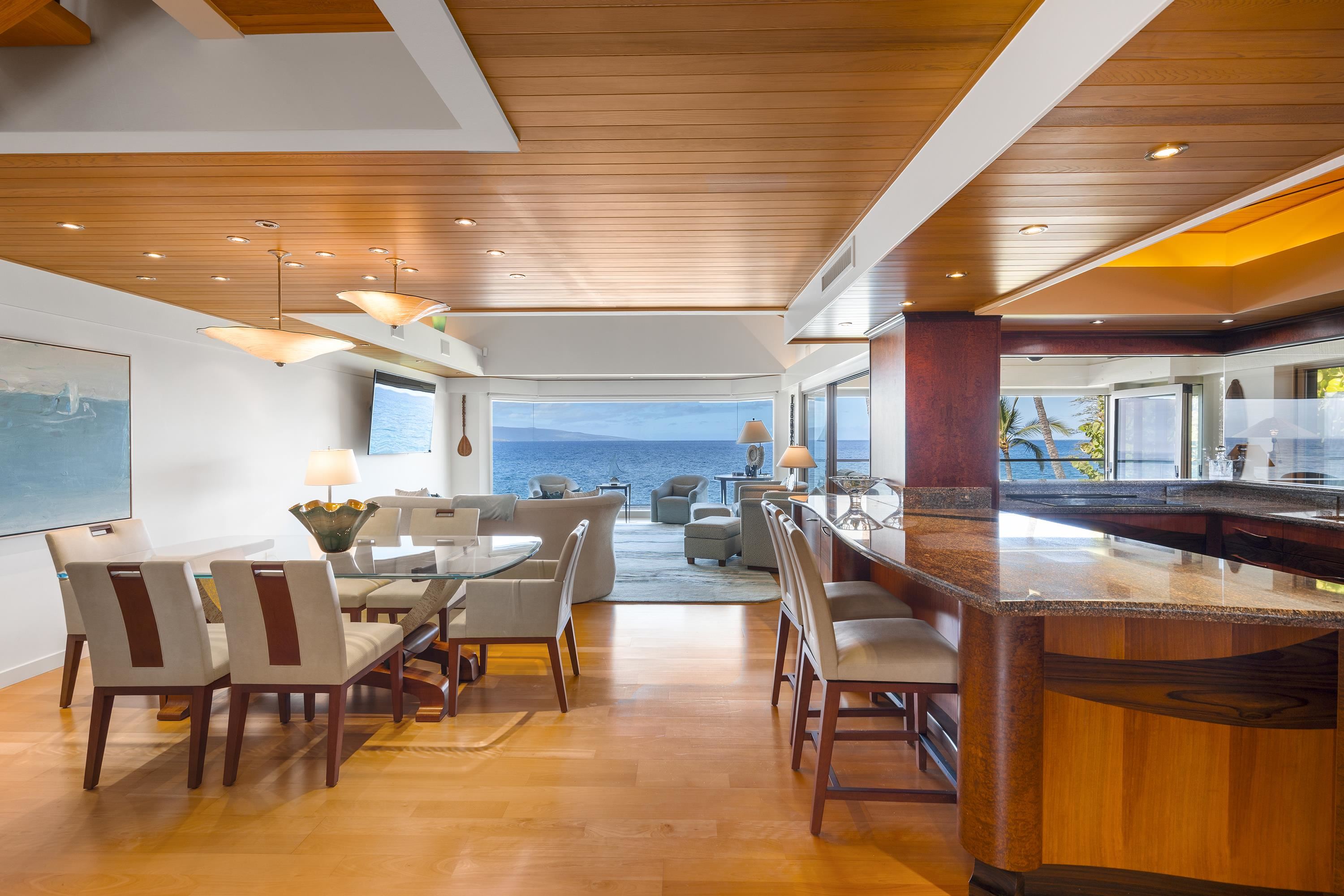 Positioned in the coveted front row of Wailea Point, Residence 502 sits just 75 feet from the surveyed shoreline, offering commanding southwest-facing views of Molokini Crater and the resort’s iconic blowhole. Given the slight elevation directly on the ocean, the home is perfectly situated for dramatic vistas and exceptional privacy from the oceanfront path below. The residence underwent a complete and elegant remodel in 2003, crafted with timeless design by interior designers Gretchen Schoch of Fairacres Studios and Cynthia Bengier, and brought to life by general contractor Dave Graham. At the heart of the home, a spacious open-concept kitchen captures breathtaking views and is appointed with granite countertops, custom wood cabinetry, a SubZero refrigerator, Thermador ovens, Décor range, Maytag washer and dryer, Wolf barbecue, and a Franke stainless steel sink with hot and cold filtered water, a soap dispenser, and Kitchenaide disposal. A reverse osmosis filtration system discreetly housed in a lanai cabinet supplies pristine water to the kitchen. Luxury furnishings of the highest quality are included, though most artwork is excluded. In 2019, new windows were installed throughout the residence, including a stunning mitered glass bay window in the main living area, amplifying the coastal light and breathtaking views. The expansive lanai is enclosed by a premium NanaWall system–effortless to operate and designed to blur the lines between indoor and outdoor living in one of the world’s most temperate climates. Wailea Point features exceptional quality construction; a very low density (just over 4 units per acre) garden environment; largely concrete low-rise buildings; 24-hour gated & roving security; two elaborate pool pavilions with 4 pools including a 2-lane, 25-meter lap pool, 2 whirlpool spas & full kitchens; lighted tennis court, 2 pickleball courts; superb fitness gym; barbeque areas; fruit & herb gardens; ample parking; fun, golf-cart friendly property. Beautifully landscaped and maintained, Wailea Point IS a beautiful garden. Enjoy the Four Season and Fairmont Kea Lani Hotels as immediate neighbors and all the 5-star services they offer. Furnishings included except art pieces.