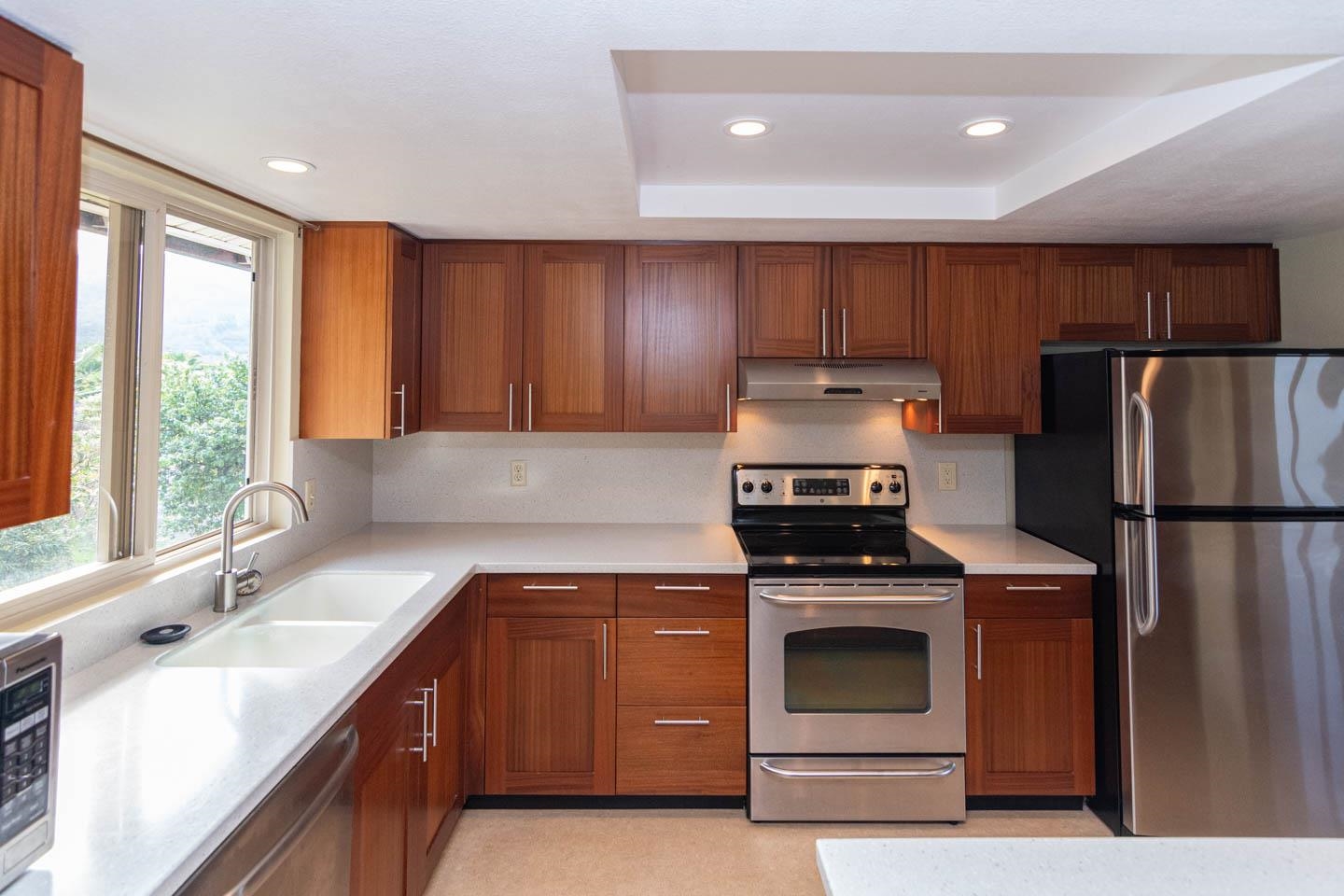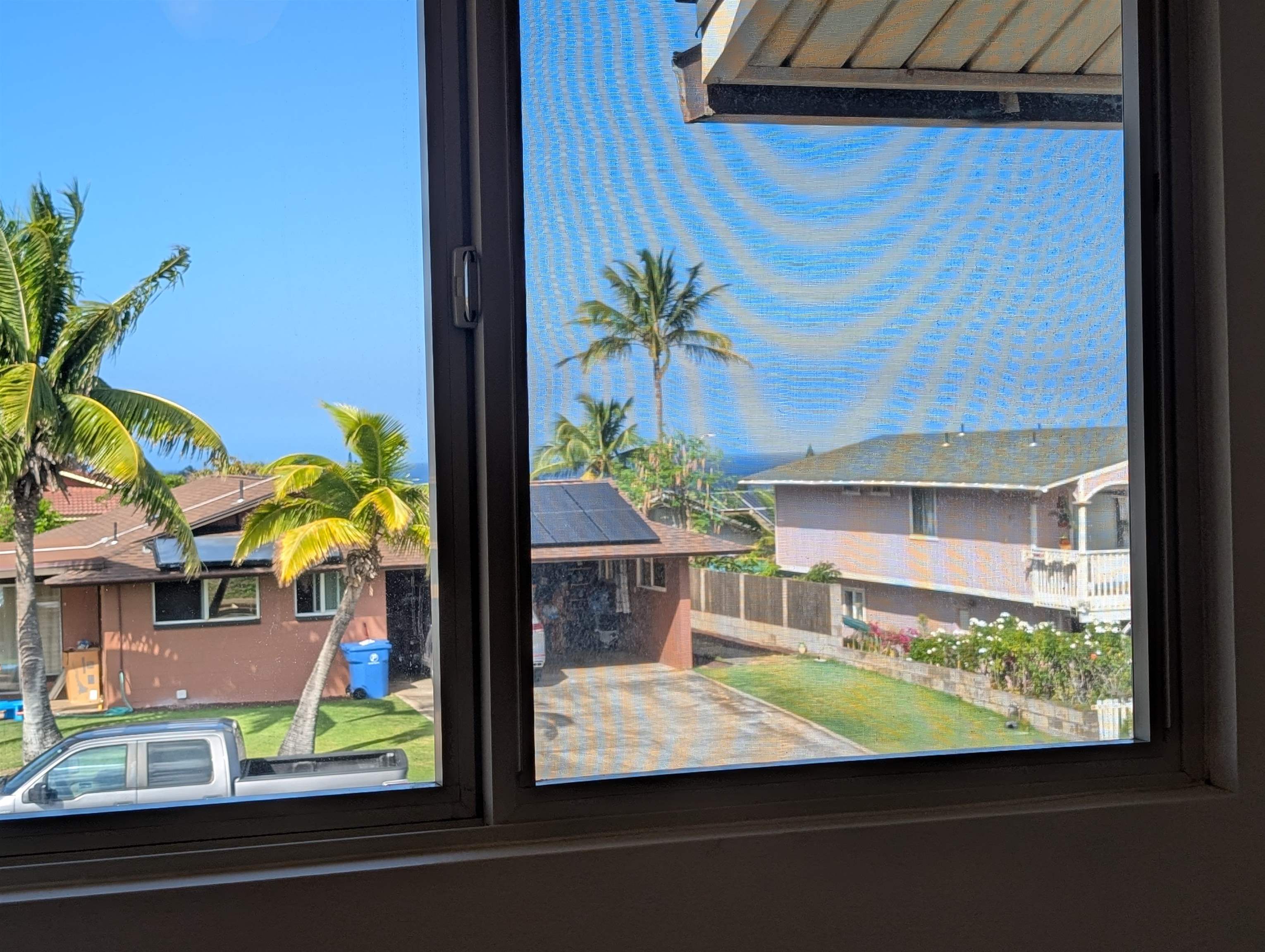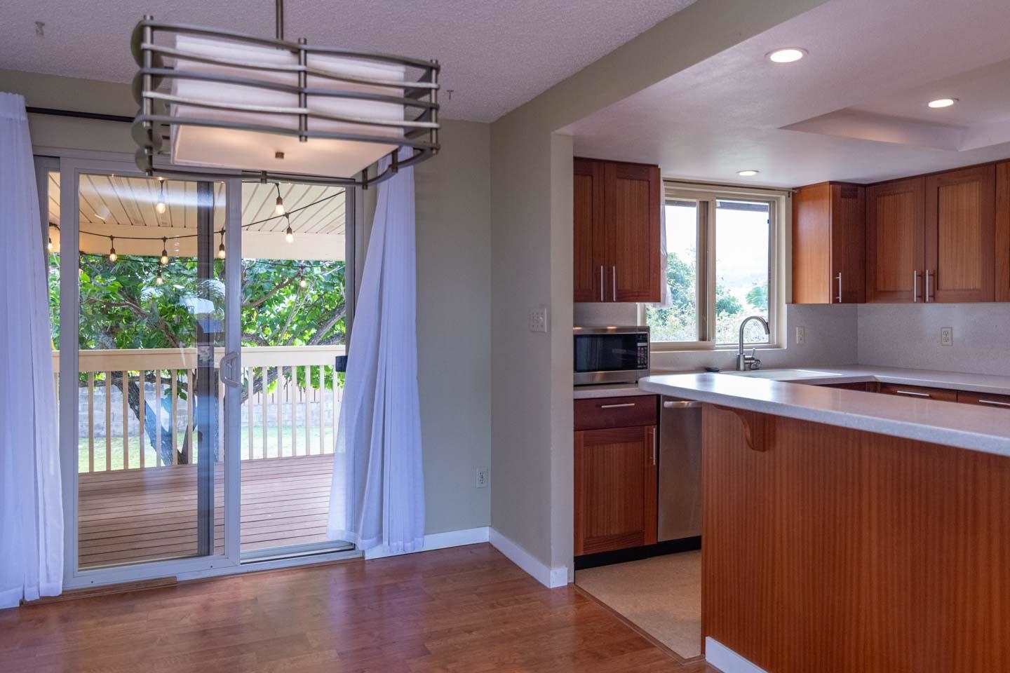 This well-maintained home on a quiet cul-de-sac, at the top of the Waiehu Heights subdivision, is being sold by its original owners and features a 15-module owned-photovoltaic system with net metering. The home offers beautiful mountain and ocean views and a large back yard that was spacious enough for a batting cage in the past. The dining room leads to a pleasant covered deck, framed by stunning views of the West Maui Mountains, partial view of Haleakala and the shade of a milo tree. In 2011, the kitchen and bathrooms were remodeled, and the PV system was installed. Home was re-roofed in 2003, and gutters were added in 2014. The dining room, living room, bedrooms and staircase features wood-laminate flooring. The large downstairs family room is cooled by a split-system air conditioner. The downstairs laundry room and half bath are located near the deep 2-car garage (589 sf). A K-2 land survey has recently been completed and is available in the associated documents.