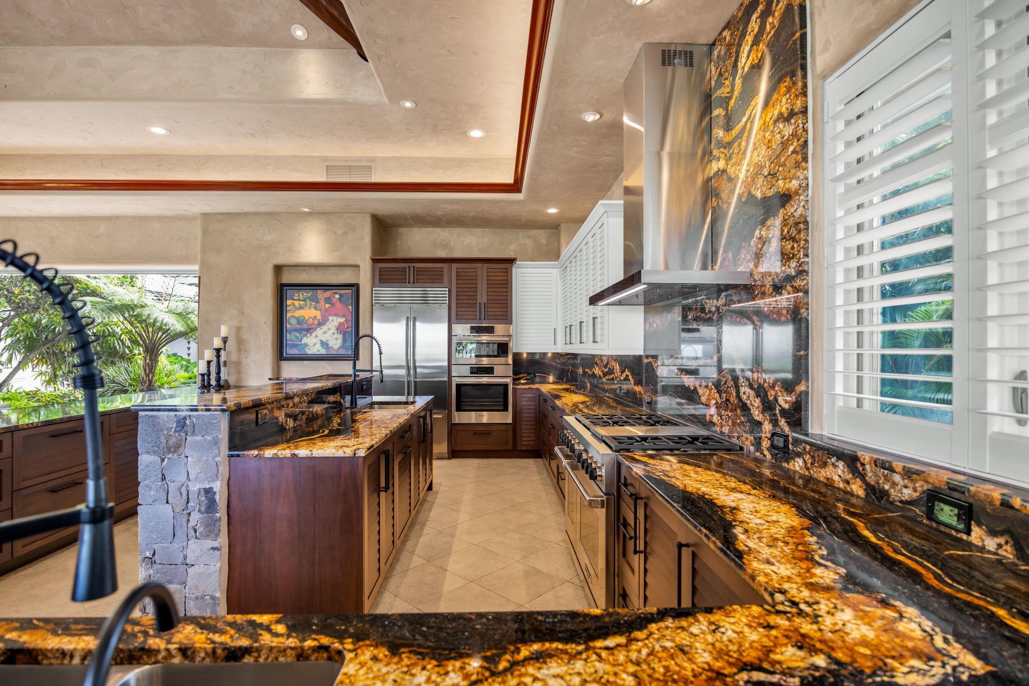 Welcome to 112 Pulelehua Street, an exceptional single-level residence in the gated Pineapple Hill II community of Kapalua Resort. Positioned on a half-acre on the Kapalua Bay Course overlooking the Pacific Ocean, this redesigned 3-bedroom, 2.5-bathroom home offers more than 4,500 sq. ft. of interior living space and over 1,500 sq. ft. of lanais for seamless indoor—outdoor living. A grand set of double doors leads into an open-air atrium filled with tropical landscaping, an architectural centerpiece that brings natural light and Kapalua’s cooling breezes into the heart of the home. The great room follows, defined by soaring ceilings, Ohia details, and a 30-foot multi-panel sliding glass wall that pockets completely out of view. When opened, the interior blends effortlessly with the pool terrace, golf course frontage, and the ocean beyond, creating a true open-air living experience. The floor plan flows easily between the indoor and outdoor dining areas, a mirrored bar, entertainment space, and a chef’s kitchen. The kitchen has been fully renovated with custom open-louvered cabinetry, 3-inch Volcano granite, and a suite of premium appliances including SubZero refrigeration, a Wolf 48” dual-fuel range, Bosch double ovens, SubZero drawer systems, and a Dacor hood–ideal for cooking and entertaining. The primary suite is a private retreat with floor-to-ceiling sliders, a custom Kapalua stone fireplace, and a peaceful connection to the outdoors. Its spa-inspired bathroom features Volcano granite counters, a freestanding tub, black Kohler fixtures, Toto sinks, a heated towel bar, and new stone flooring. Both guest suites offer comfort and privacy with upgraded lighting, shutters, blinds, fans, and ensuite bathrooms with custom cabinetry, Volcano granite, and refined finishes. A temperature-controlled wine room sits just off the great room–perfectly positioned for entertaining. Outdoor living is at the core of this property. The heated freeform pool and spa sit along a gentle waterfall feature. Multiple lounging and dining areas capture sweeping views of the golf course, ocean, and sunsets over Moloka‘i. Tiki torches, refinished Ohia posts, new landscaping, and remote-controlled lanai screens enhance the resort-like setting. The home has been extensively improved with new LED lighting throughout, upgraded HVAC systems, a solar hot water system, new exterior paint, irrigation upgrades, new pool equipment, a refreshed driveway, and a new Raynor garage door with epoxy-coated flooring. Located within Kapalua Resort, owners enjoy access to world-class golf, beautiful beaches, coastal trails, dining, tennis, pickleball, and the resort shuttle. 112 Pulelehua Street offers an exceptional combination of design, comfort, and location in one of Maui’s most desirable communities.