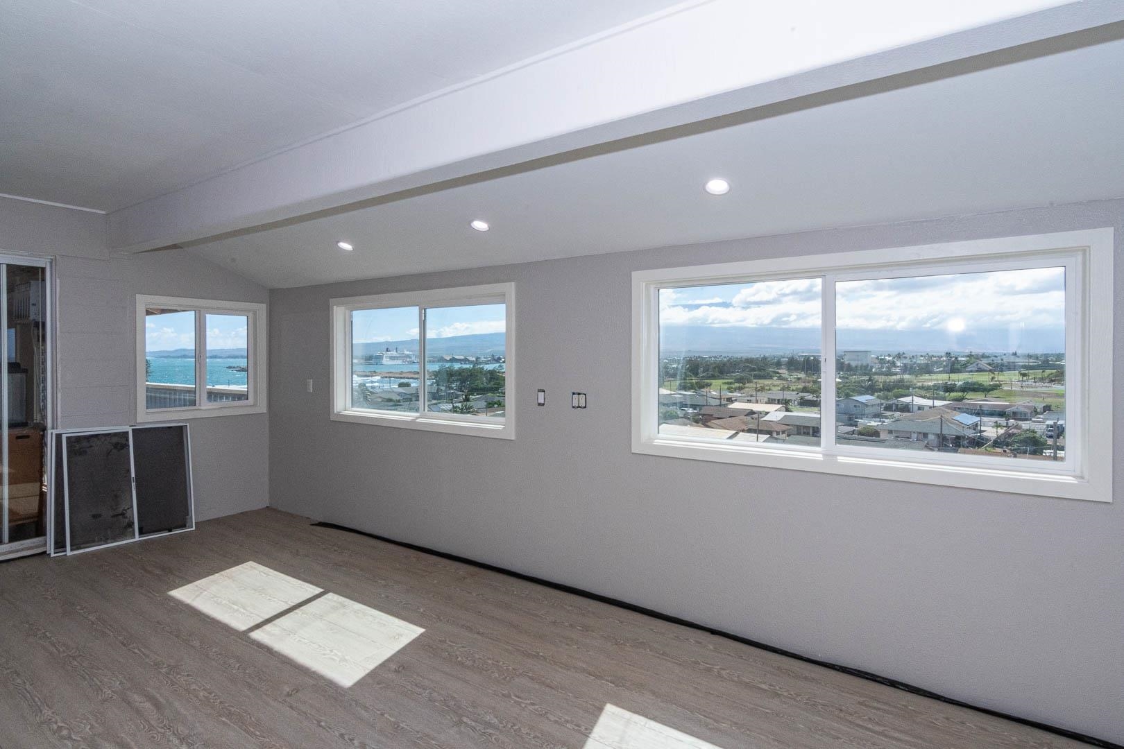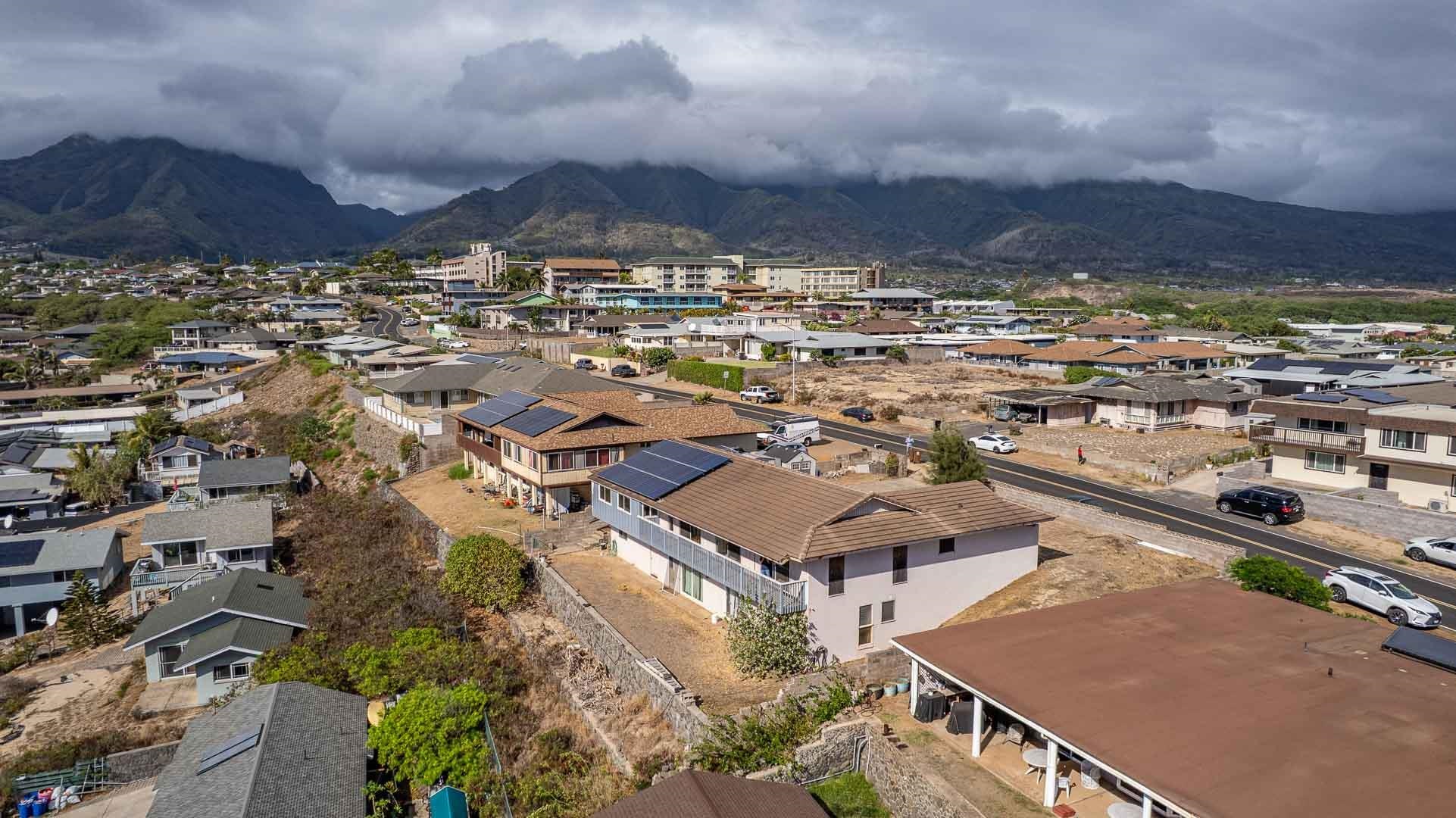 Views beyond compare! Take in Central Maui from your living room, from the North Shore coastline and a perfect Kahului Harbor vantage point, a vast Haleakala backdrop to the excitement of Keopuolani Park, the baseball stadium and the Maui Arts and Cultural Center nearby. The central location can’t be beat for the combination of view and convenience. Near parks, medical facilities, shopping, the Kahului airport and more. This spacious home comes with 27 owned photovoltaic panels for low energy bills. The main upstairs level at street level includes the living room, dining area, ensuite bedroom, laundry room, additional bathroom and an enclosed lanai. The downstairs offers 2 more bedrooms, including another ensuite bedroom. There is also a large storage room downstairs and storage sheds included in the sale.