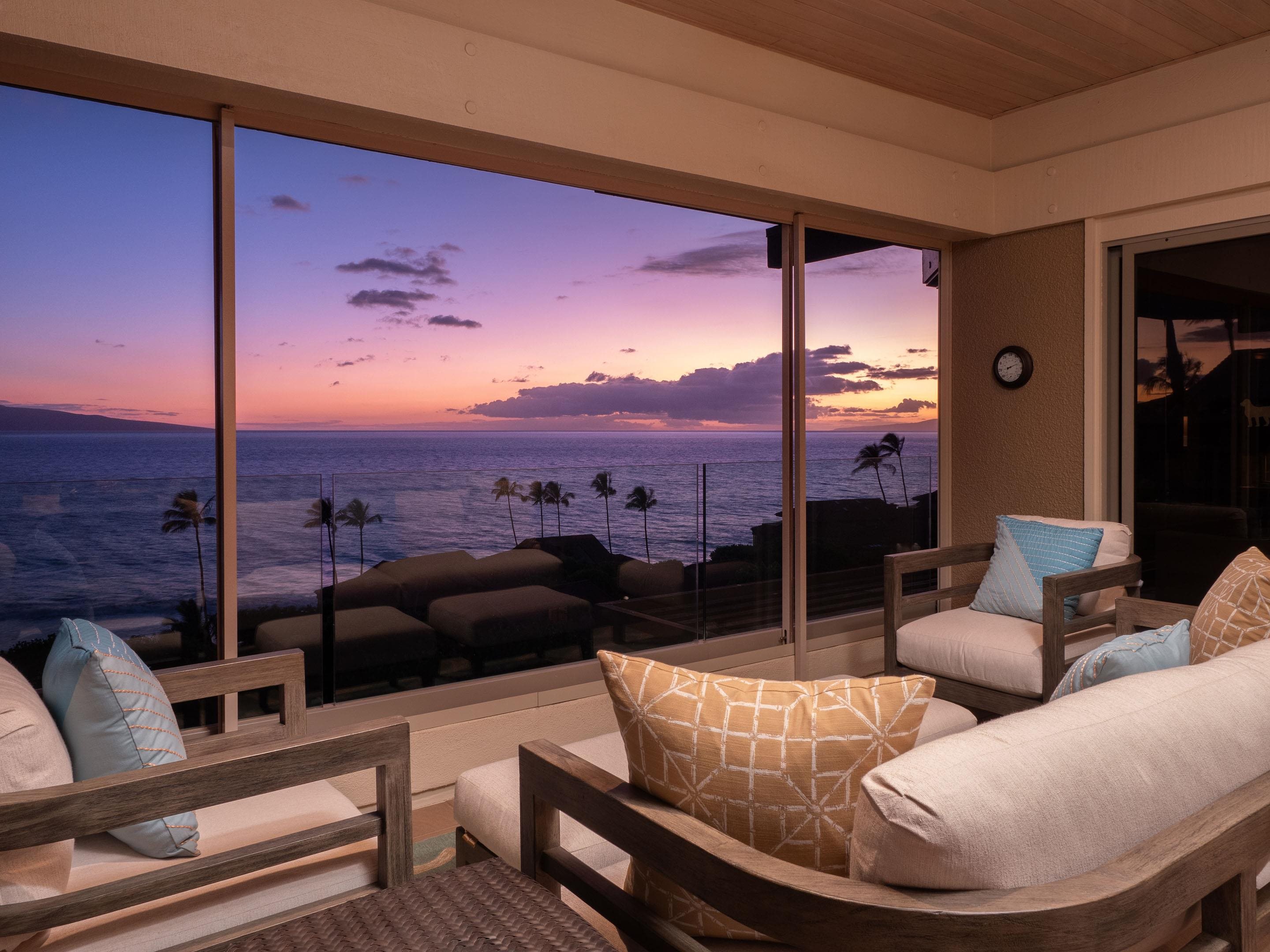 Wailea Point Beach Condo 2904 is designed for comfort and relaxation. Wailea Point! South Maui's most elegant, luxurious, and private community. This premier oceanfront enclave's luxury and casual sophistication marries the divine setting with dramatic ocean views. Enjoy the premier Maui lifestyle in this private, spacious, fully furnished 2-bedroom, 2-bath residence in beautiful Wailea Point. High ceilings, huge picture windows, and beautiful finishes create the perfect setting for comfortable living and memorable entertaining that flows from spacious interiors to oceanview lanais. The spacious living room features large windows that let in plenty of natural light and offer panoramic views of the beach and ocean. Brand new window installation just completed, featuring a beautiful mitered glass bay window with custom automatic roll-down shades. The extraordinary, panoramic views look from the surf and sand of Polo Beach, across the ocean to the islands of Lanai, Kahoolawe, & Molokini, down the coast to Makena, and up to the summit of Haleakala. The kitchen features exceptionally fine Koa cabinets and high-quality appliances, including an oven, microwave, refrigerator/freezer, dishwasher, and ample cabinet space. The covered lanai is the perfect spot to savor a cup of coffee in the morning, enjoy the sunrise, or barbecue in the evening while taking in the expansive ocean views, sunsets, whales, dolphins, and seabirds. Wailea Point is a low-density 26-acre oceanfront property with impeccably landscaped common areas and top-quality amenities. 24-hour security, three swimming pools, a lap pool, two spas, BBQ pavilions, a fully equipped fitness center, lighted tennis, paddle tennis, and pickleball courts. Wailea Point is conveniently located between Wailea Beach and Polo Beach.