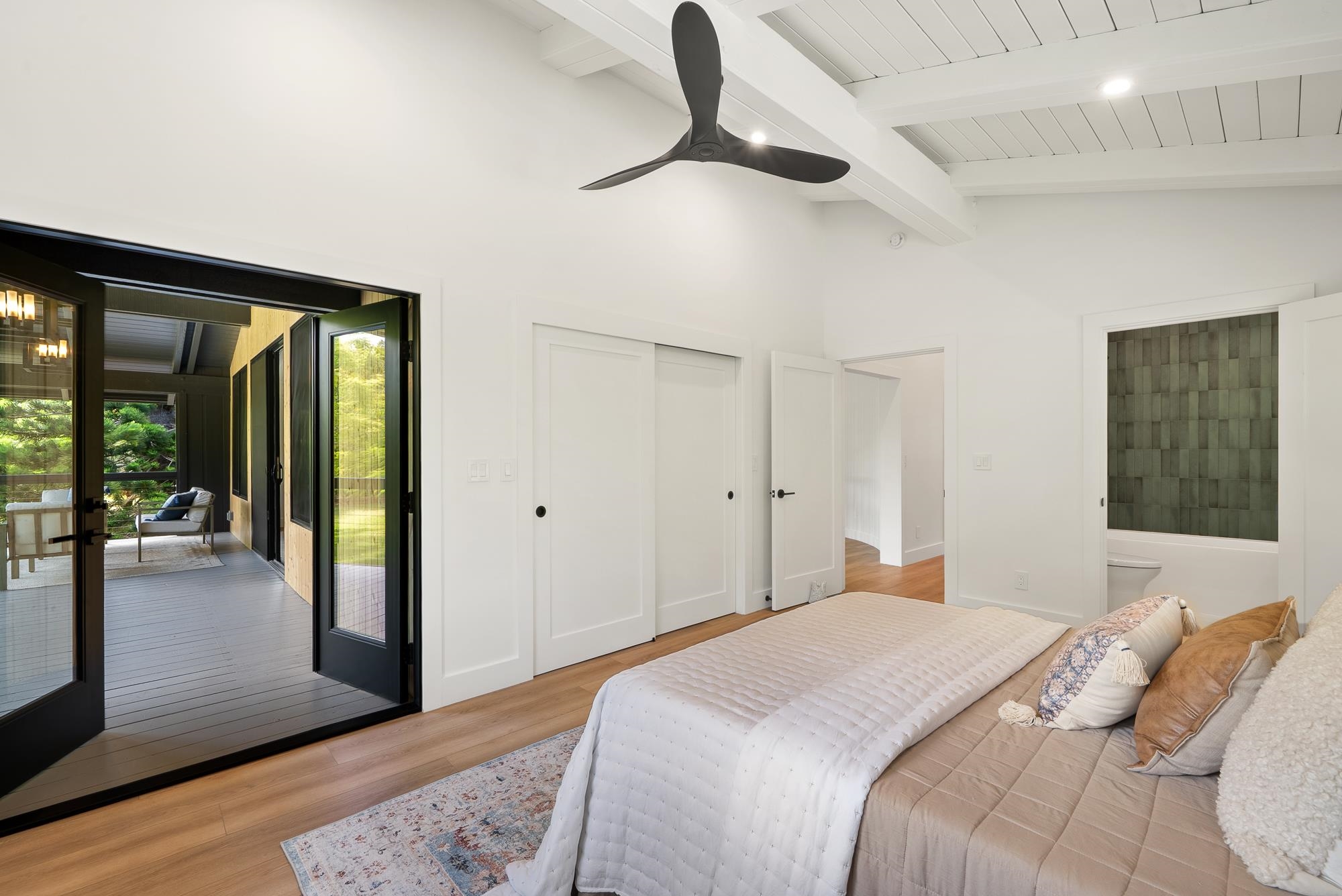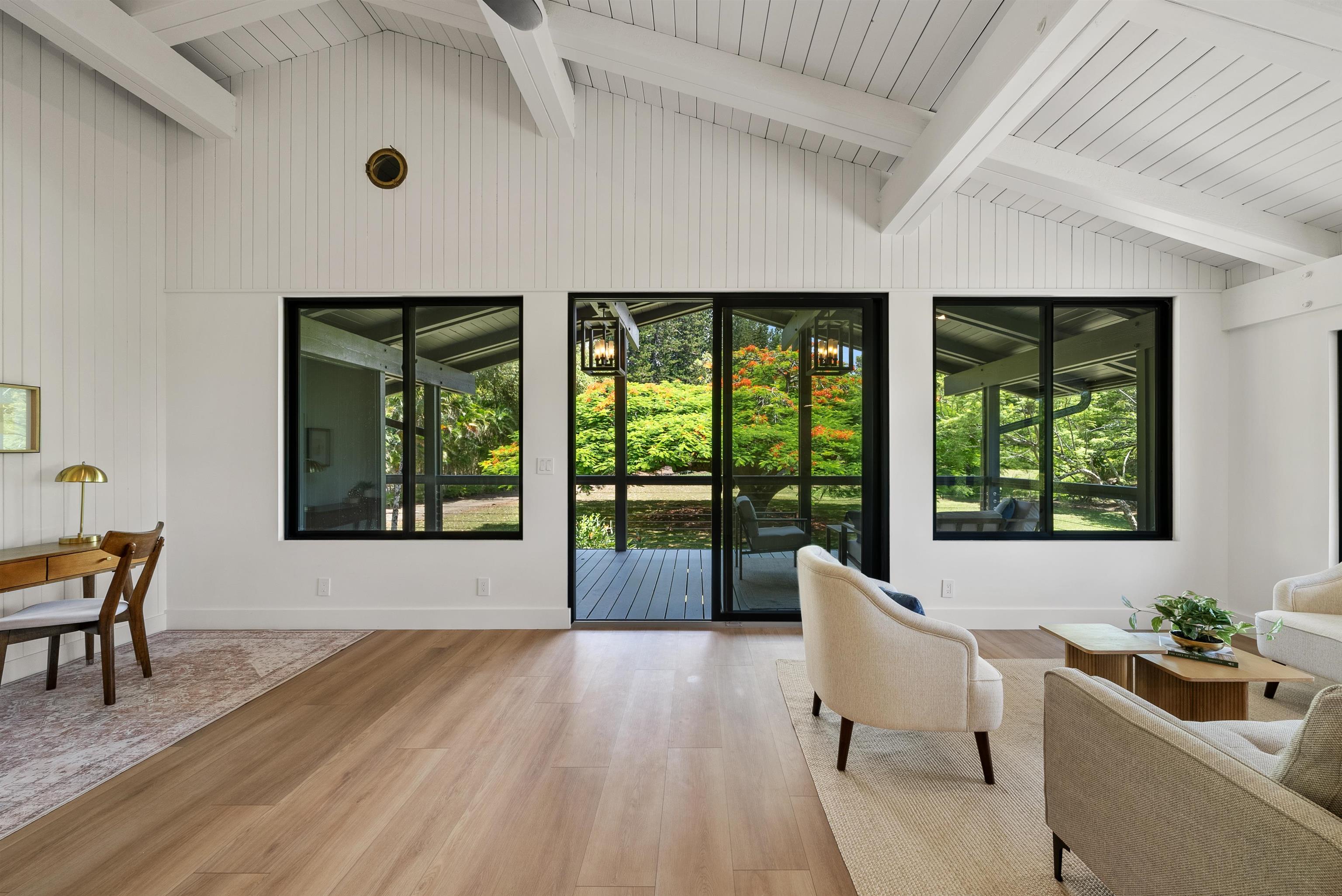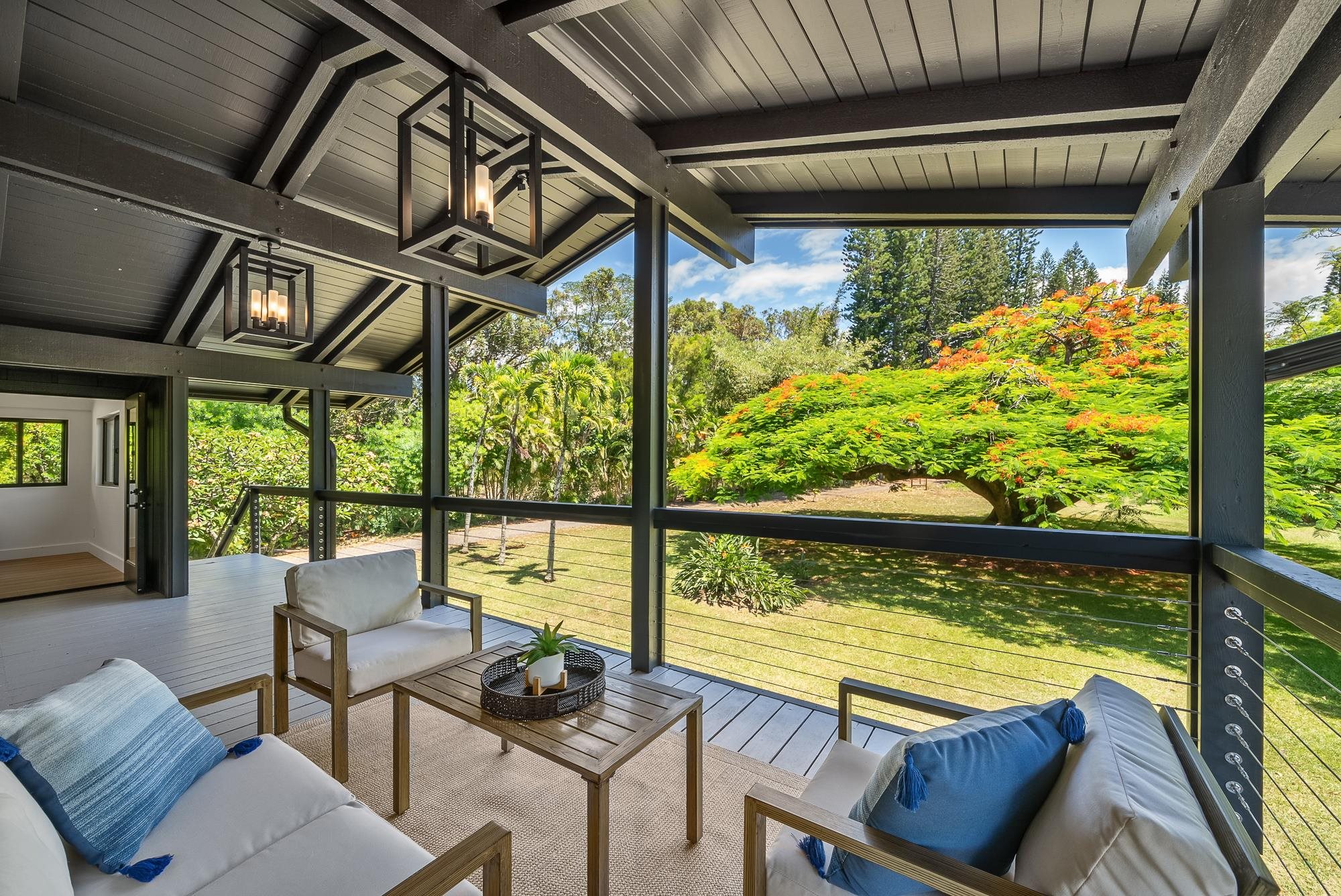 At the end of a country road, tucked behind a majestic Royal Poinciana tree, sits a true North Shore treasure. Originally designed by renowned Maui architect Harry Rice and now reborn as a mid-century modern retreat, the home is elegantly enveloped by more than four acres of lush, private gardens. Light-filled living spaces open to expansive lanais and a spa-like outdoor bath featuring a 72” concrete soaking tub and custom shower. The gourmet kitchen boasts a 48” Hestan gas range, paneled Hestan refrigerator, European-style cabinetry, and a dedicated pantry/prep area. The 3,100 sq. ft. home features 3 spacious bedrooms, each with a luxurious ensuite bath, plus a separate upgraded cottage ideal for guests. A custom eucalyptus spiral staircase and handcrafted details throughout accentuate the classic Maui roots. Mature fruit trees, peaceful walking paths, and a treehouse overlooking the forested gulch create a private, retreat-like setting. All the home's amenities and features, accompanied with North Shore conveniences, make this a truly unique architectural treasure. This is an A unit of a CPR.