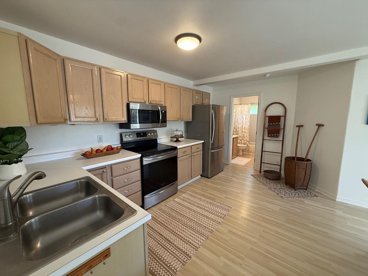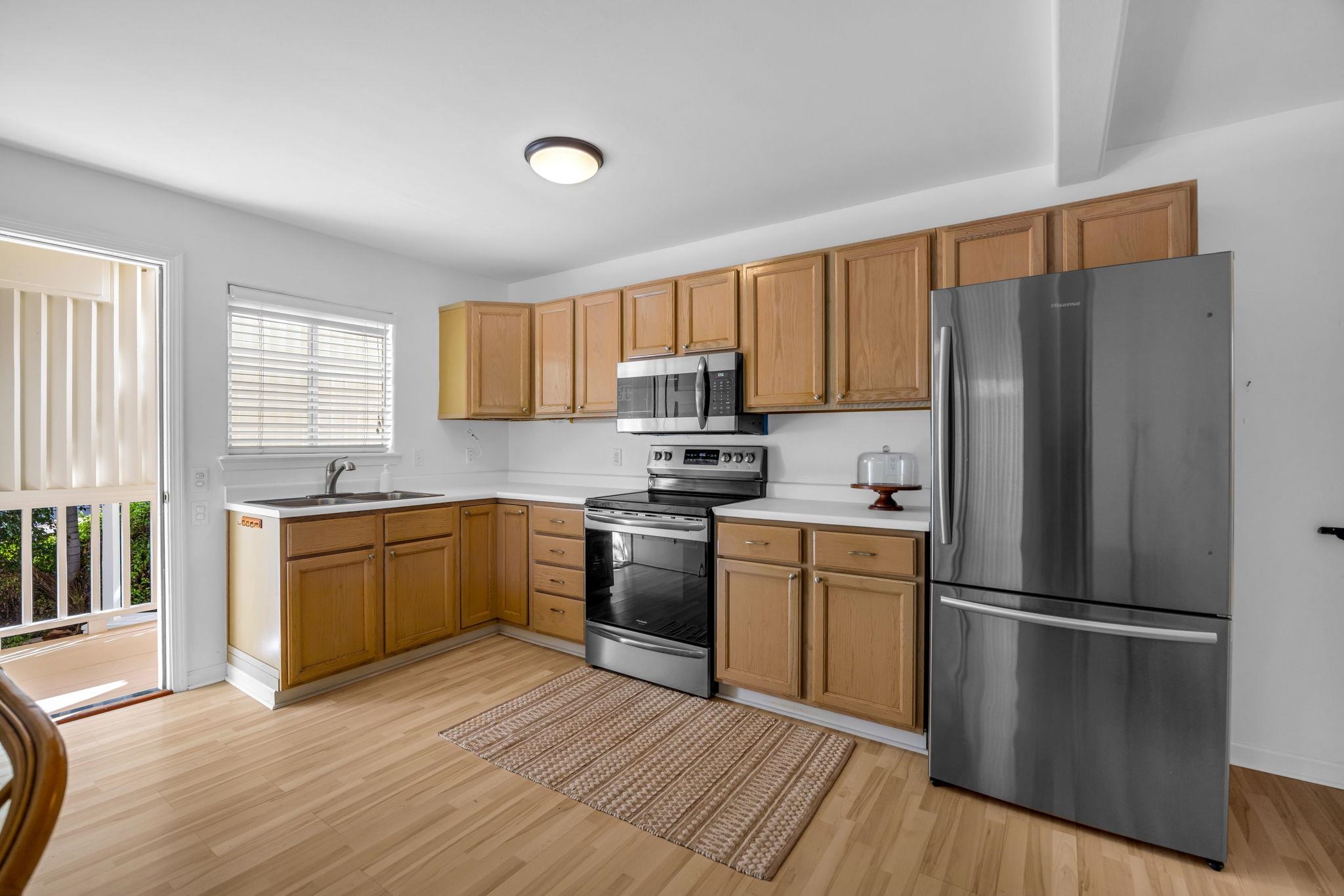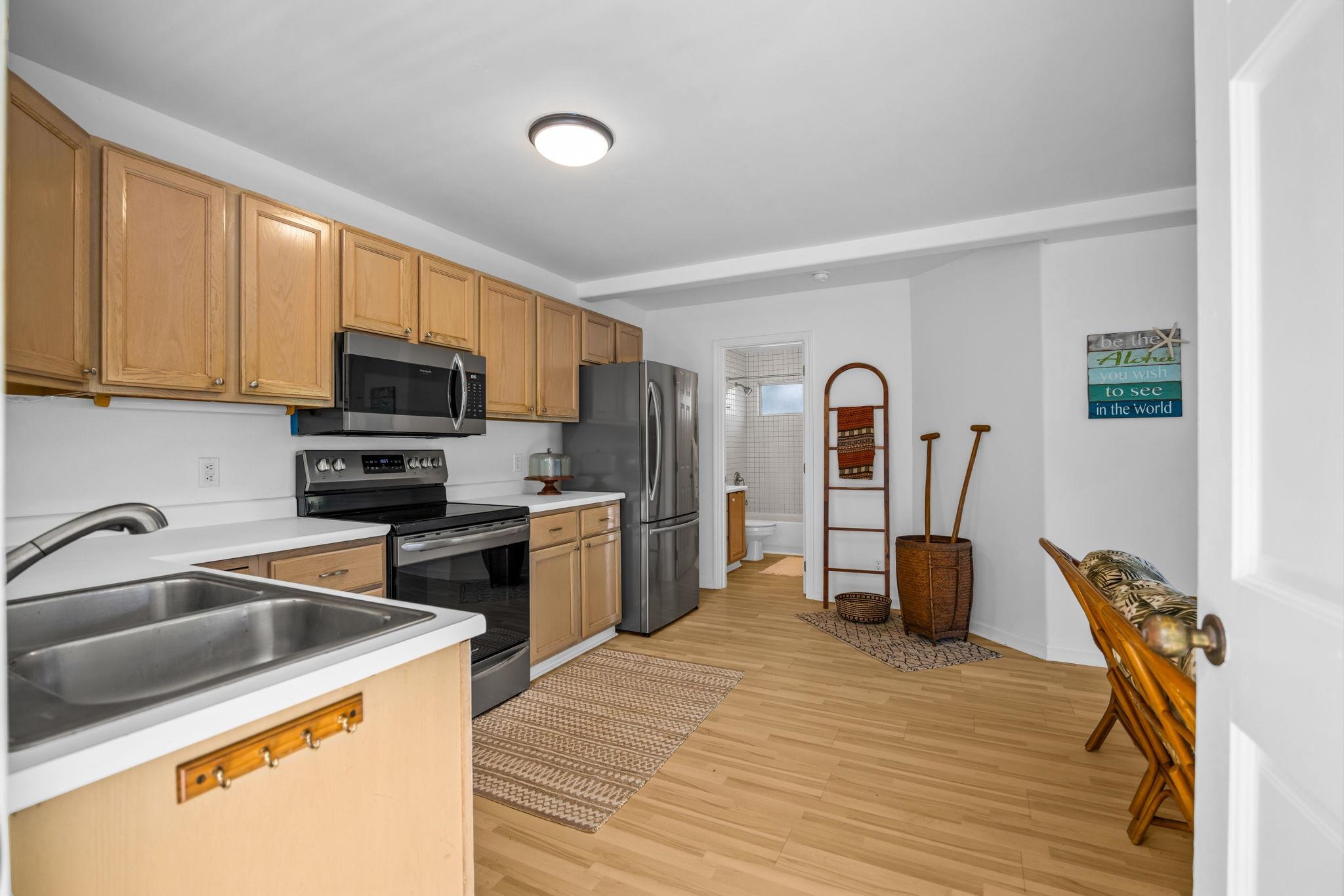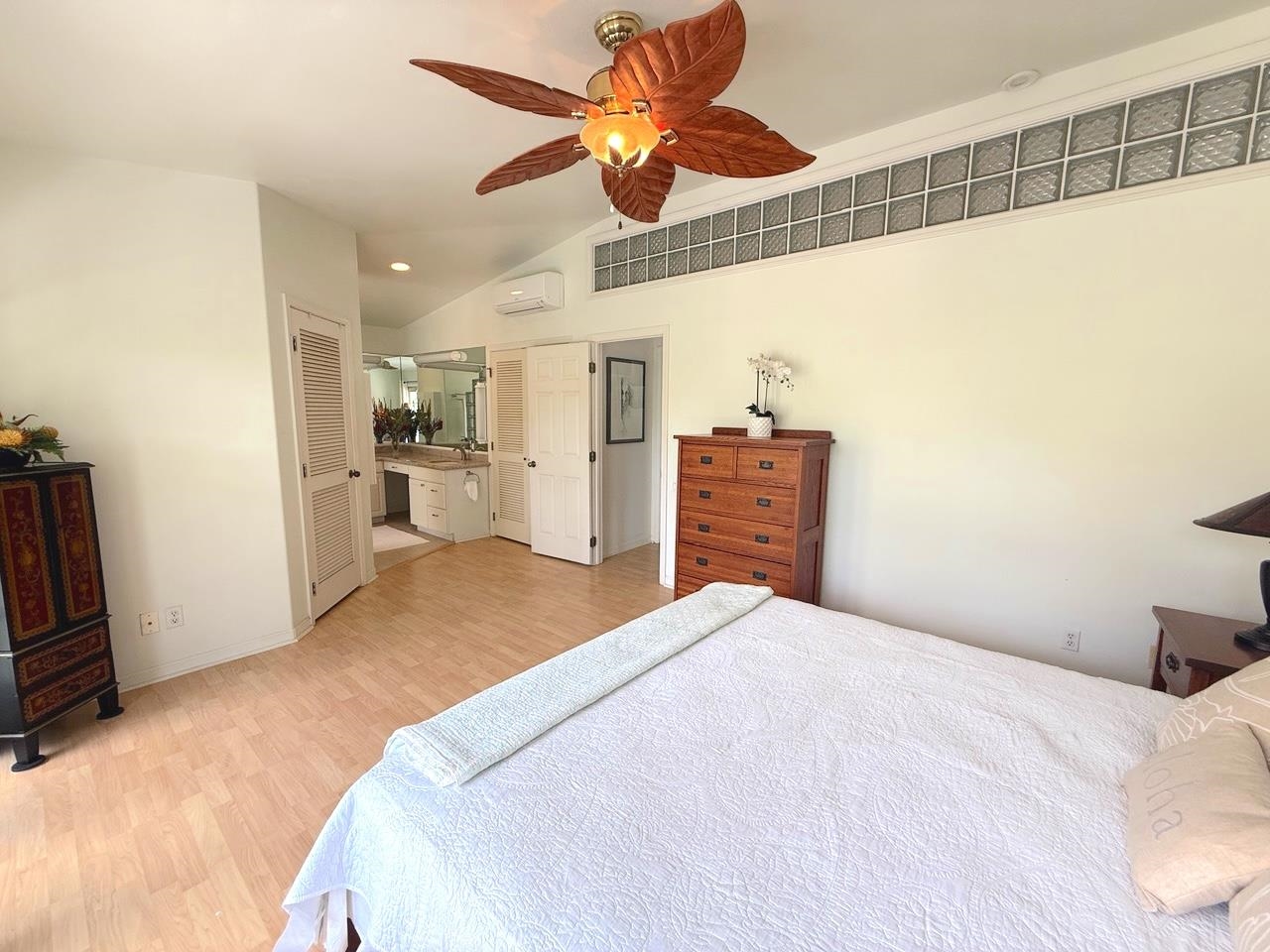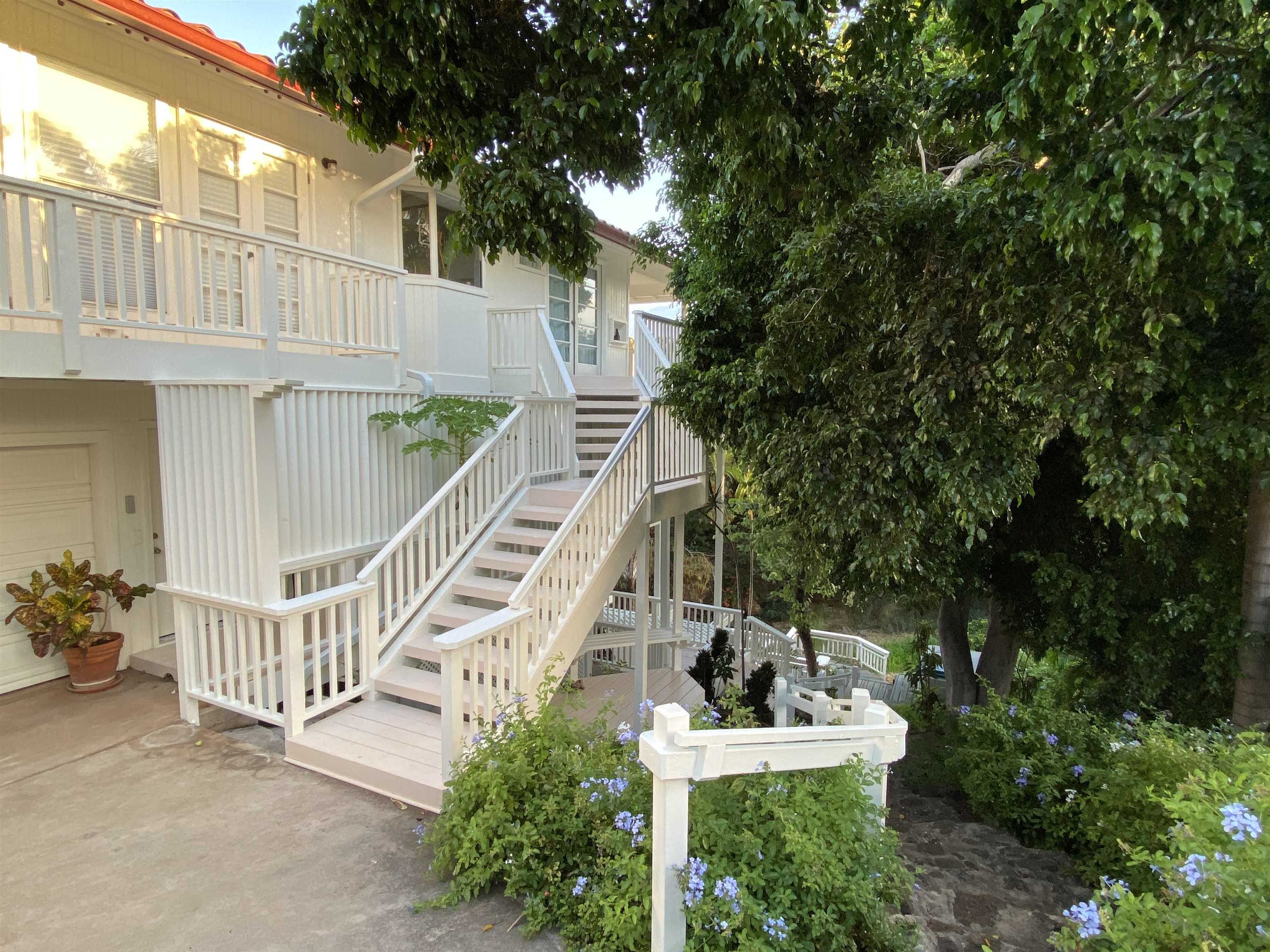 A 1bed/1bath 480 sq ft attached Ohana plus a 2 bed/2 bath 1,352 sq ft main dwelling unit add up to this very special 3 bed/3 bath 1,832 sq ft home. There are two covered lanais, one of 224 sq ft adjoins the main dwelling unit and another of 192 sq ft adjoins the Ohana. Additionally, a wide driveway fronts an oversize two car garage. All is set well off the street behind a lava rock wall and is surrounded by a tropical garden, making this ocean view home a rare find indeed! Surrounded by trees, this unique property resides in a peaceful park like setting, and is yet only minutes from the conveniences of town. Ficus, orchid, palm, lemon, orange, plumeria, papaya and more can be seen from the lanais and many windows throughout the home. The upstairs vaulted ceiling open floor plan boasts 3 recently installed mini-splits and is filled with natural light and island breezes. Step through the 8 French doors onto your expansive, private lanai that extends the entire living space out into an open natural landscape of trees, palms, flowering plants and ocean views. Rest here beneath outdoor lanai ceiling fans for your daily birdsong symphony and nightly sunsets. The large primary bedroom suite has its own balcony with french doors to capture cool evening breezes & Haleakala views. There is also a 2nd extra large bedroom plus a hall bath on this level. The attached ground level 1 bed/1 bath partially furnished Ohana features its own private entrance, a lovely tropical garden setting, a covered lanai, off street parking space, separate laundry area, and its own electric meter. The garage has extra work space and plenty of storage with additional storage under the house. Close to beaches, restaurants, shops, golf courses and more, it’s a spectacular combination of indoor/outdoor living among the treetops.