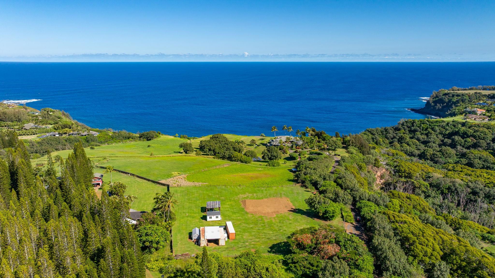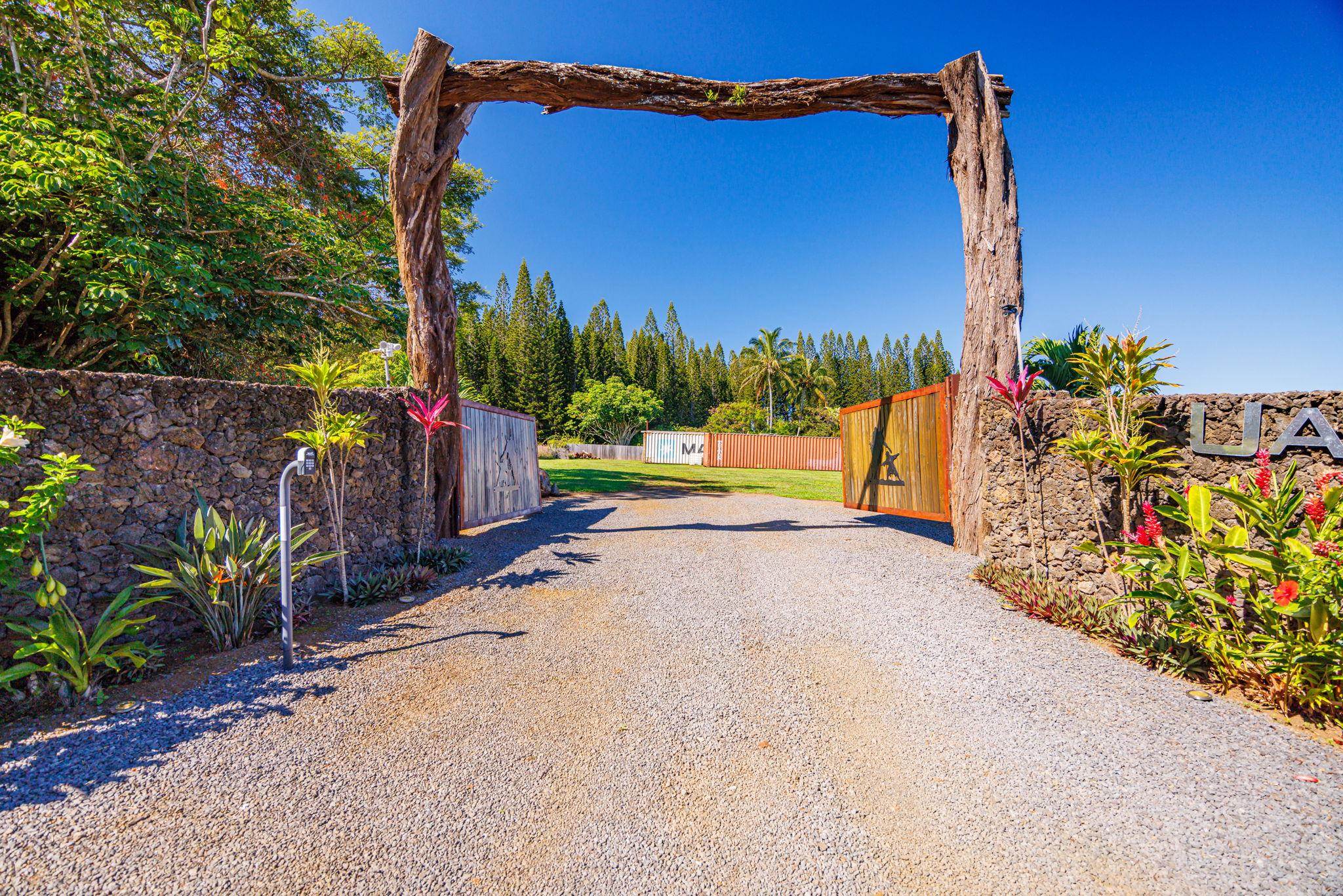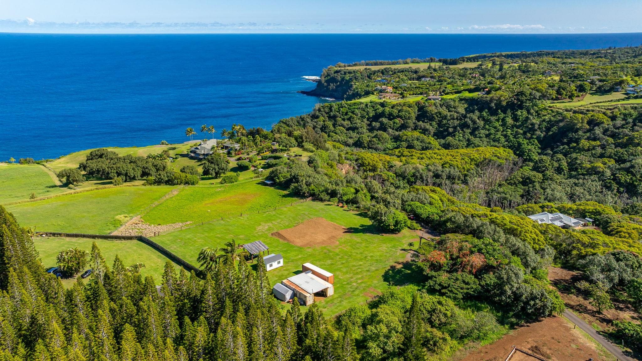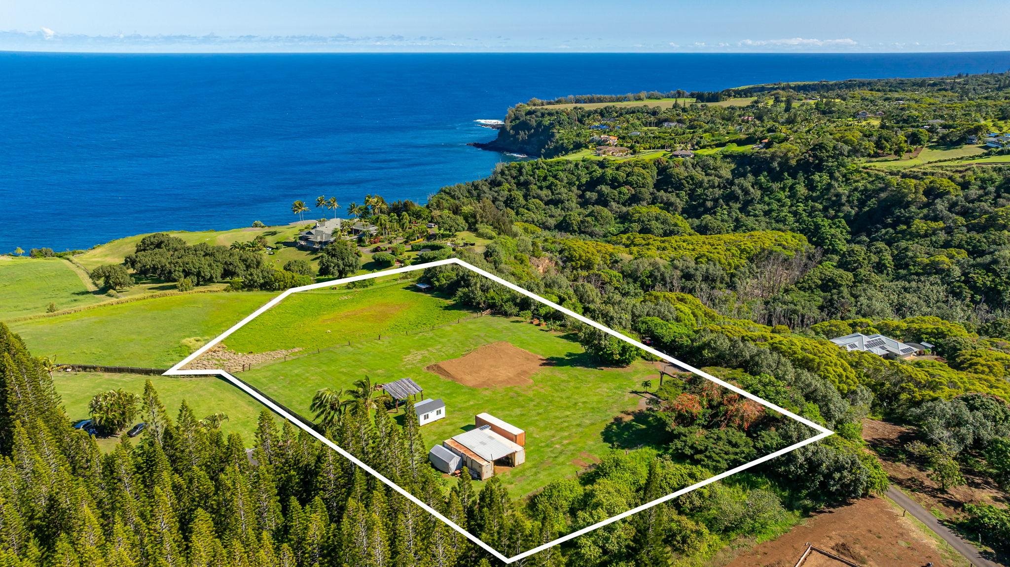 Rare 180° Ocean View Estate – Where the Ocean Meets the Mountain in One Extraordinary Vista Paradise. Experience Maui’s North Shore at its most magnificent. Uaoa Bay Ranch is a must see breathtaking 4.22-acre private estate offering sweeping ocean views spanning north, east, and west, with majestic Haleakala rising to the south. This ready to use sanctuary overlooks Uaoa Bay, has no HOA, located off a paved private road in the exclusive Manawai area just minutes from the legendary Pe‘ahi surf break and the charming towns of Ha‘iku and Paia–home to world-class beaches, eateries, shops, galleries, and more. A grand, newly designed and landscaped entrance welcomes you with lava rock walls, custom automatic double gates, framed by three 16-foot kiawe ranch logs each weighing over 4,000 lbs, that open to a palm-lined driveway leading to manicured lawns that gently slope toward the ocean. The entire property is fully cleared, kiawe fenced, and cross-fenced for agriculture, livestock, or hobby use, with two private gated entrances directly off the paved road. Enjoy an as-is tiny coastal haven unit with patio, outdoor shower, tankless water heater, utility sink, and small water catchment. Entertain under the new grand kiawe pergola, gather around the custom rock firepit with kiawe benches beneath starry Maui nights, or enjoy walking paths that showcase panoramic coastal views The land includes a new large livestock shelter with adjoining water catchment ideal for agriculture. Guava, citrus, banana, avocado, and papaya trees enhance the landscape alongside custom raised garden beds, trellises, and dragon fruit supports. Mature hardwoods, Cook pines, and coconut palms border the property, providing both privacy and natural wind protection. Design and build with confidence– CPR Unit B previously approved but now inactive permits allowed for a 2BD/2BA cottage, plus covered outdoor space and an additional garage, shop and bathroom, or create your own design under current Maui County rules, a larger cottage is permissible. Saving time and expense soil has been brought in for the house pad. The parcel features underground utilities, electrical vault, a previously approved well, private paved-road, no HOA, and CPR language preserving unobstructed ocean views. The property overlooks Uaoa Bay and offers neighborhood access to the Manawai trail and waterfall.