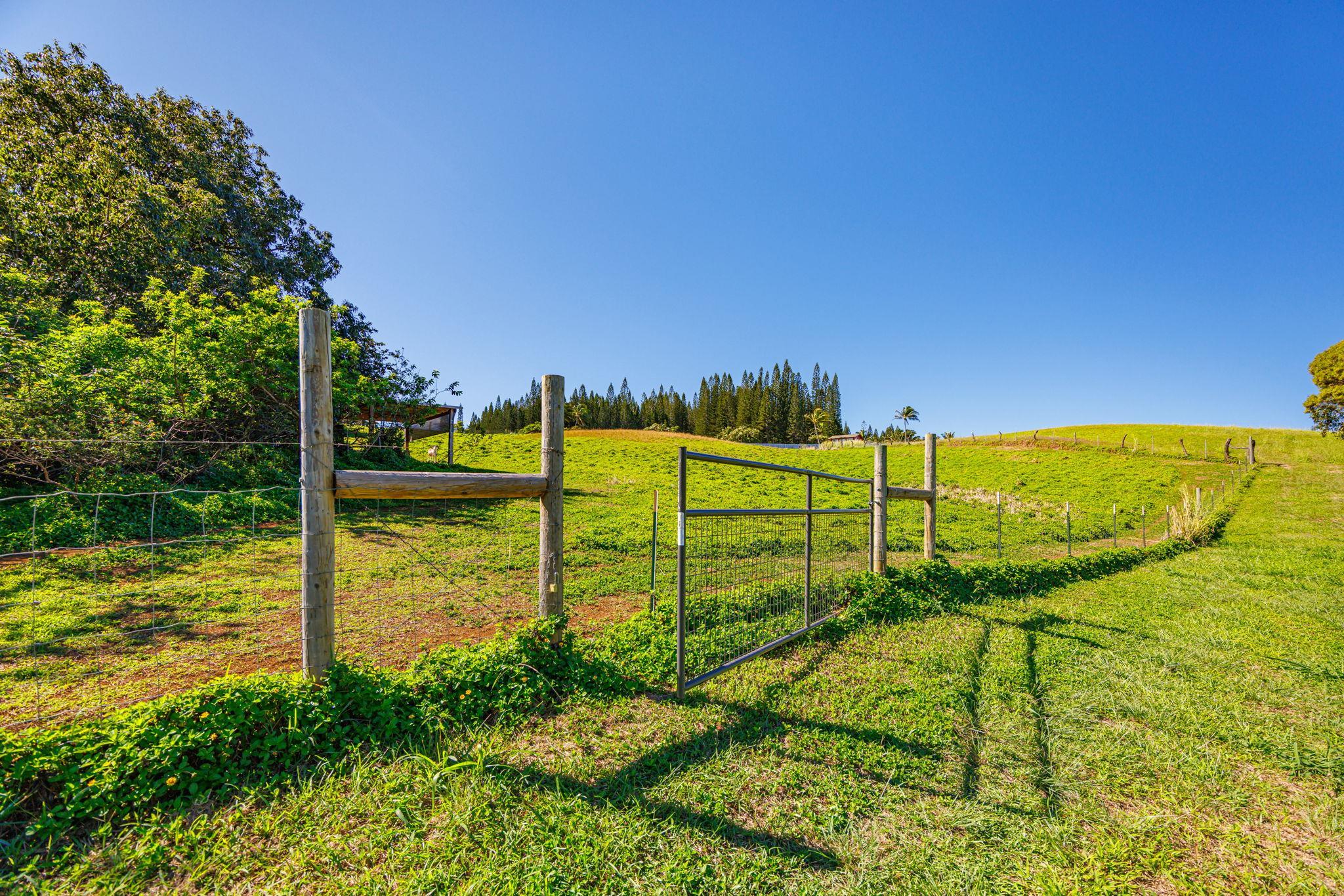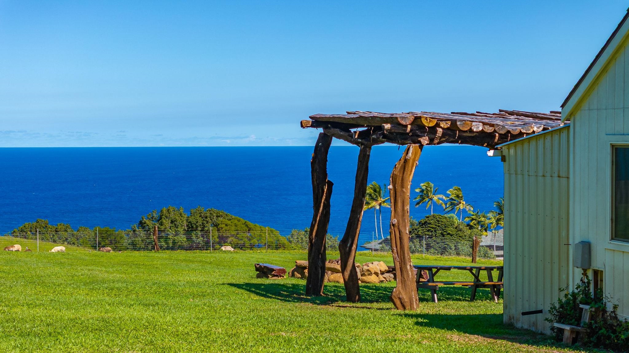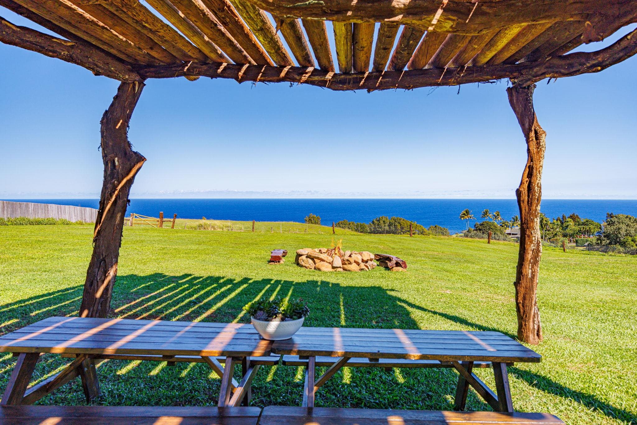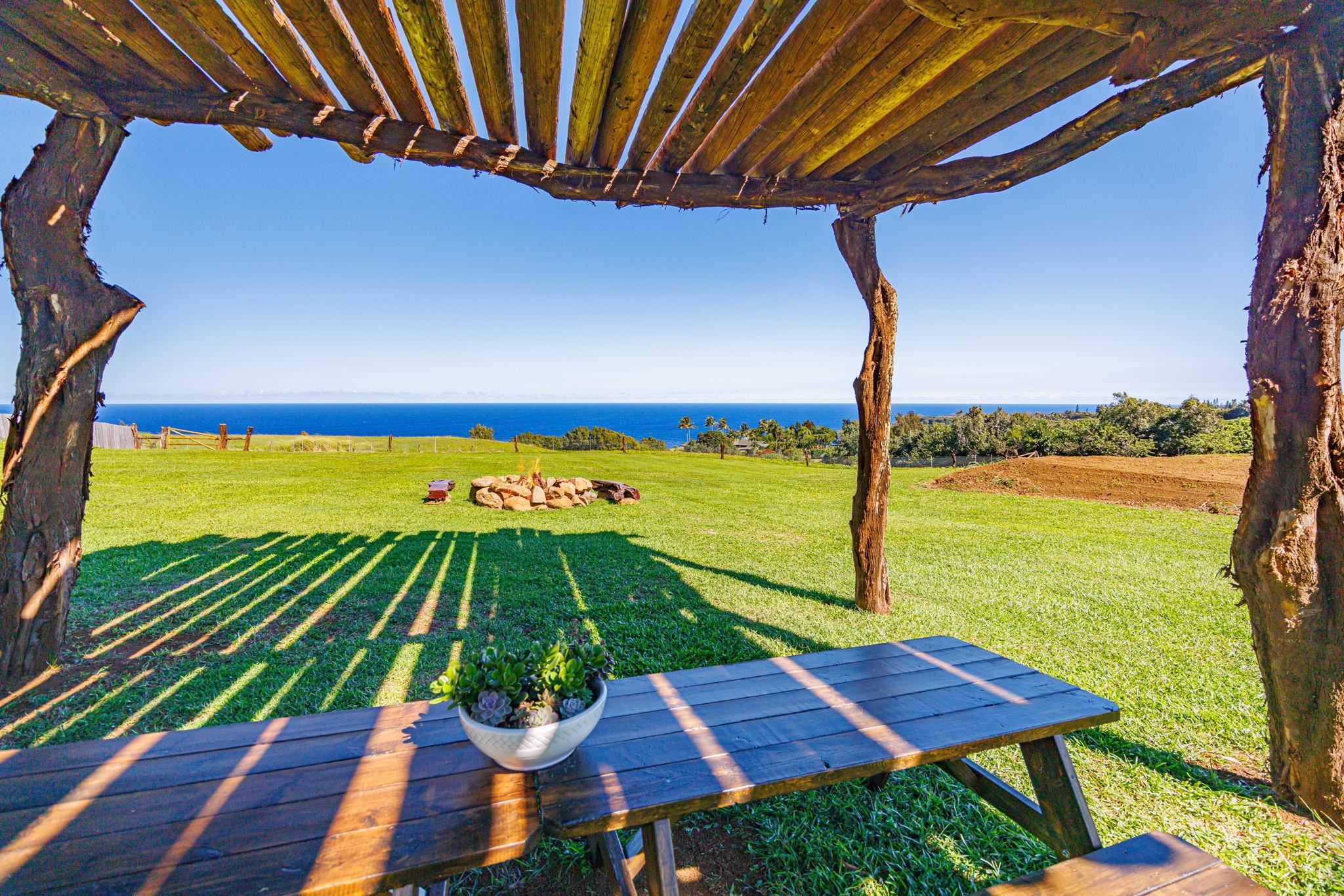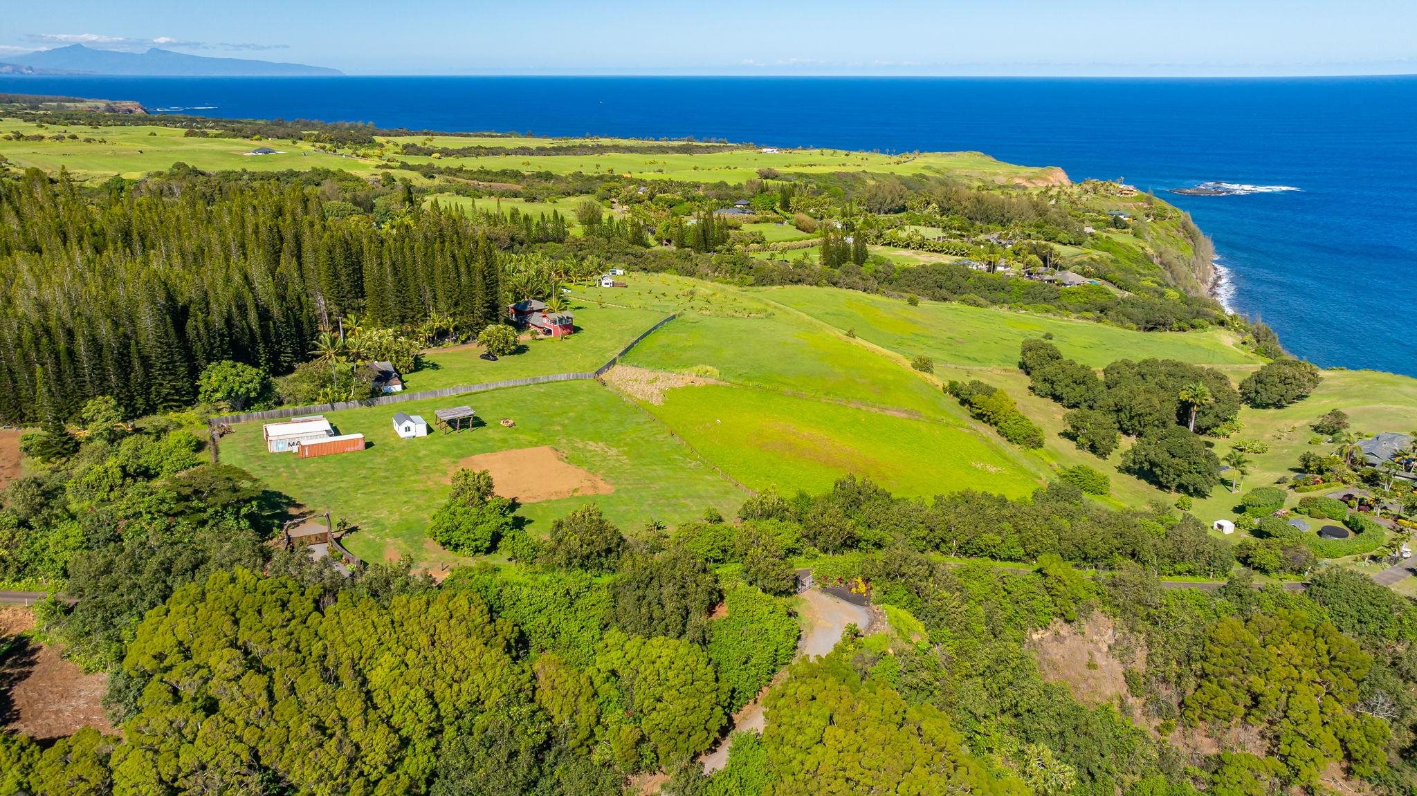 Rare 180° Ocean View Estate – Where the Ocean Meets the Mountain in One Extraordinary Vista Paradise. Experience Maui’s North Shore at its most magnificent. Uaoa Bay Ranch is a must see breathtaking 4.22-acre private estate offering sweeping ocean views spanning north, east, and west, with majestic Haleakala rising to the south. This ready to use sanctuary overlooks Uaoa Bay, has no HOA, located off a paved private road in the exclusive Manawai area just minutes from the legendary Pe‘ahi surf break and the charming towns of Ha‘iku and Paia–home to world-class beaches, eateries, shops, galleries, and more. A grand, newly designed and landscaped entrance welcomes you with lava rock walls, custom automatic double gates, framed by three 16-foot kiawe ranch logs each weighing over 4,000 lbs, that open to a palm-lined driveway leading to manicured lawns that gently slope toward the ocean. The entire property is fully cleared, kiawe fenced, and cross-fenced for agriculture, livestock, or hobby use, with two private gated entrances directly off the paved road. Enjoy an as-is tiny coastal haven unit with patio, outdoor shower, tankless water heater, utility sink, and small water catchment. Entertain under the new grand kiawe pergola, gather around the custom rock firepit with kiawe benches beneath starry Maui nights, or enjoy walking paths that showcase panoramic coastal views The land includes a new large livestock shelter with adjoining water catchment ideal for agriculture. Guava, citrus, banana, avocado, and papaya trees enhance the landscape alongside custom raised garden beds, trellises, and dragon fruit supports. Mature hardwoods, Cook pines, and coconut palms border the property, providing both privacy and natural wind protection. Design and build with confidence– CPR Unit B previously approved but now inactive permits allowed for a 2BD/2BA cottage, plus covered outdoor space and an additional garage, shop and bathroom, or create your own design under current Maui County rules, a larger cottage is permissible. Saving time and expense soil has been brought in for the house pad. The parcel features underground utilities, electrical vault, a previously approved well, private paved-road, no HOA, and CPR language preserving unobstructed ocean views. The property overlooks Uaoa Bay and offers neighborhood access to the Manawai trail and waterfall.